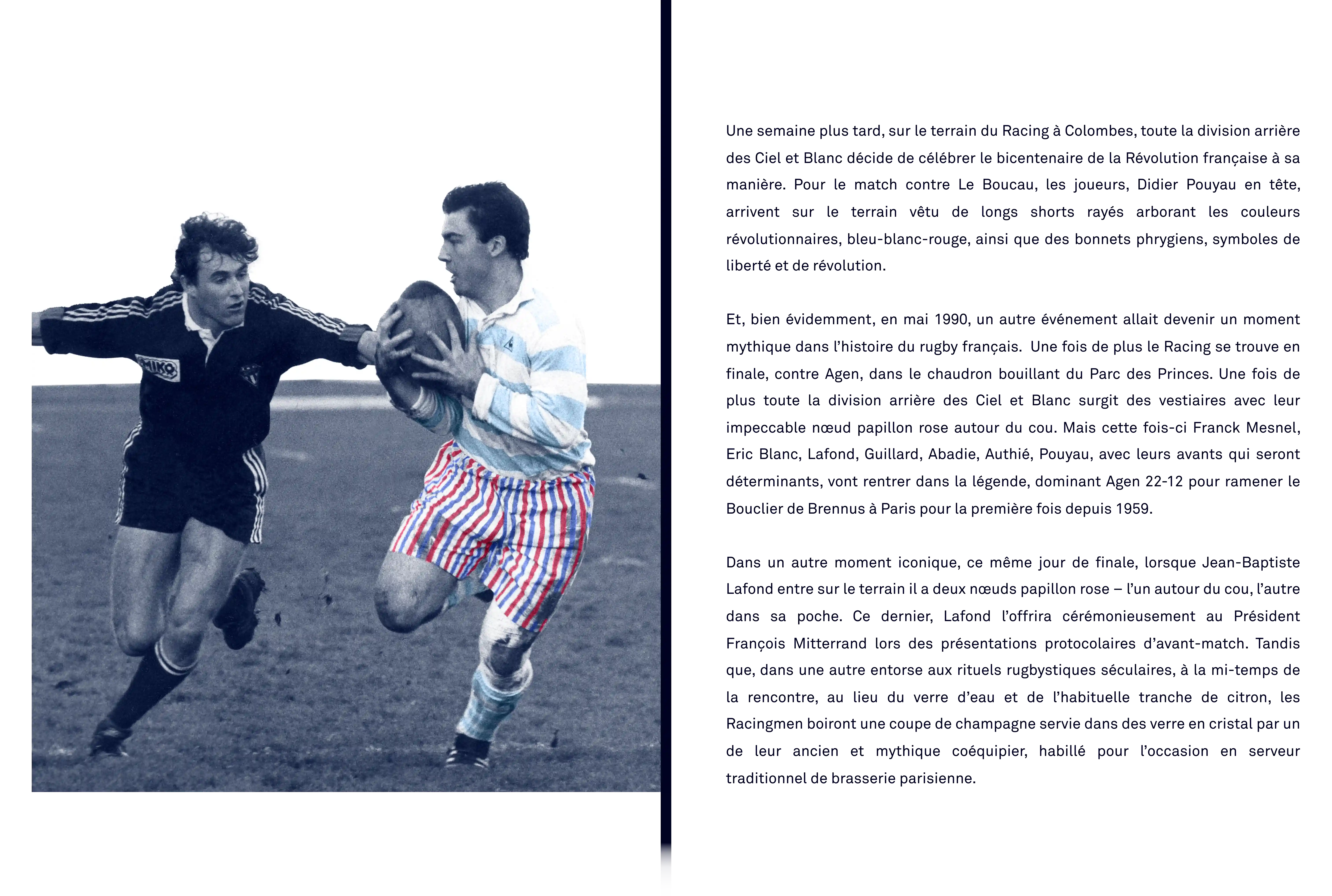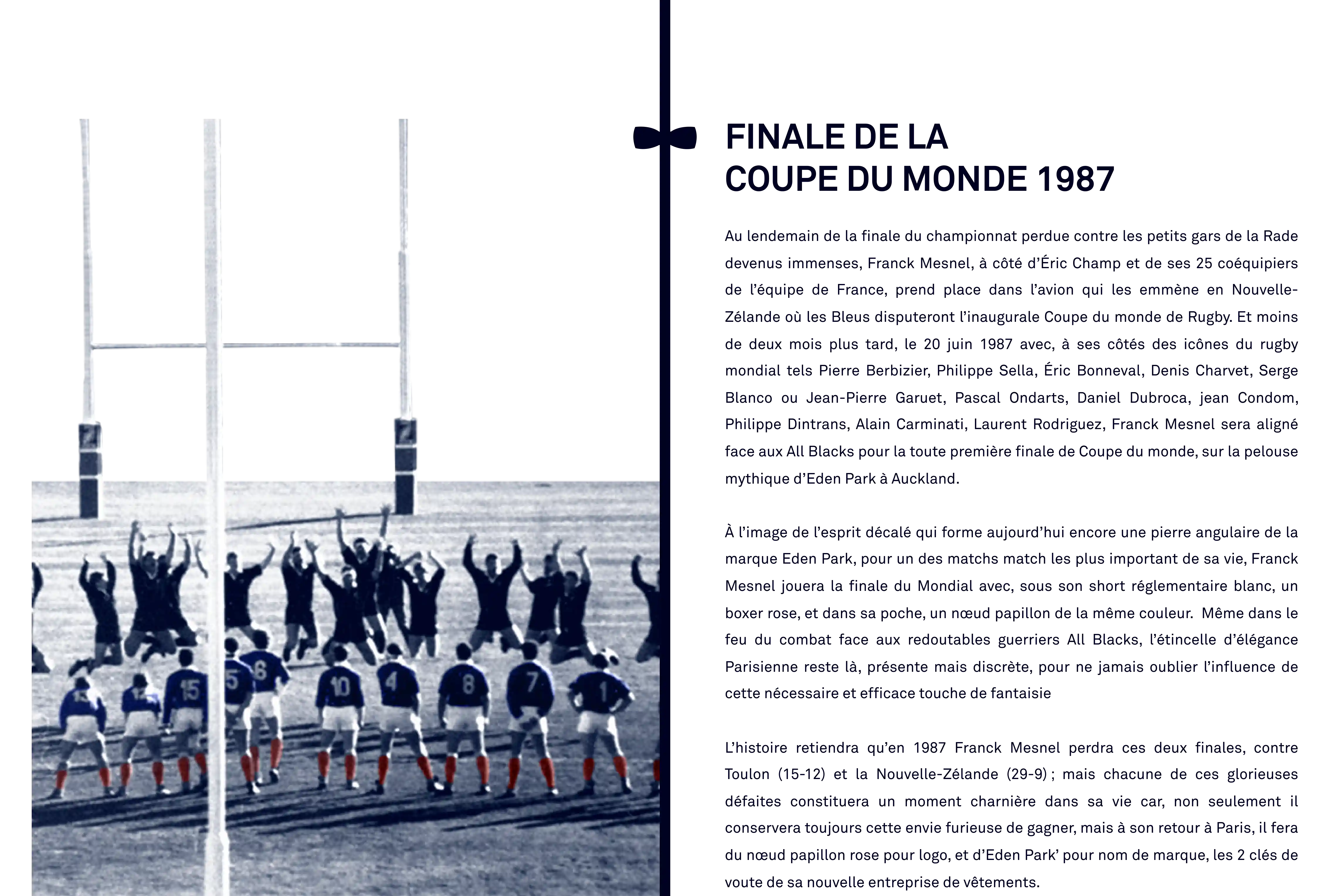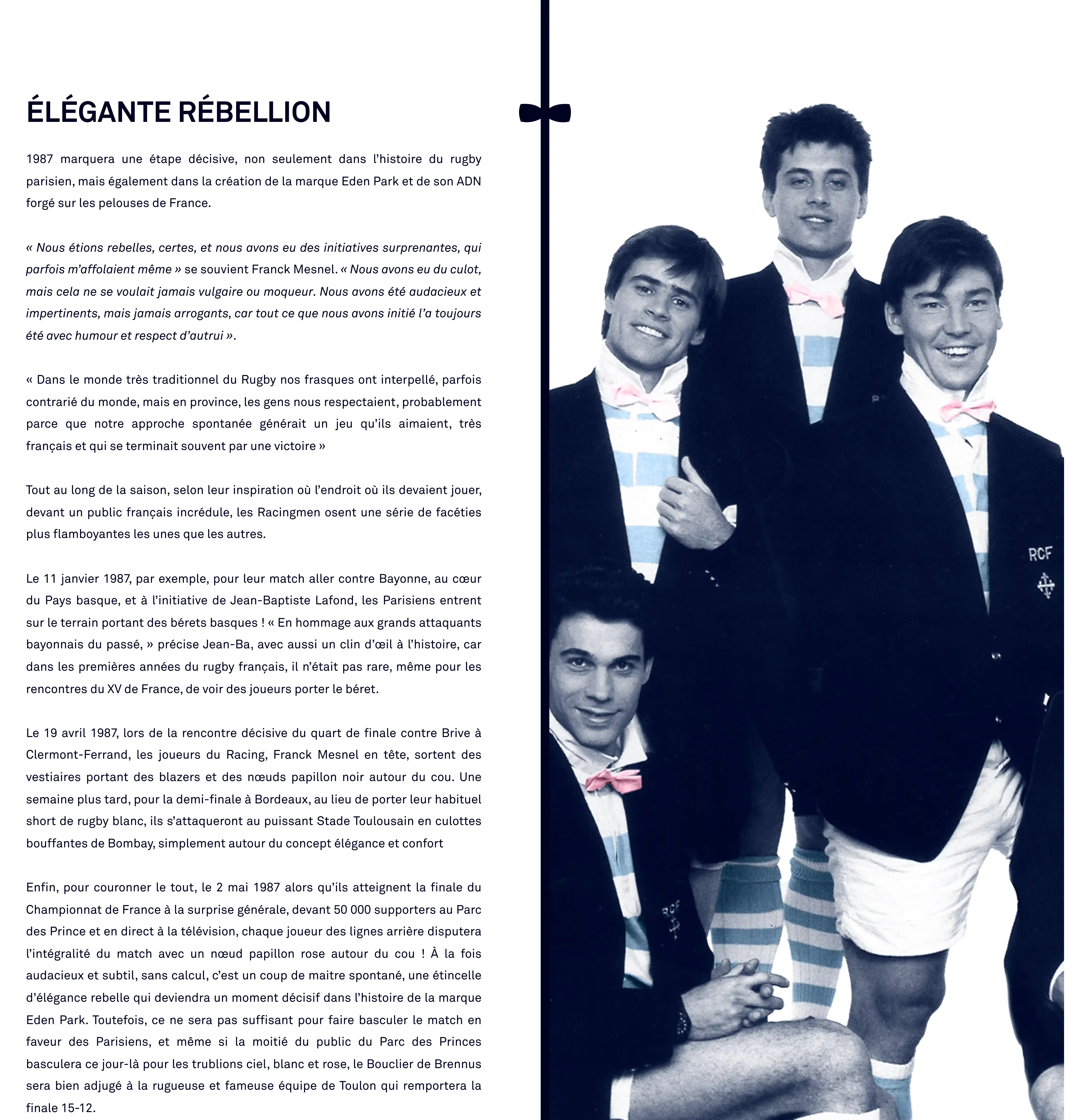 Et la couleur rose dans tout ça ? Devenue la couleur emblématique de la marque Eden Park, et le logo reconnaissable aujourd’hui à travers le monde, l’idée du nœud-pap rose est survenue lors d’un dîner des joueurs du Racing quelques jours avant la finale 1987. Dans leur style impertinent et décontracté, Franck Mesnel et ses amis cherchaient quelque chose qui pourrait être le symbole « d’une soirée exceptionnelle, peut-être unique et classieuse. »