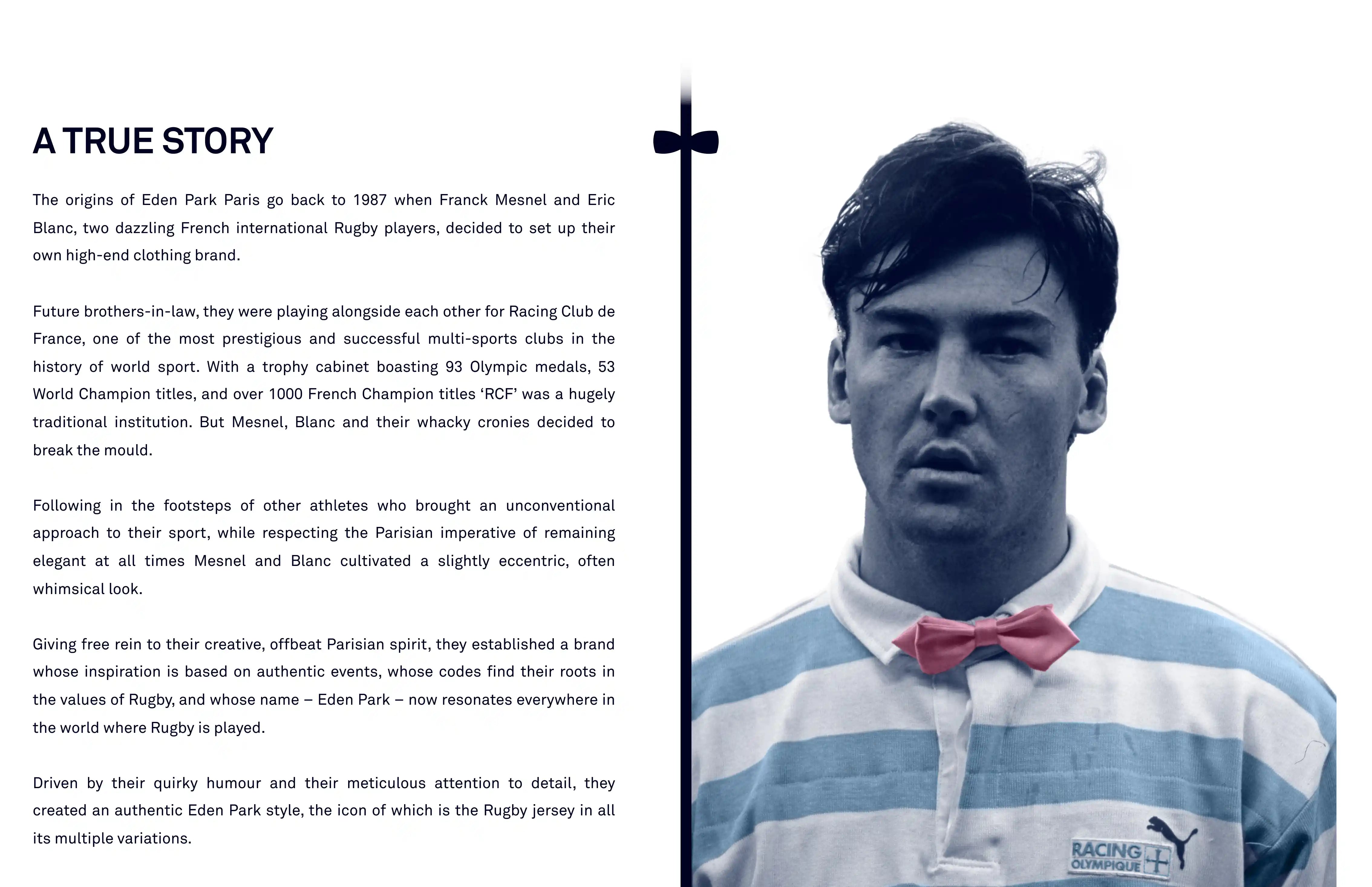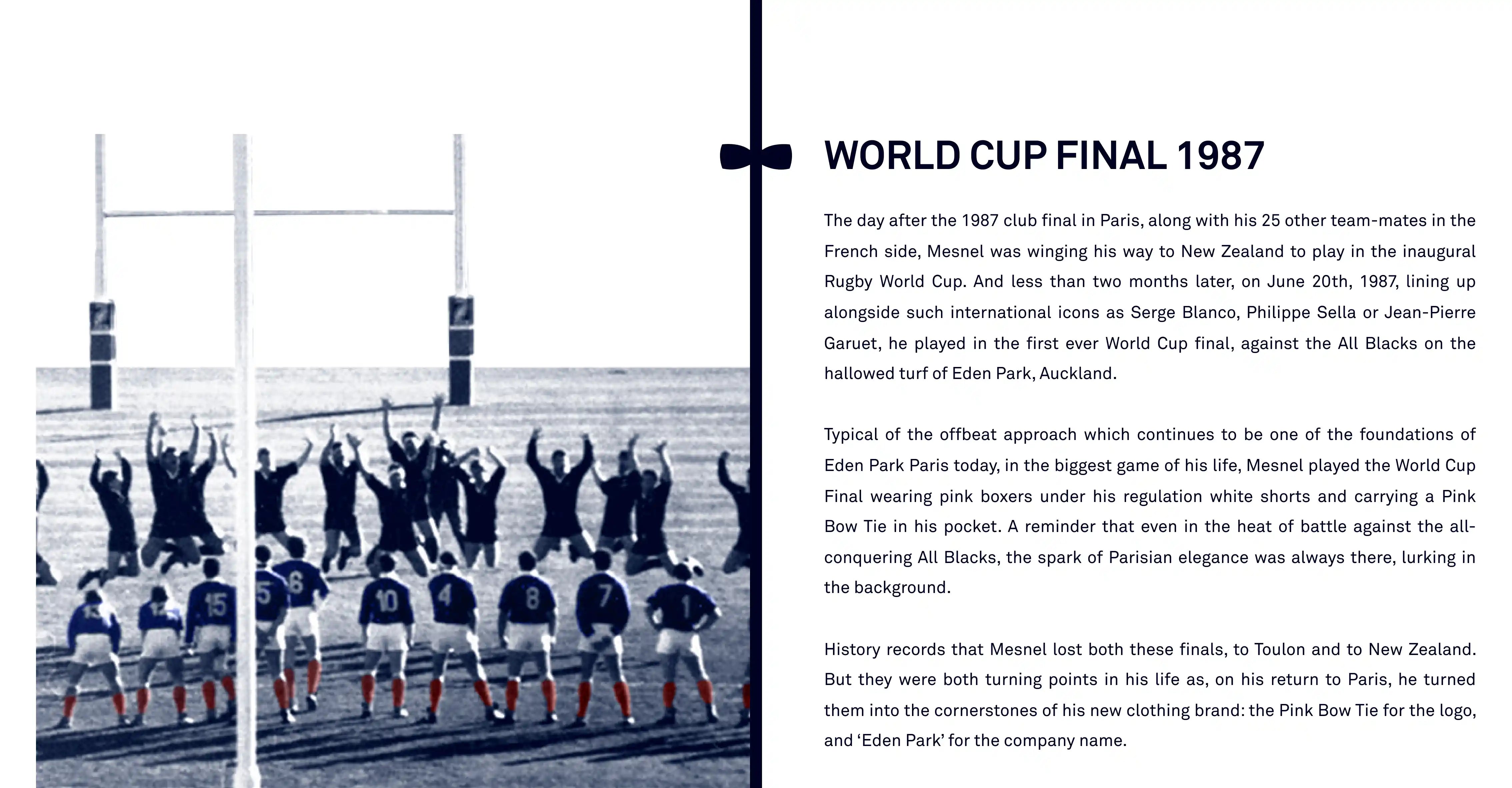 Eden Park. The name itself, as we shall see, is synonymous with the game of Rugby. But over the past 37 years, the brand of clothing, and its iconic Pink Bow Tie logo have also become synonymous with a certain style. Stylish but never stuffy, chic but always comfortable, respectful of tradition, but always pushing the boundaries of innovation. In France it’s known as the Eden Park look, an uncompromising search for elegance and meticulous attention to detail. Combined with high-quality ethically sourced fabrics, the brand boasts a unique fusion of contemporary Parisian chic with Eden Park’s own authentic, and unmistakable, identity.