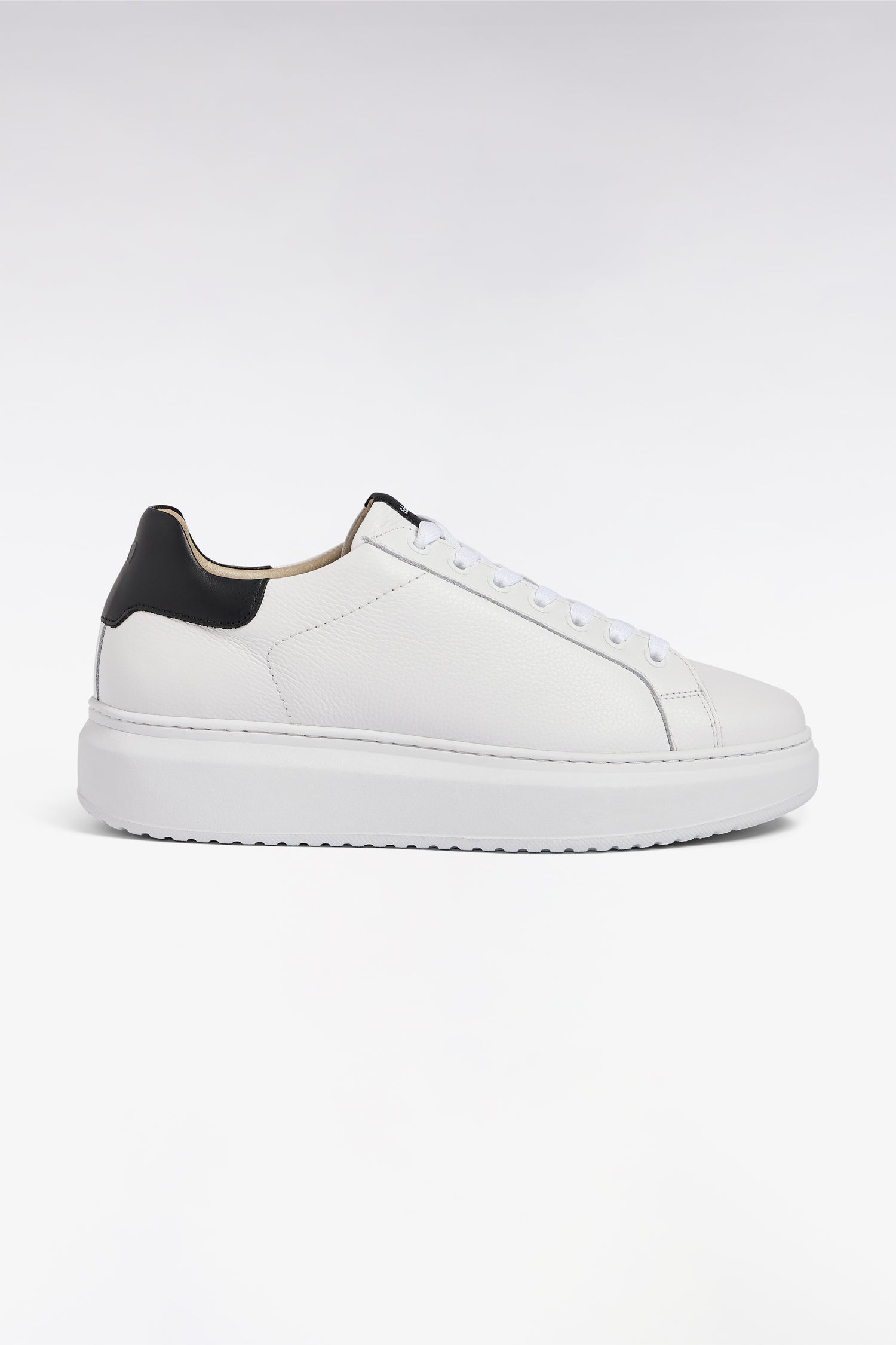 These two-tone low-top sneakers are ideal for adding a graphic, elegant touch to an everyday silhouette. White or navy grained leather is combined with an embossed back tongue, black for the white model and tone-on-tone in navy. With their white soles and discreet Eden Park embossing combined with neat perforation, these sneakers are sure to perfect your look.
