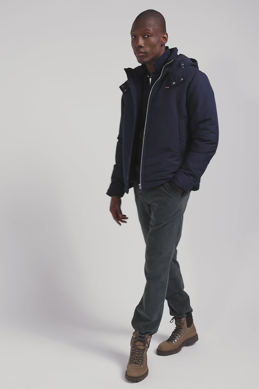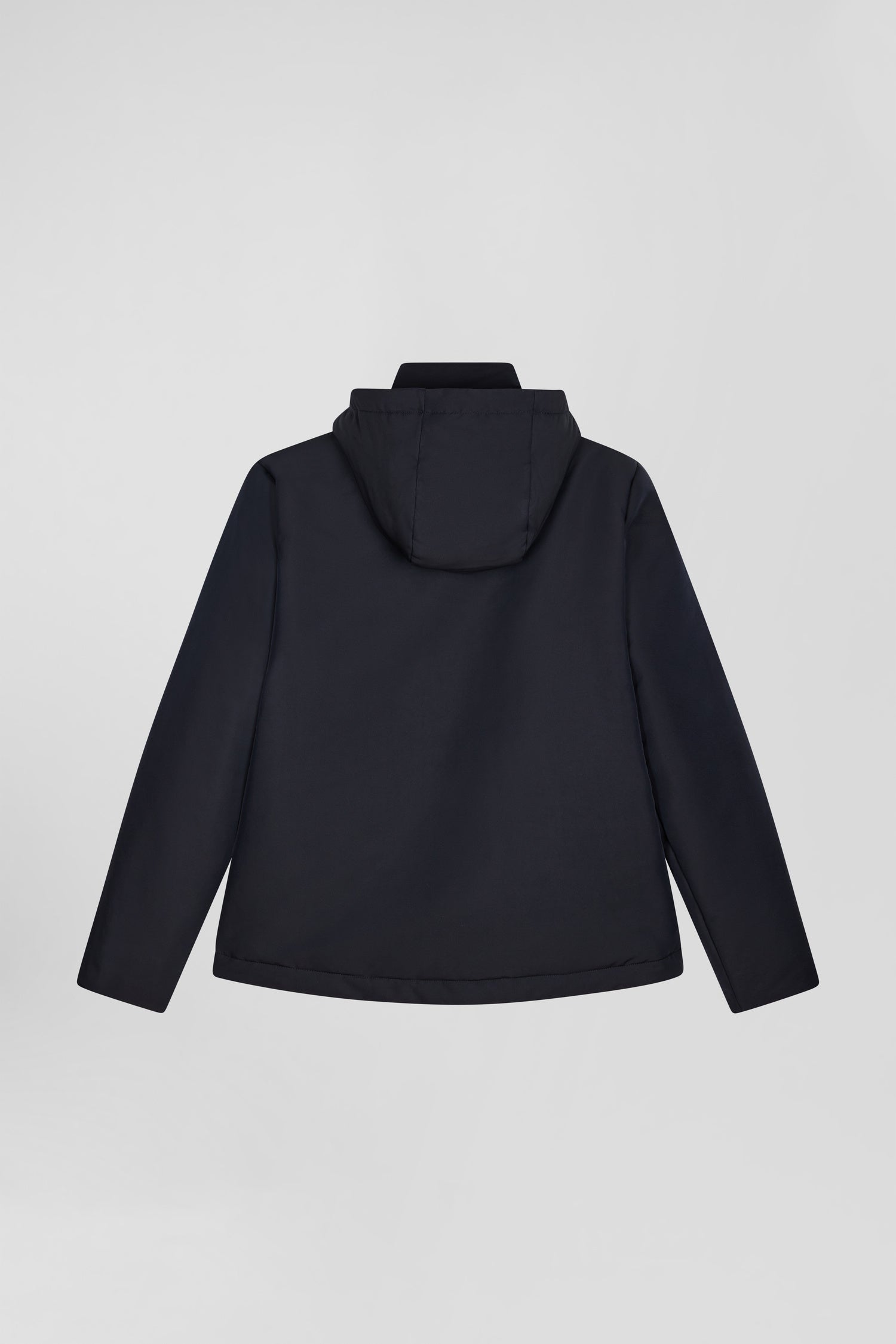 Discover the perfect blend of functionality and style with this peach-skin-touch nylon jacket. Complete with a fixed snap-fastening hood and plain nylon lining, this men's jacket offers comfort and protection. Its signature two-way zip and piped pockets combine with two zipped inside pockets for maximum practicality. The sleeves are trimmed with knitted ribbing.
