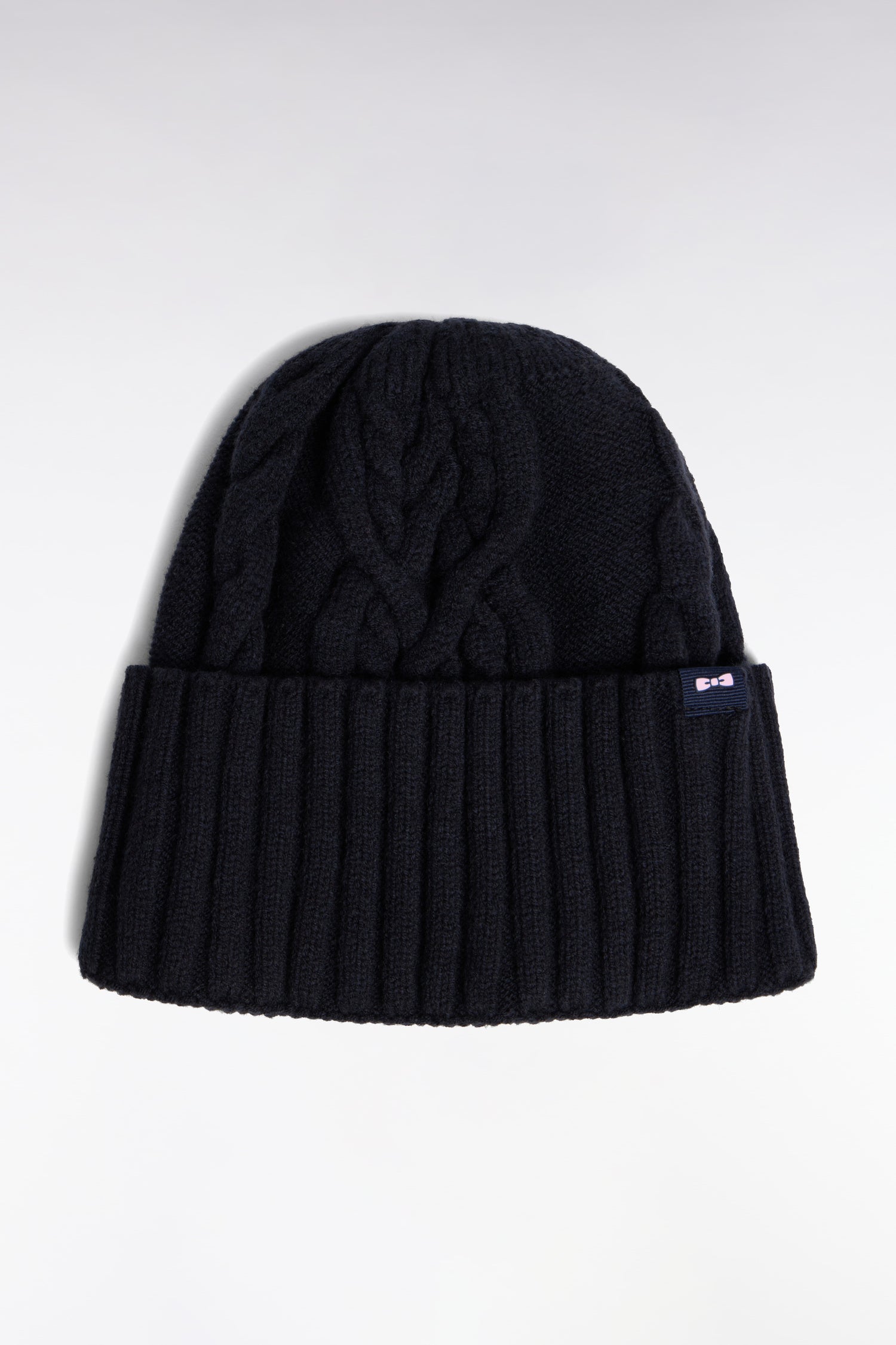With its delicately embossed twisted knit, this beanie combines warmth and authenticity. Knitted in cotton blend, it is available in ecru or navy to suit all styles. Its knitted lapel is discreetly embellished with our fashion house emblem: the pink bow tie.