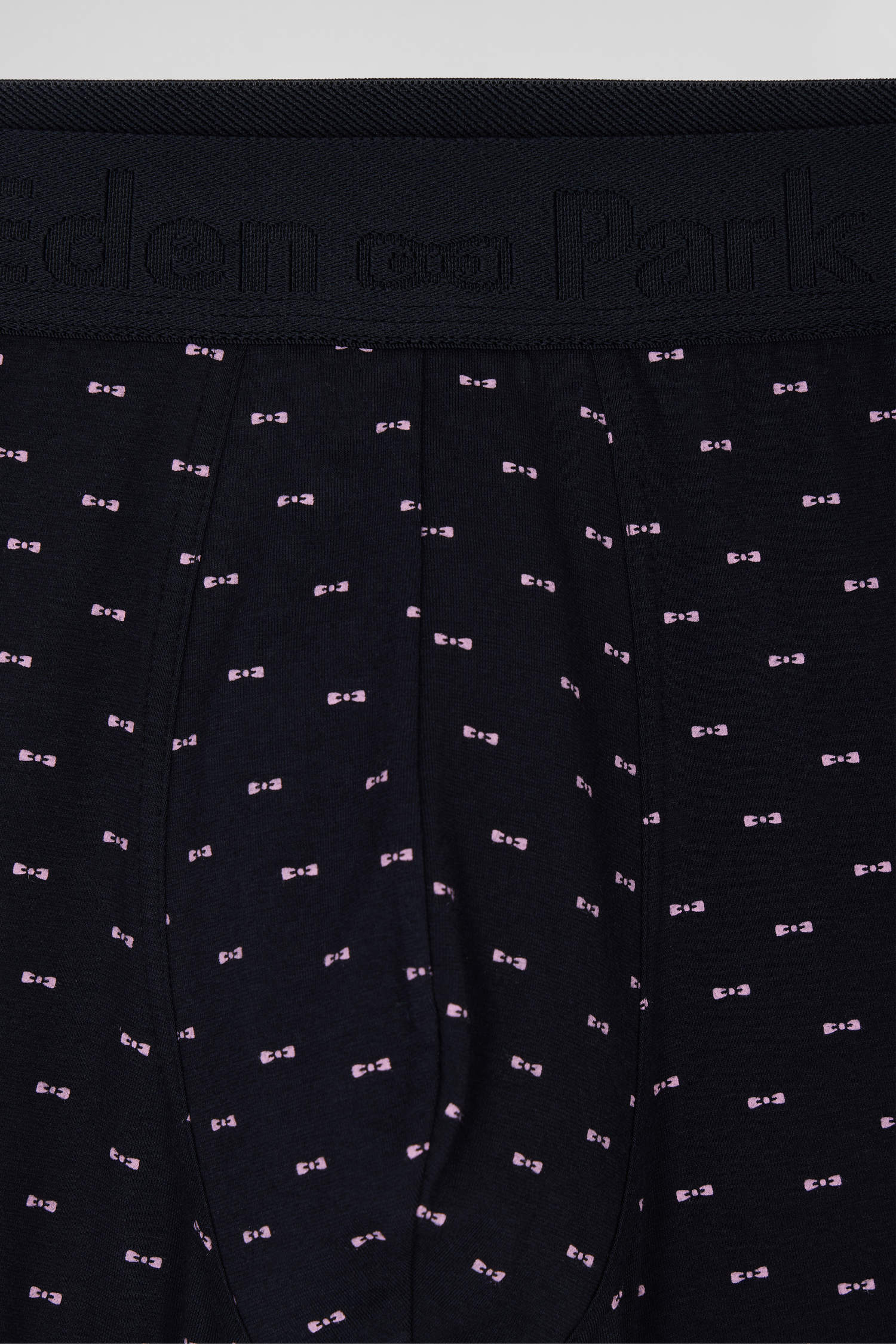 Navy blue and pink stretch cotton boxers with micro bow tie pattern