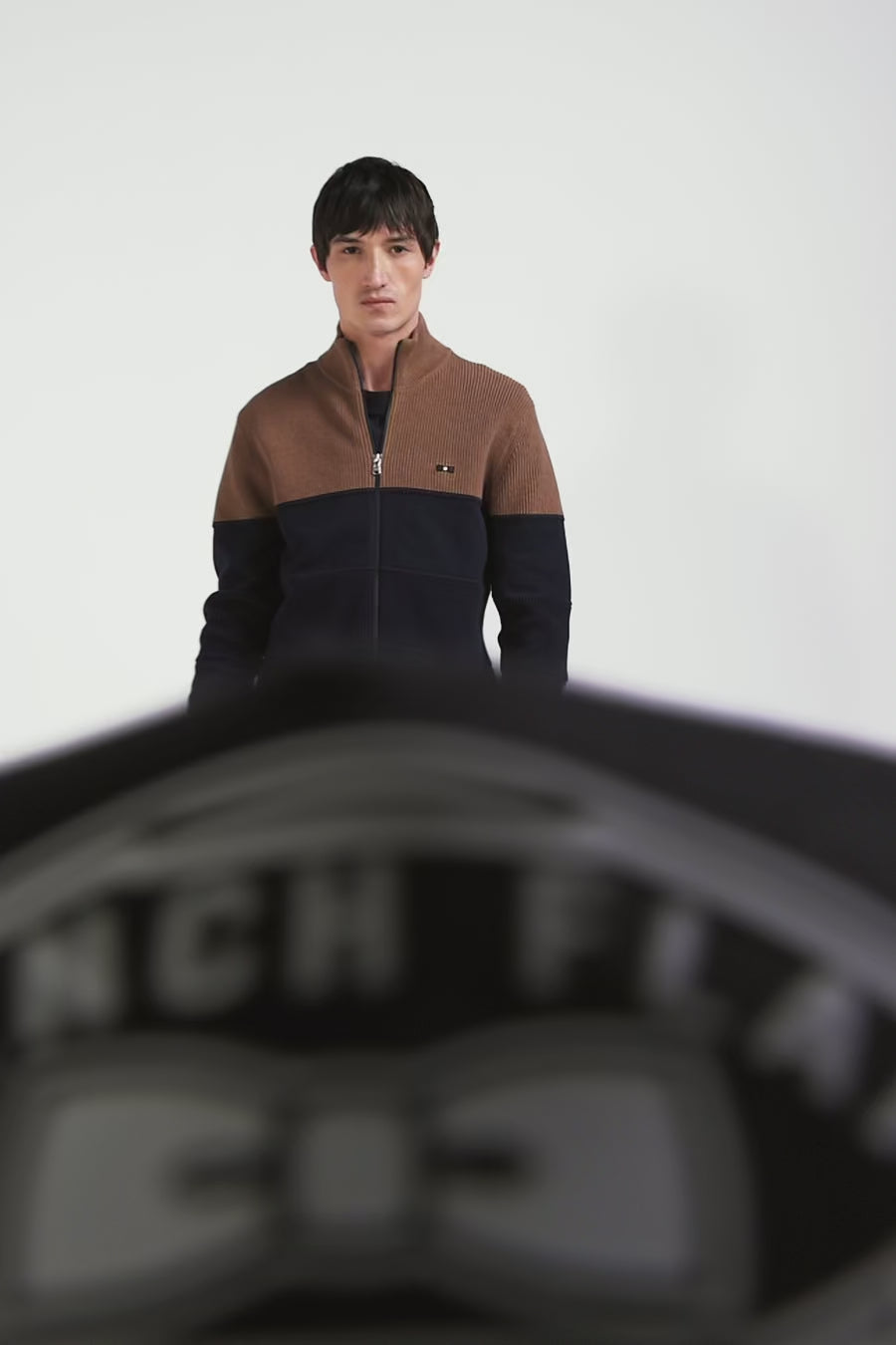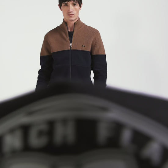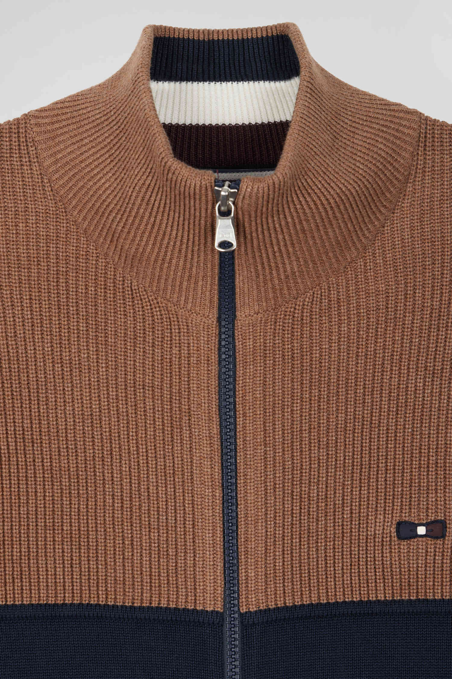 Navy and hazelnut cotton cardigan with zip and stand-up collar