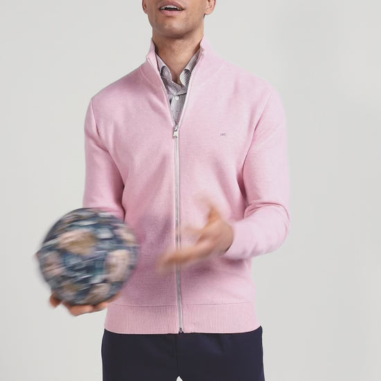 Regular plain pink cotton high collar zipped cardigan
