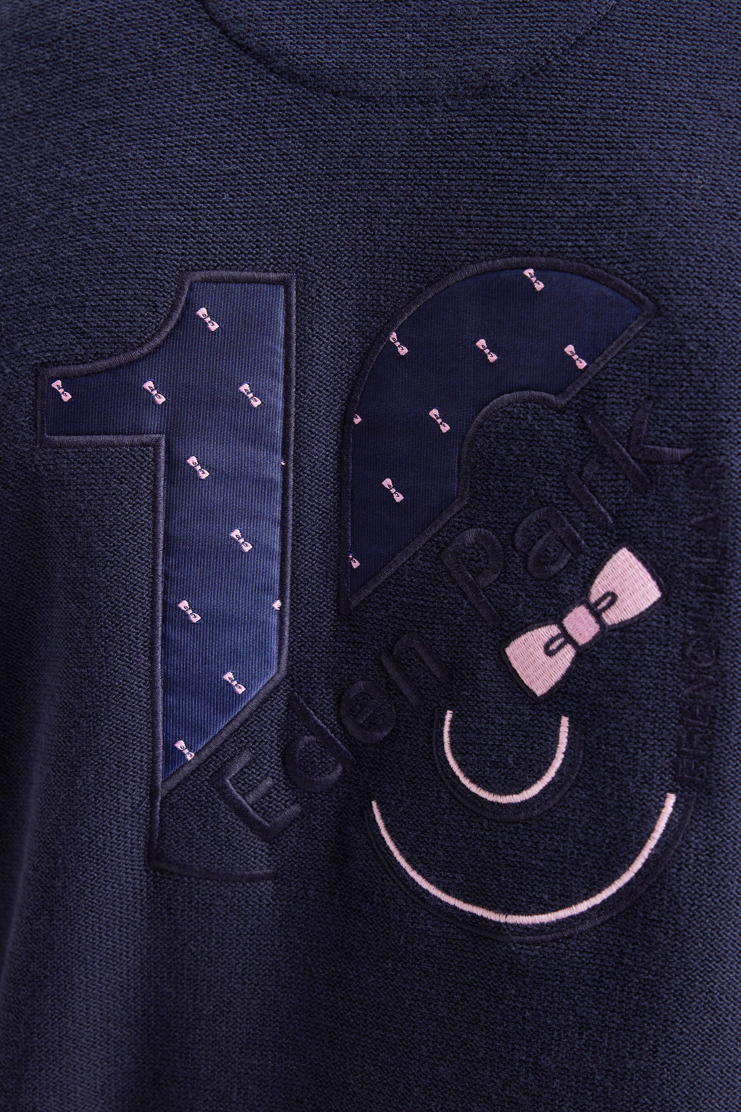 Rugby in spirit, refinement in attitude: Eden Park has left its mark on the landscape of men's fashion with a unique, ever-recognizable line. With its wide pink rugby jersey-style stripes, this navy blue stand-up collar zipped cardigan revisits the Eden Park wardrobe in an assumed sport-chic version. Made in knitted cotton, it plays on contrasts with its sleeves hooped in a different stitch and its elegantly colored collar interior. Pink bowtie embroidery on the chest marks this iconic piece, revealing embroidery in the house's codes on the back.