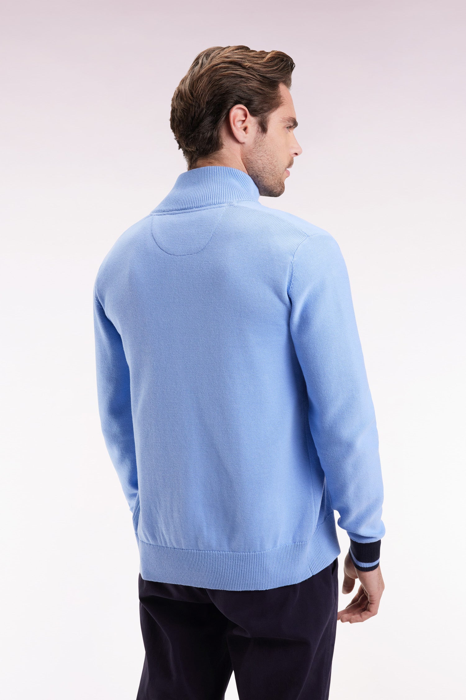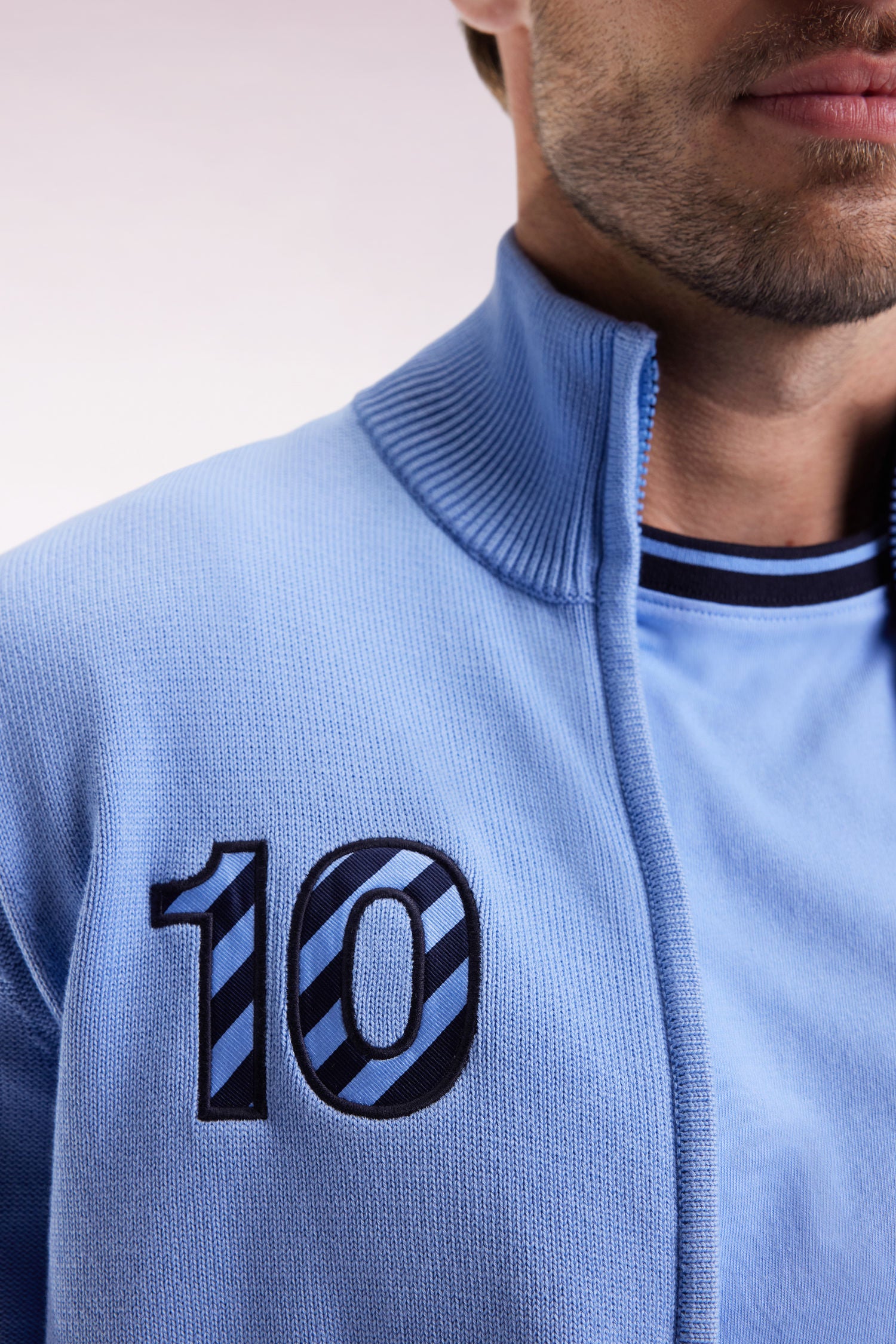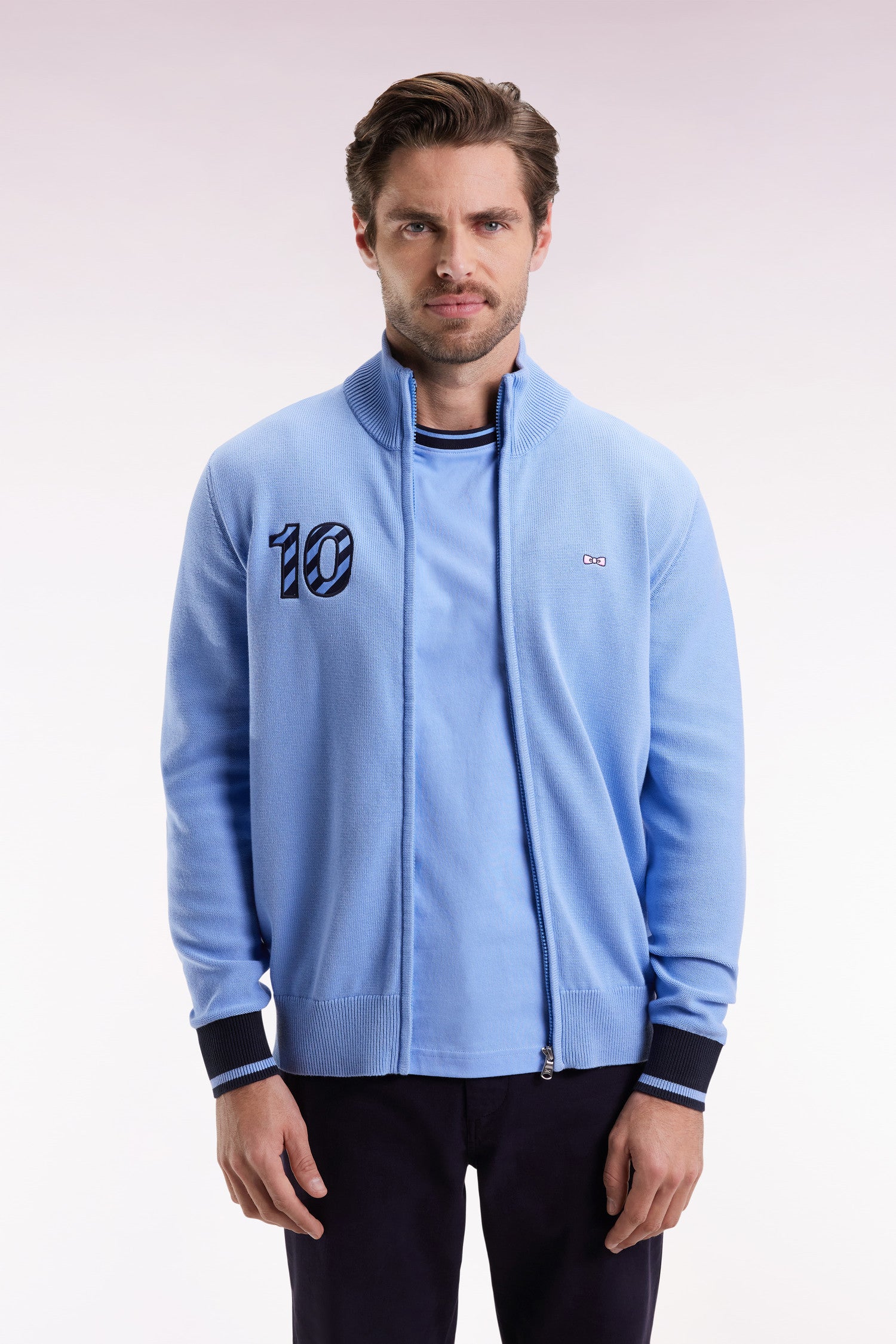 This zip-up cardigan with stand-up collar asserts its sporty-chic character through its play of textures between jersey stitch and jersey reverse. Its ribbed sleeves and 10-point embroidery, enhanced by an application of tie fabric, add a discreet graphic touch. A comfortable, well-cared-for piece designed to give rhythm to everyday silhouettes.
