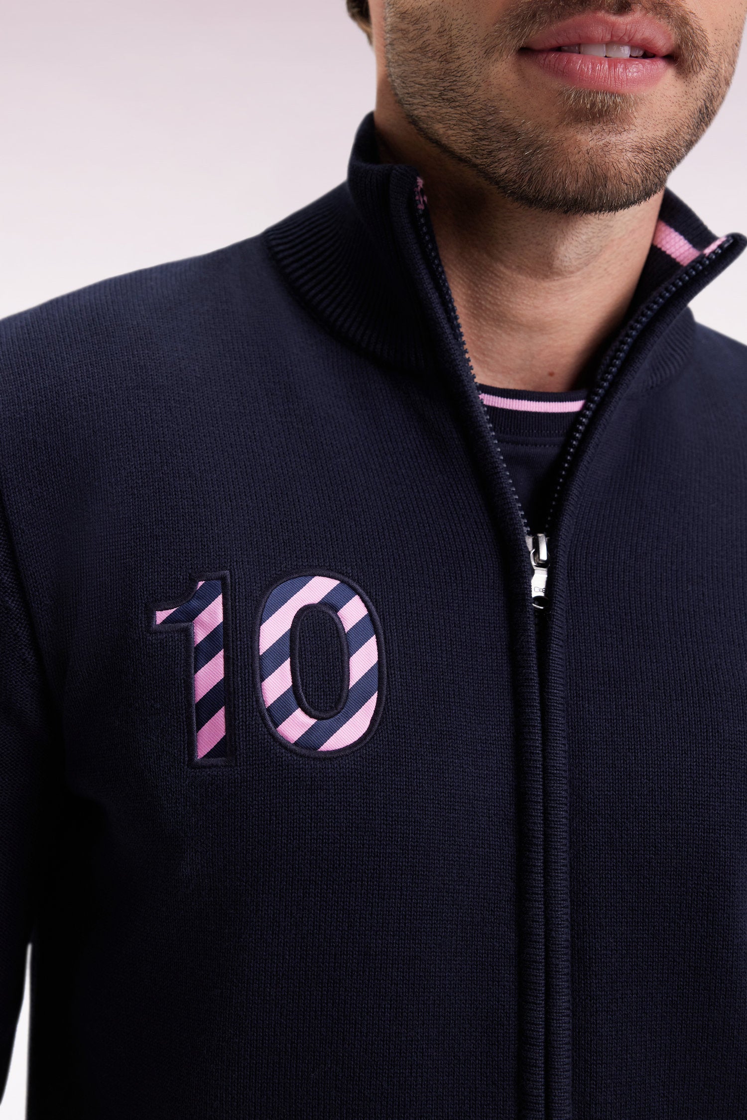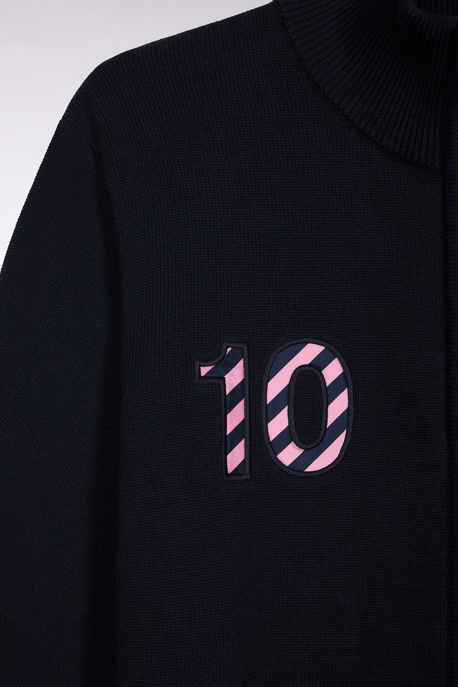 This zip-up cardigan with stand-up collar asserts its sporty-chic character through its play of textures between jersey stitch and jersey reverse. Its ribbed sleeves and 10-point embroidery, enhanced by an application of tie fabric, add a discreet graphic touch. A comfortable, well-cared-for piece designed to give rhythm to everyday silhouettes.