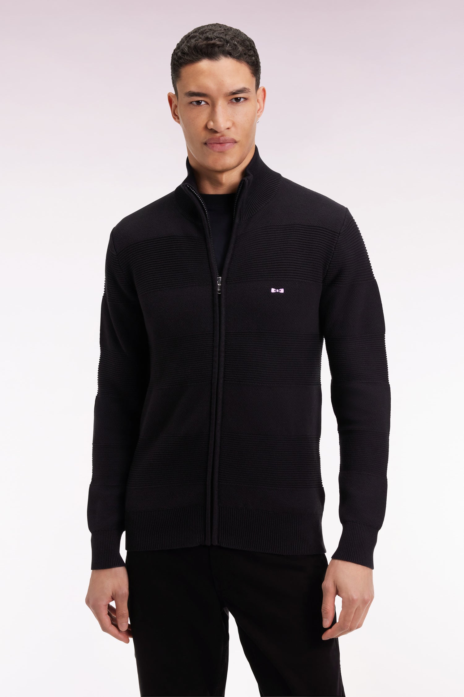 This zipped cardigan in knitted cotton seduces with its play of stitches that create a trompe-l'œil effect of rugby stripes. The high collar and chest embroidery underline Eden Park's attention to detail. This trucker-collar cardigan is available in our signature colors