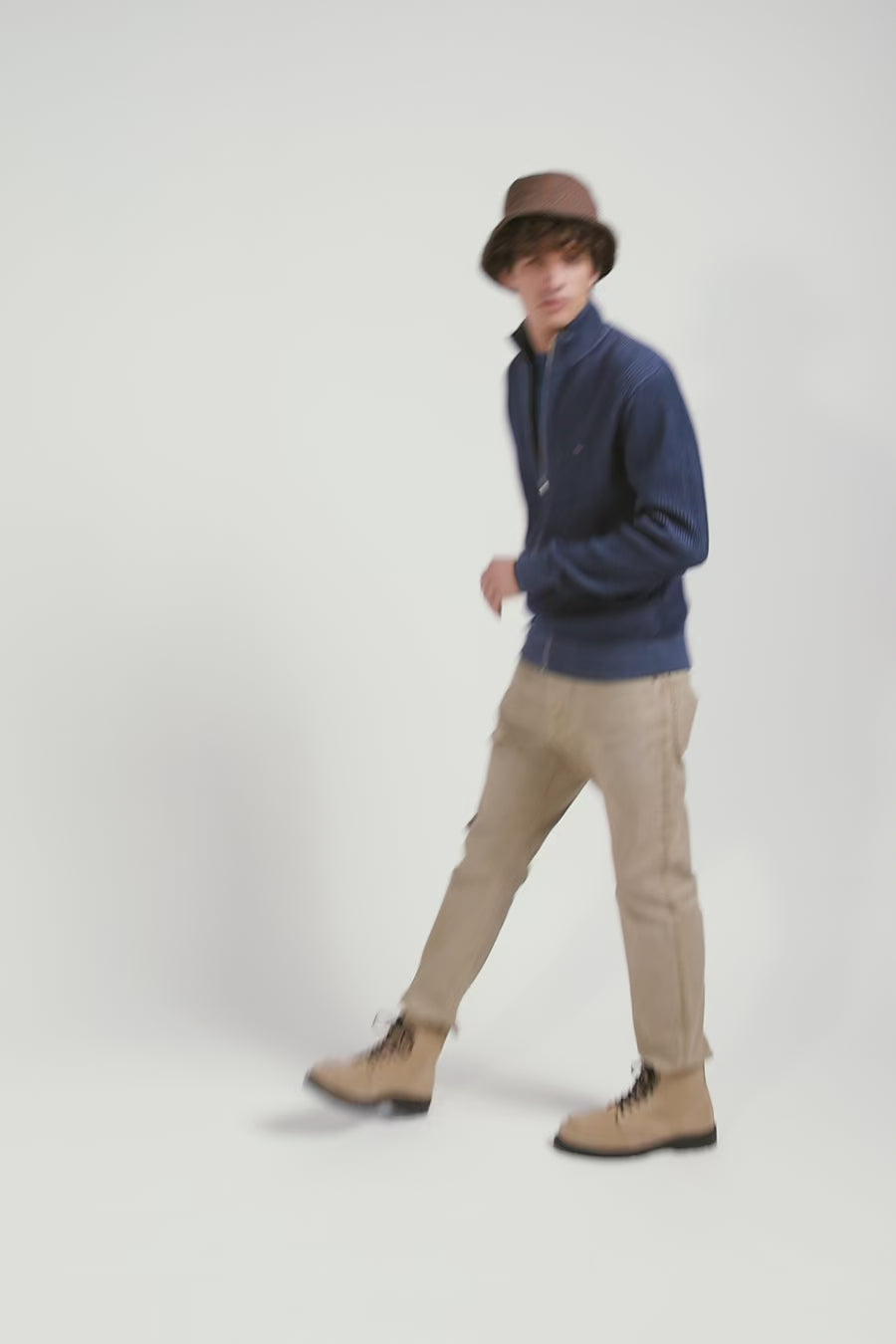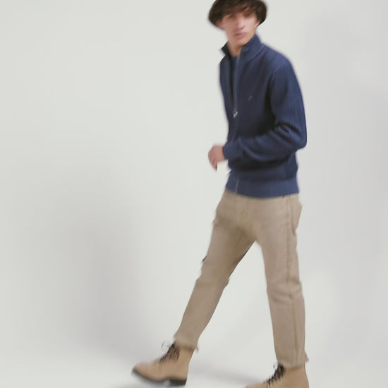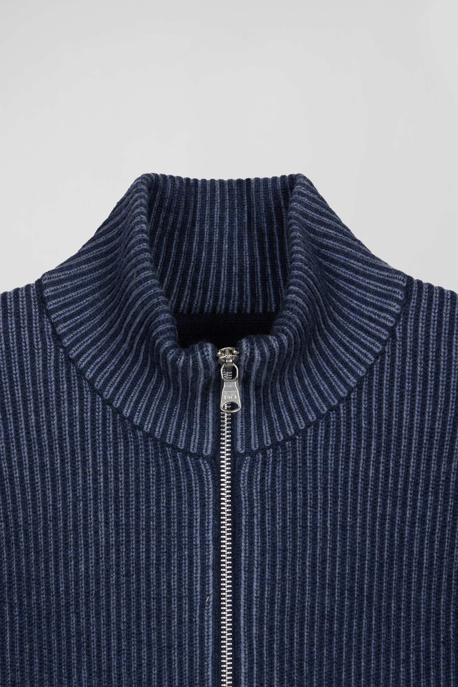 Our men's zip-up cardigan combines wool and cotton for optimum wearing comfort. Its straight Regular fit and gray zip are enhanced by a knit that creates a vertical stripe effect, for a modern, sports-inspired style. Available in three timeless colors, this zip-up cardigan is a perfect match for the men's wardrobe imagined by Eden Park for Fall/Winter.