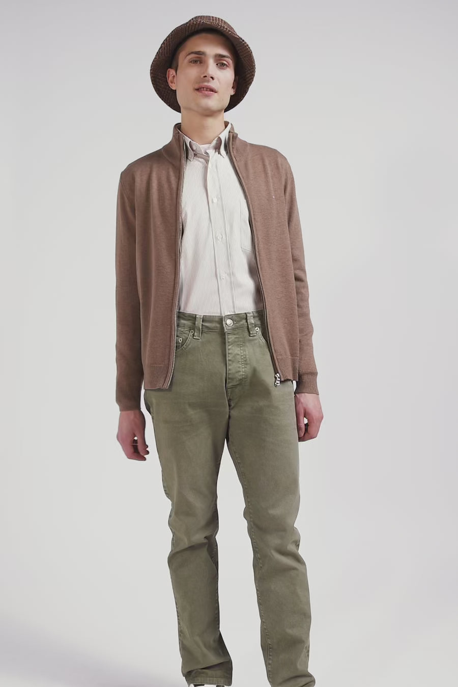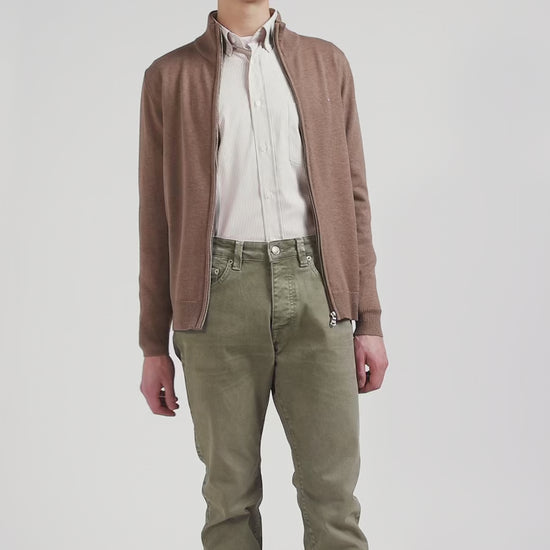 Regular camel plain wool and cotton zipped cardigan