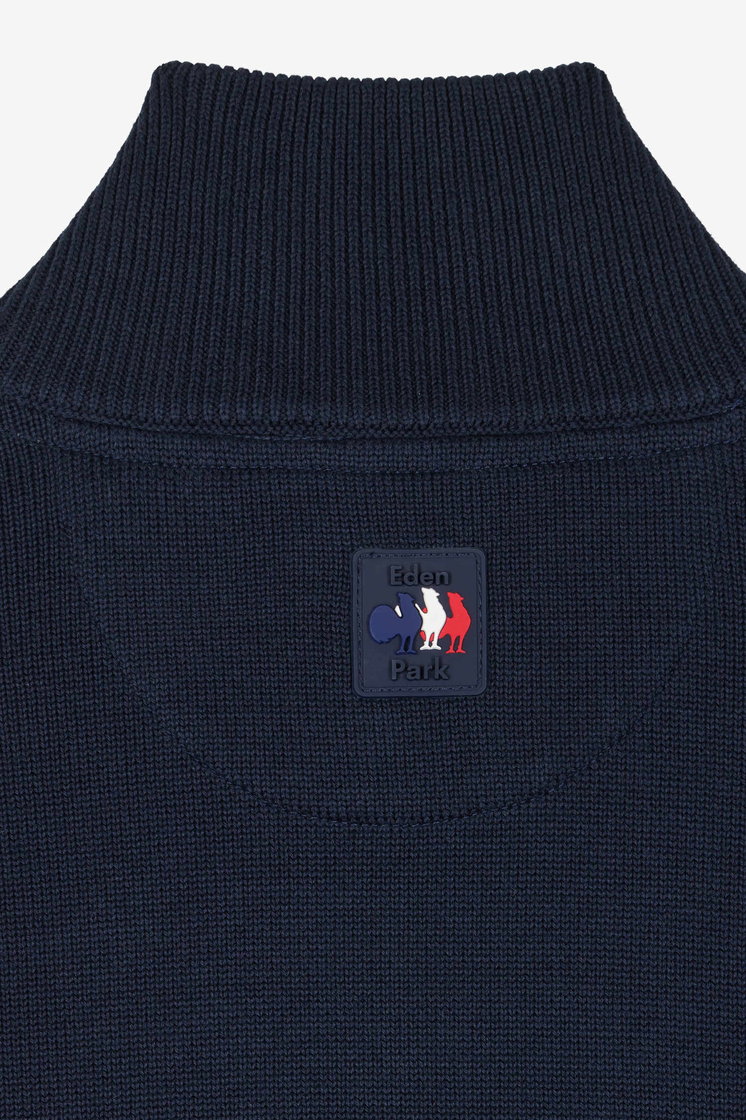Express your passion for rugby in style with this high-neck zipped cardigan, proudly featuring tricolored undersleeves matching the collar, echoing the colors of the XV de France. This garment, rich in details such as gum crests and symbolic embroidery, elegantly fuses sporty style with Eden Park's signature French Flair elegance. This trendy cardigan with its meticulous finishing is an elegant tribute to the spirit of French rugby.