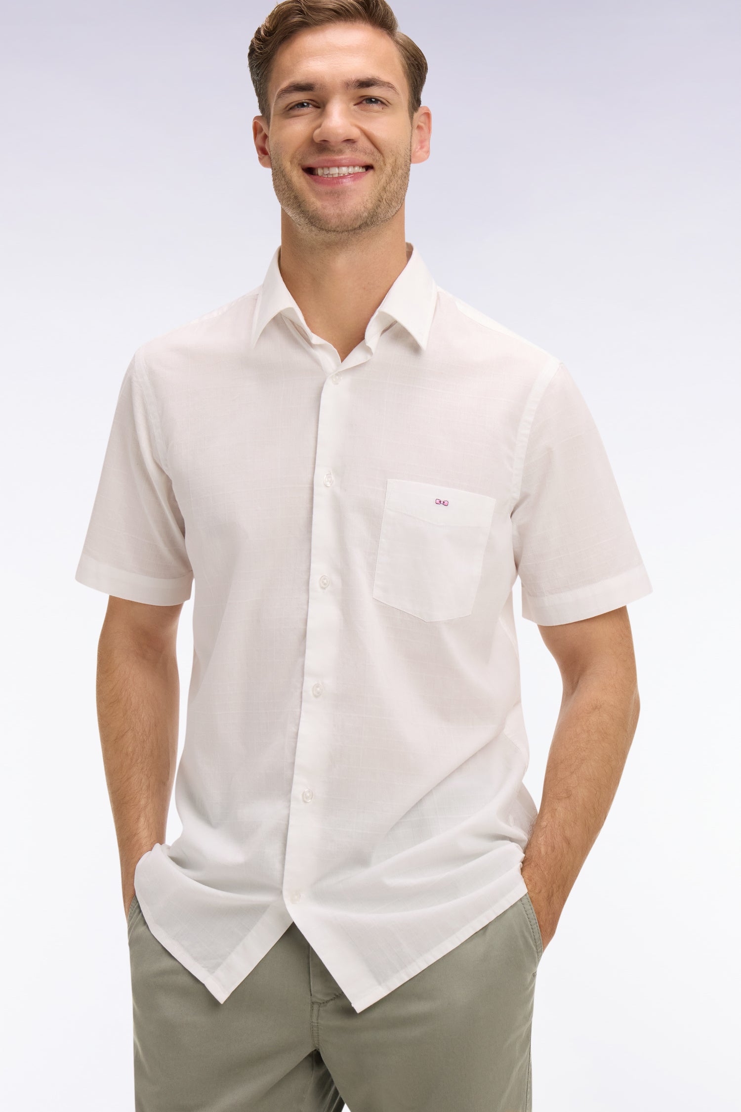 Léger et frais, notre coton est conçu pour accompagner vos journées ensoleillées avec élégance. Cette chemisette à coupe slim ajustée offre un confort optimal grâce à son coton doux, ses pants droits et son col à pointes libres, idéaux pour une allure soignée sans effort. Elle se distingue par sa poche poitrine brodée du nœud papillon rose, signature raffinée de notre Maison. Une pièce intemporelle qui incarne le chic décontracté de notre vestiaire printemps-été.