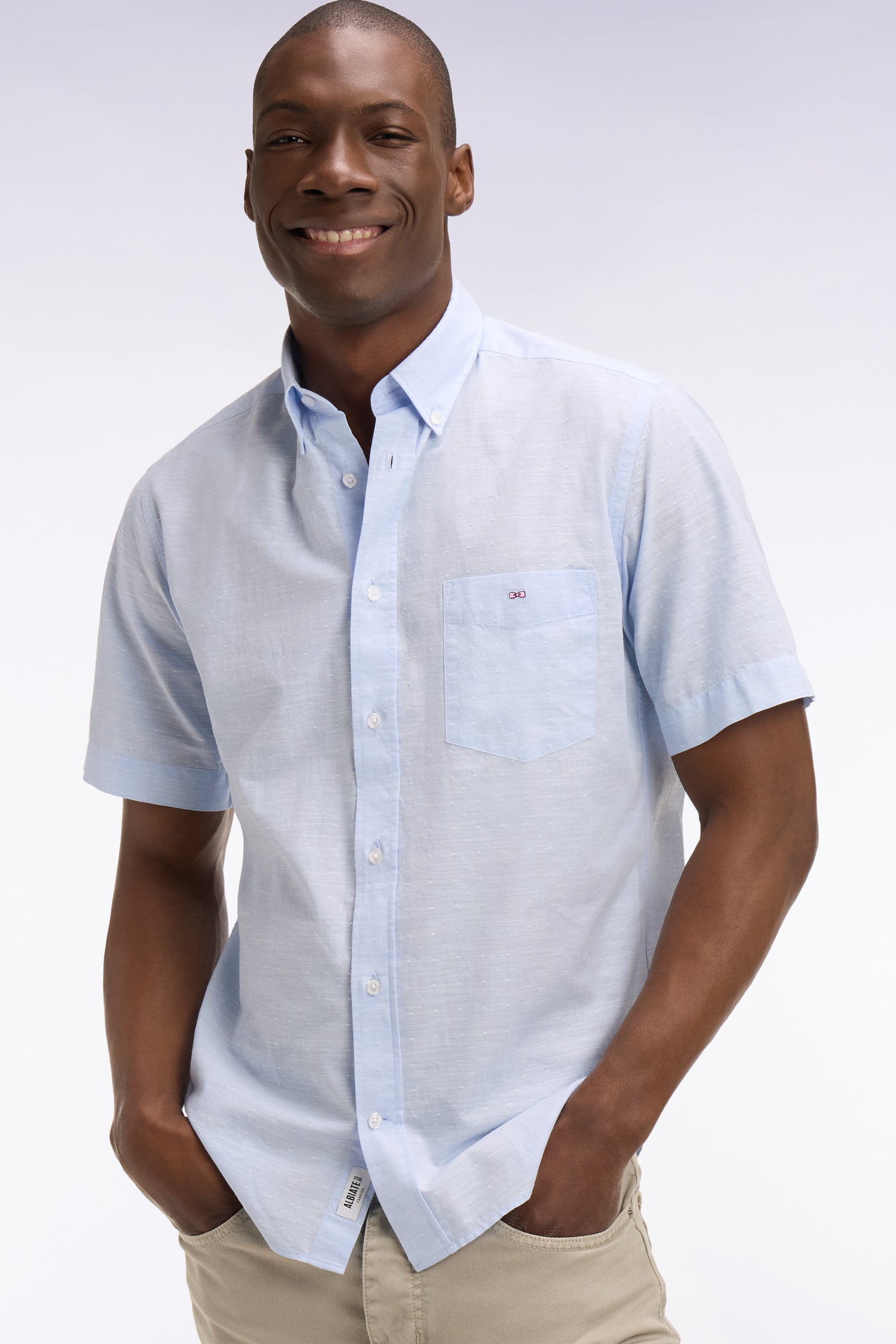 Cette chemise homme à manches courtes est à la fois sobre et raffinée. Confectionnée dans un coton à tissage jacquard Dobby italien, elle se distingue par sa texture subtile et son relief discret, reflet du savoir-faire textile de nos ateliers. Sa coupe droite et son coton pur de haute qualité assurent légèreté et confort à cette chemisette. Le nœud papillon brodé sur la poitrine signe une pièce estivale chic et intemporelle offerte en 3 coloris lumineux.