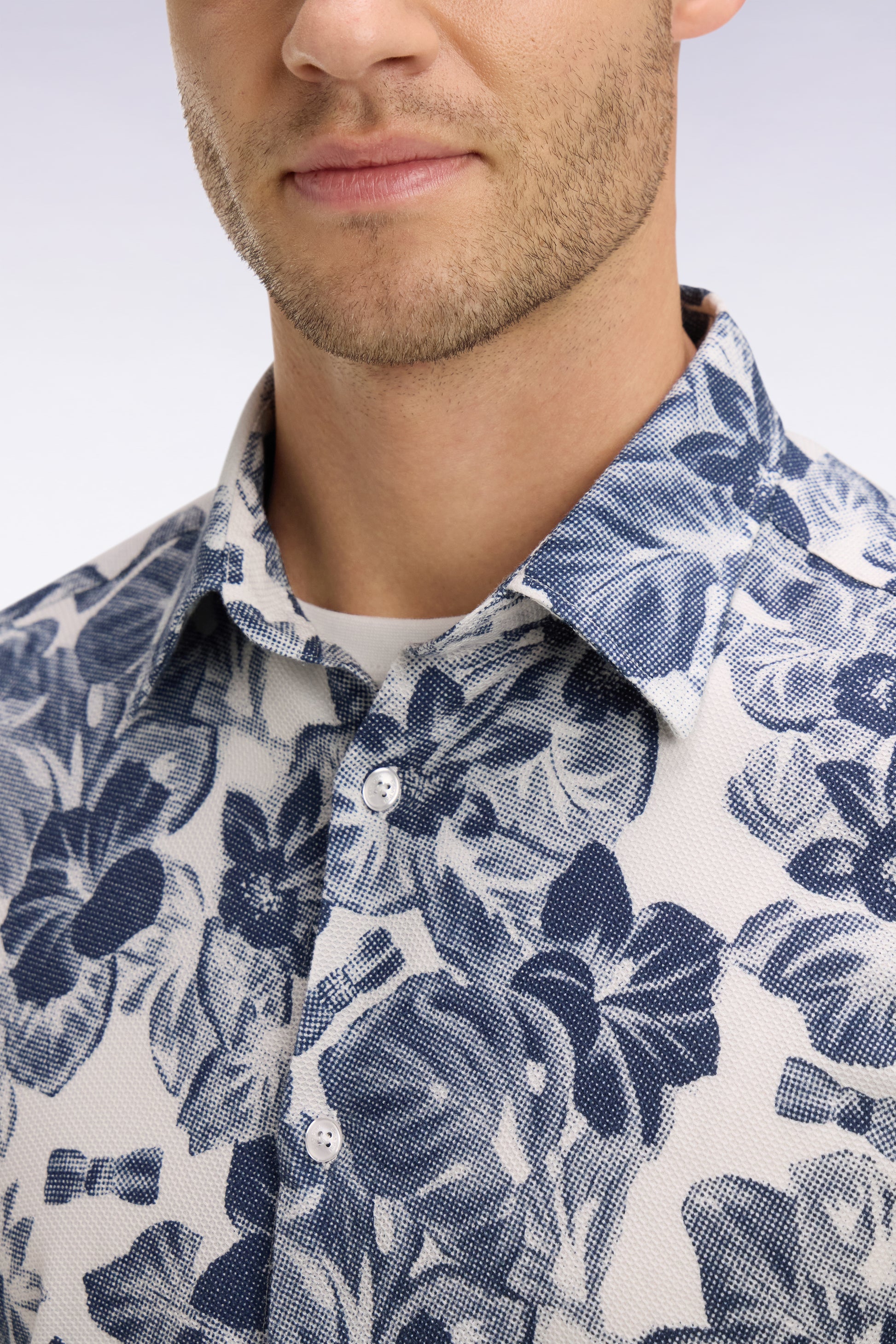 Chemise à manches courtes en piqué coton à motif floral marine coupe slim