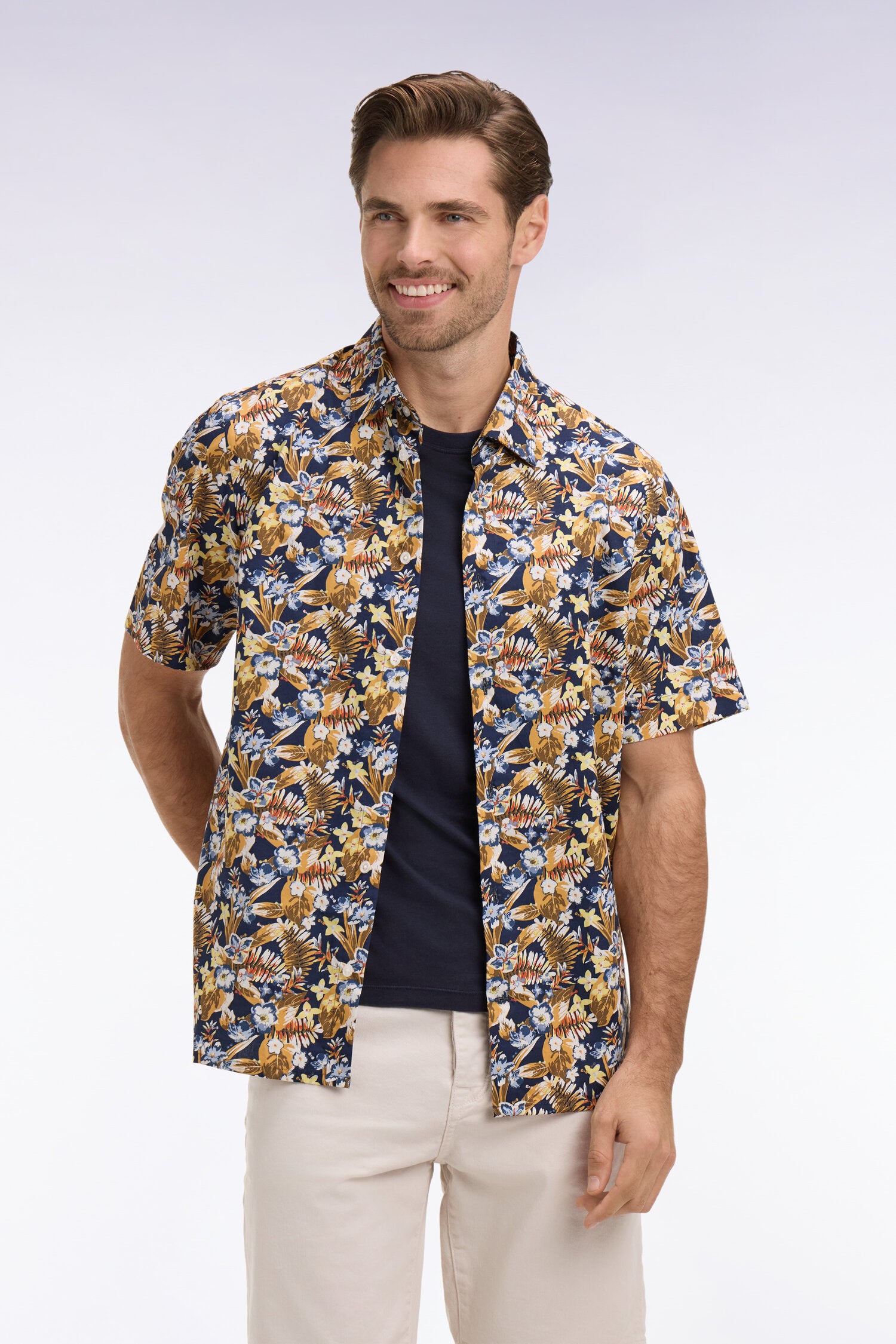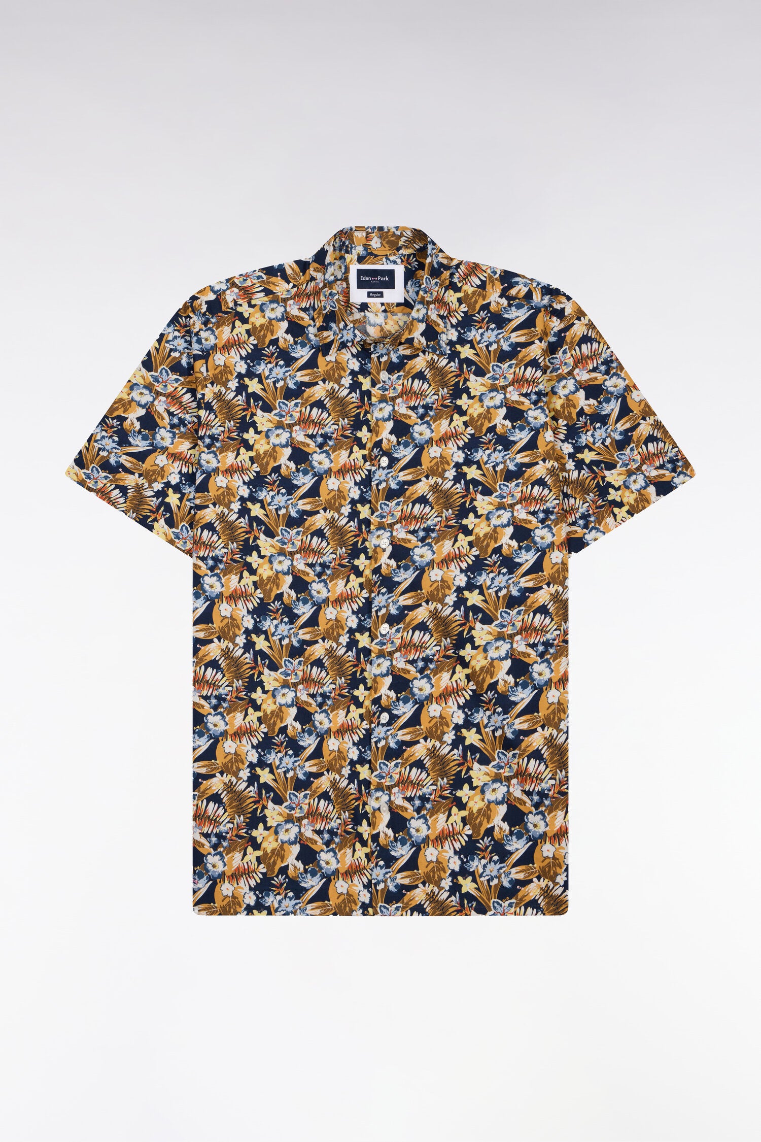 Véritable pièce estivale, cette chemise manches courtes marine est habillée d'un imprimé floral jaune exclusif à notre Maison qui égaye la silhouette tout en conservant une élégance maîtrisée. Réalisée dans un coton léger et respirant, cette chemisette joue sur les contrastes pour un effet frais et dynamique.