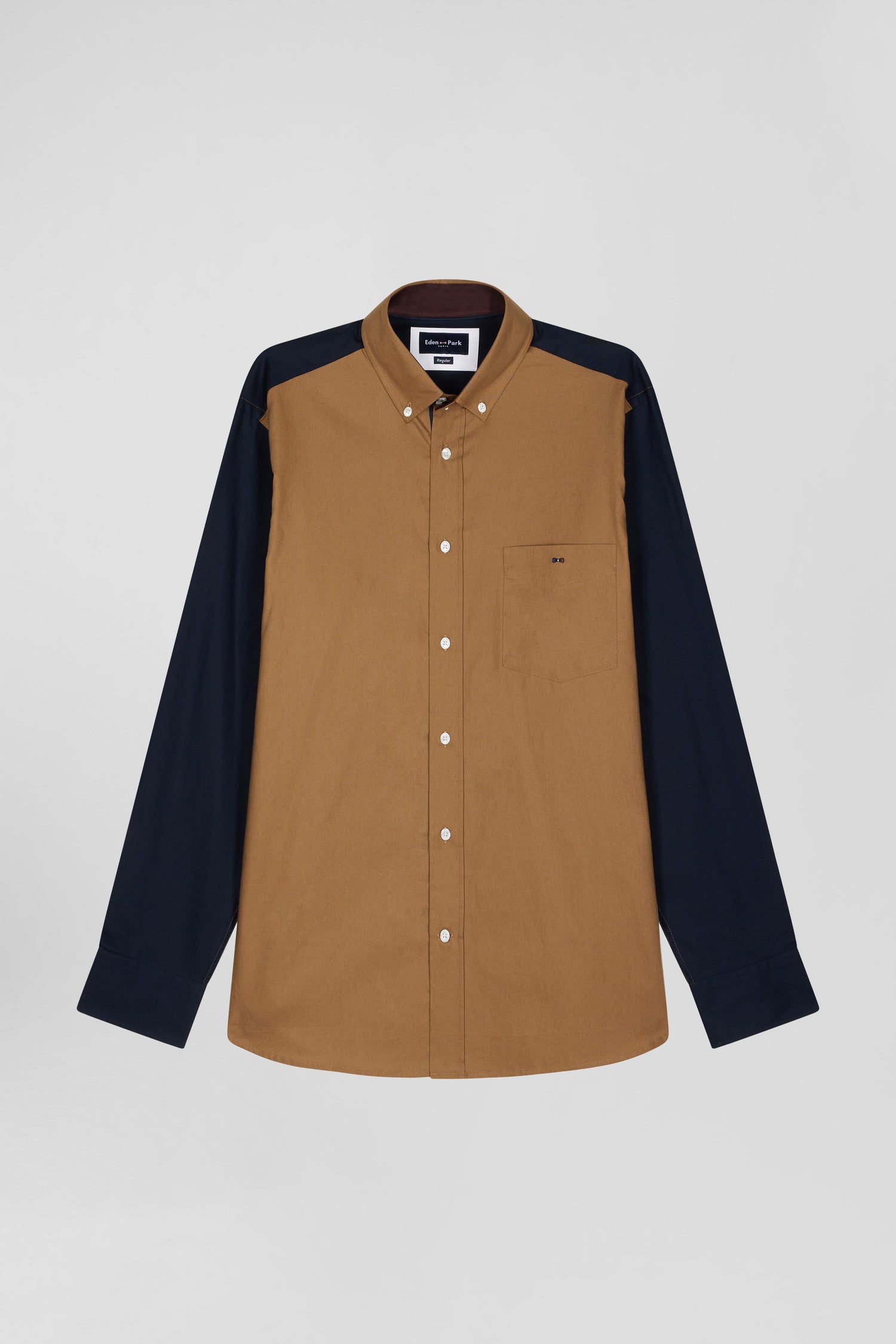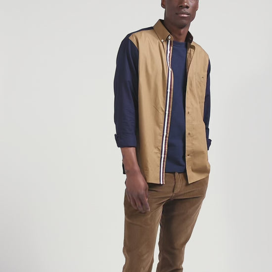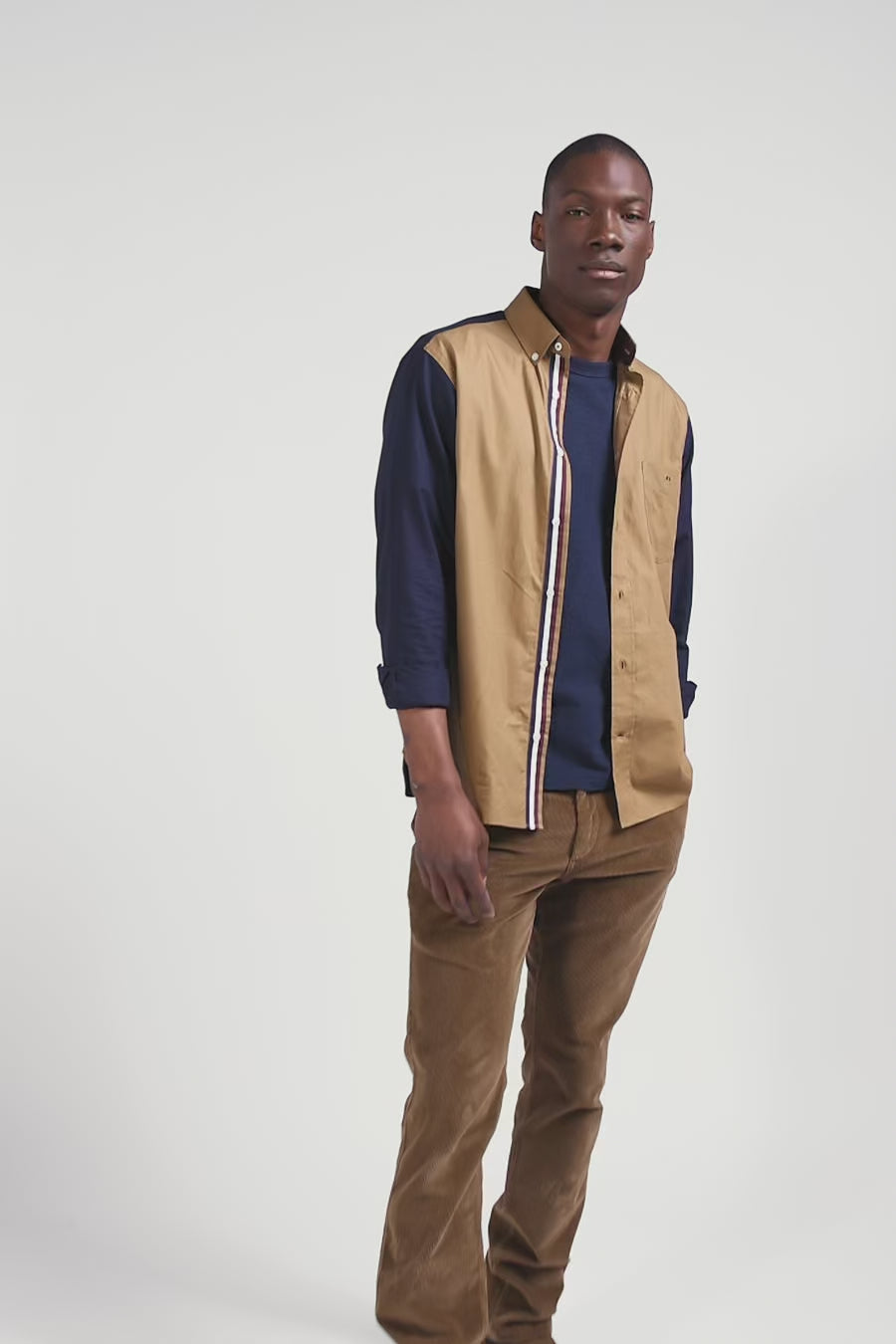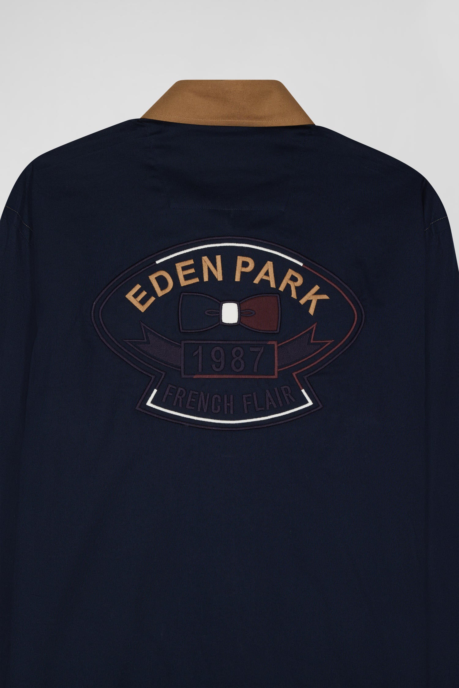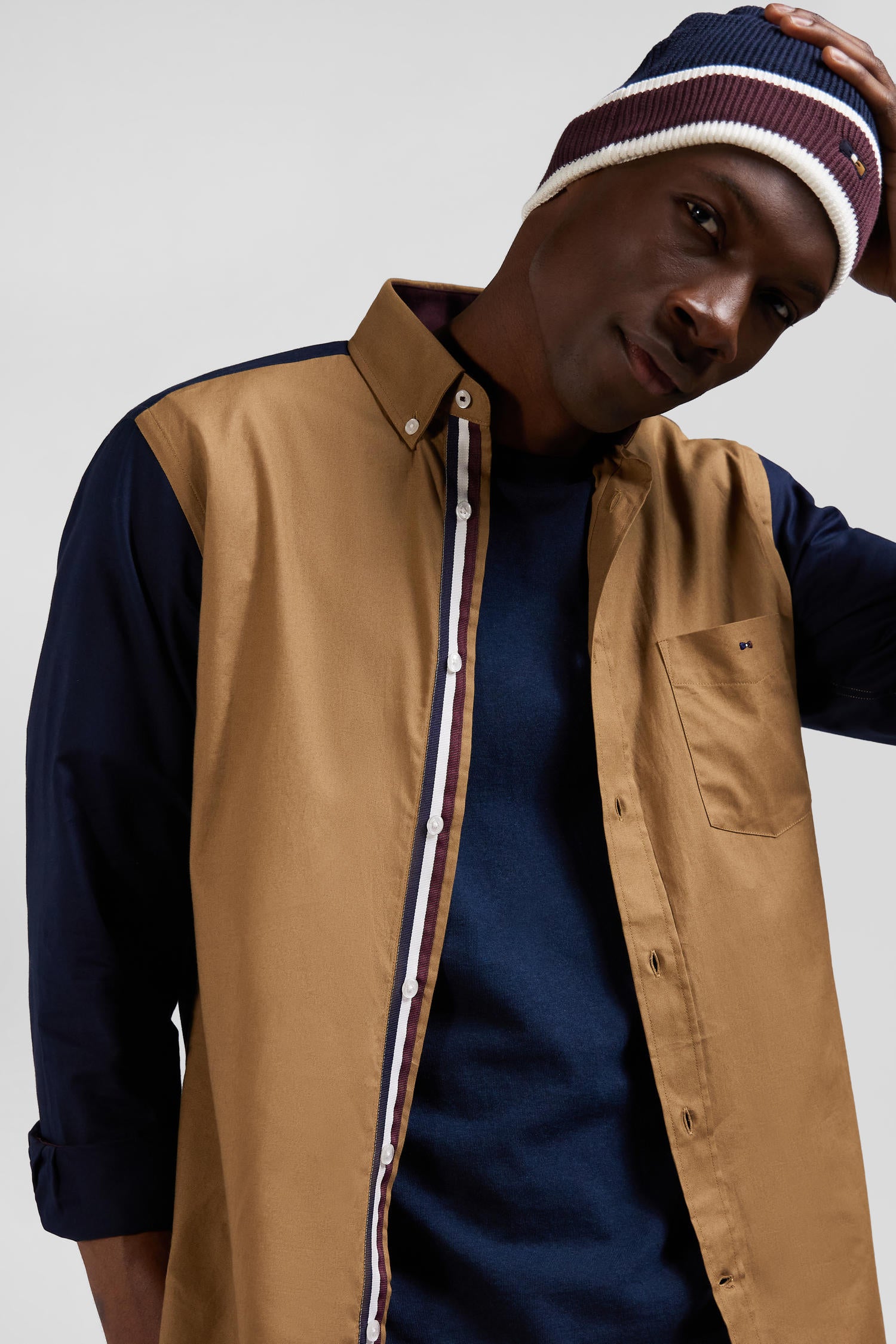 For this two-tone men's shirt, our Maison has selected a pin point cotton with a tighter weave, more textured and slightly thicker than poplin, for greater durability while promoting ease of movement and comfort. The back of the shirt is embroidered with Eden Park's emblematic codes. Its tricolored button placket, reminiscent of the bowtie embroidery, gives it a chic yet athletic touch, an expression of the French Flair spirit of our French brand.