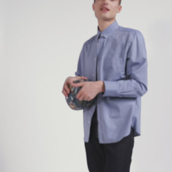 Our men's shirt in sky denim cotton canvas is enhanced by elbow patches adorned with a trendy floral micro-pattern. This blue shirt combines sophistication and originality. Worn on its own or open over a white overshirt, it offers a touch of whimsy while remaining classic and suitable for all occasions.