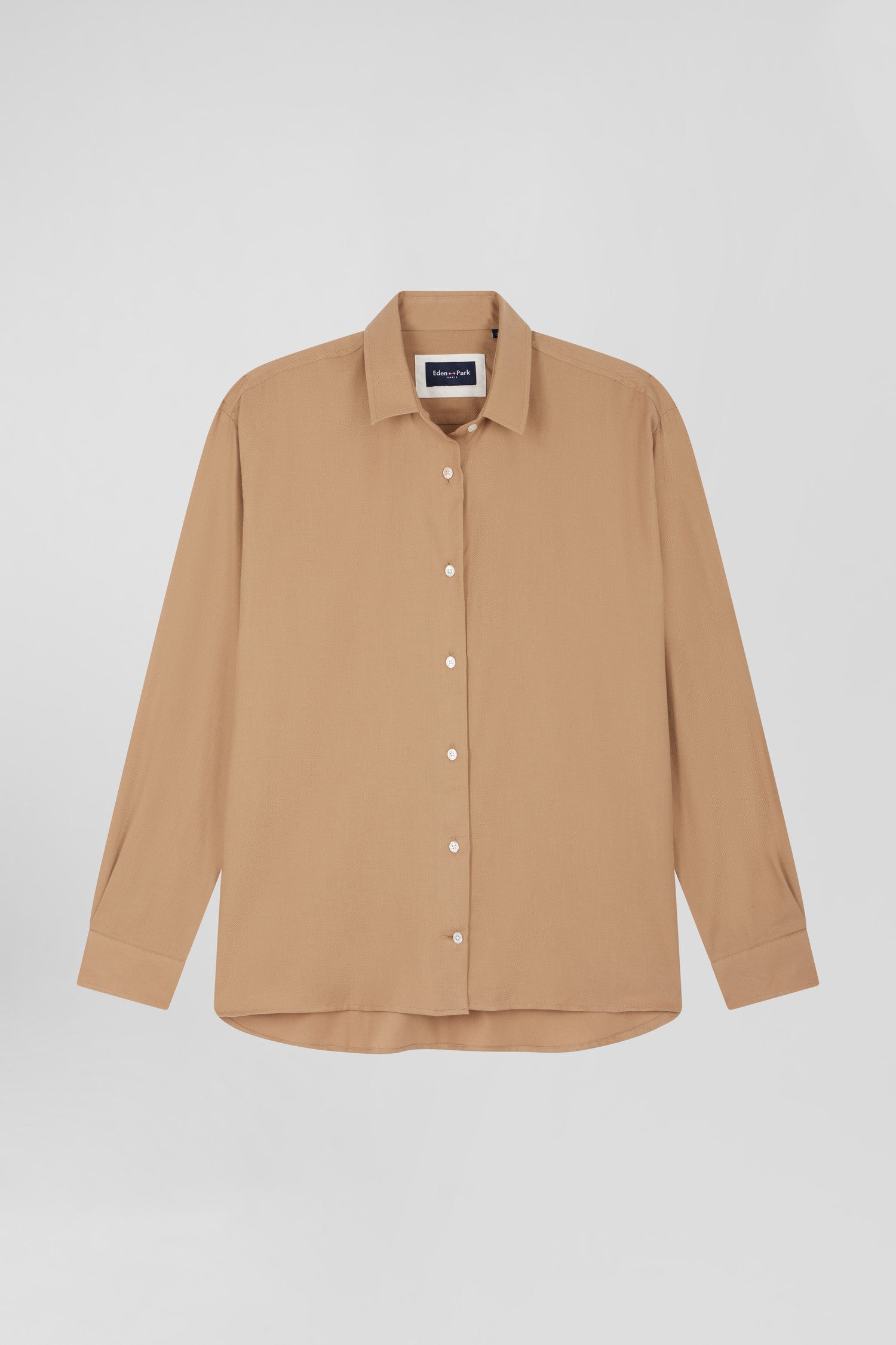 A true wardrobe essential, the cotton shirt is reinterpreted for fall-winter in a soft, warm version featuring cashmere wool. Available in indigo or camel, this streamlined shirt with its classic collar stands out for the quality of its finishing and its trendy oversized cut, ideal for your layering games.