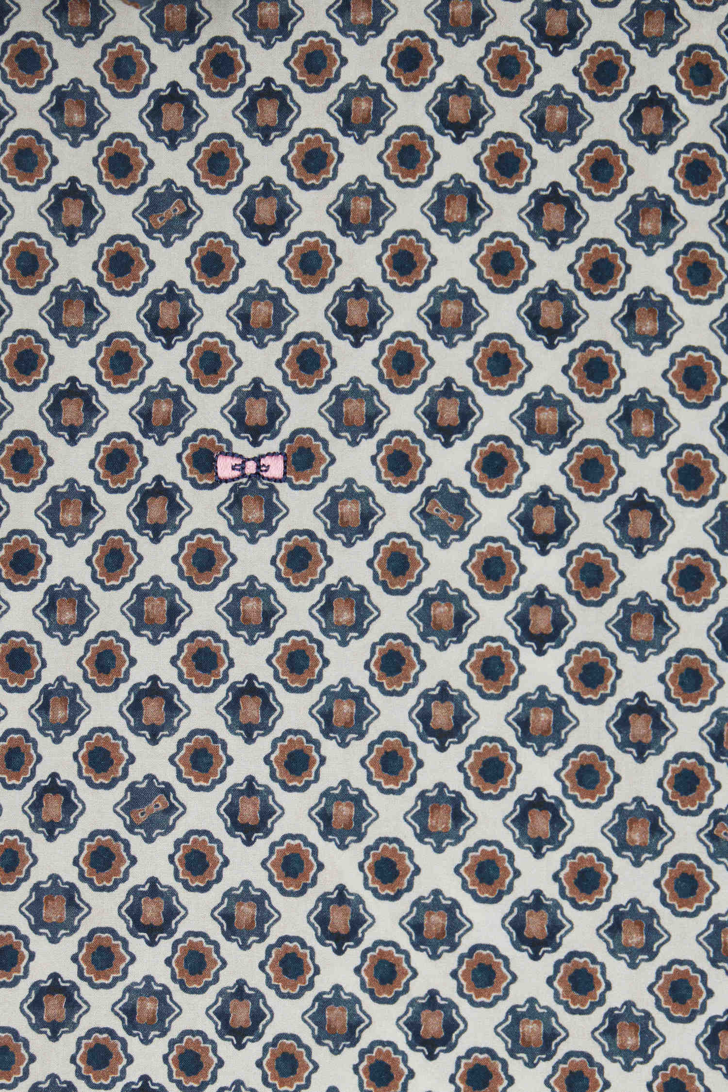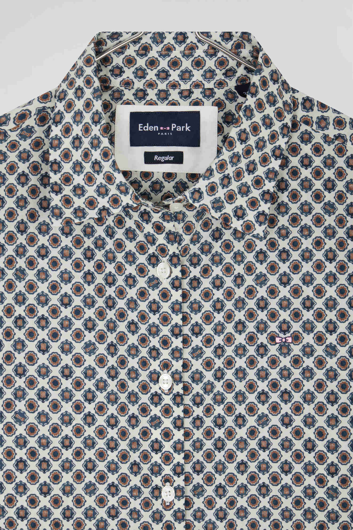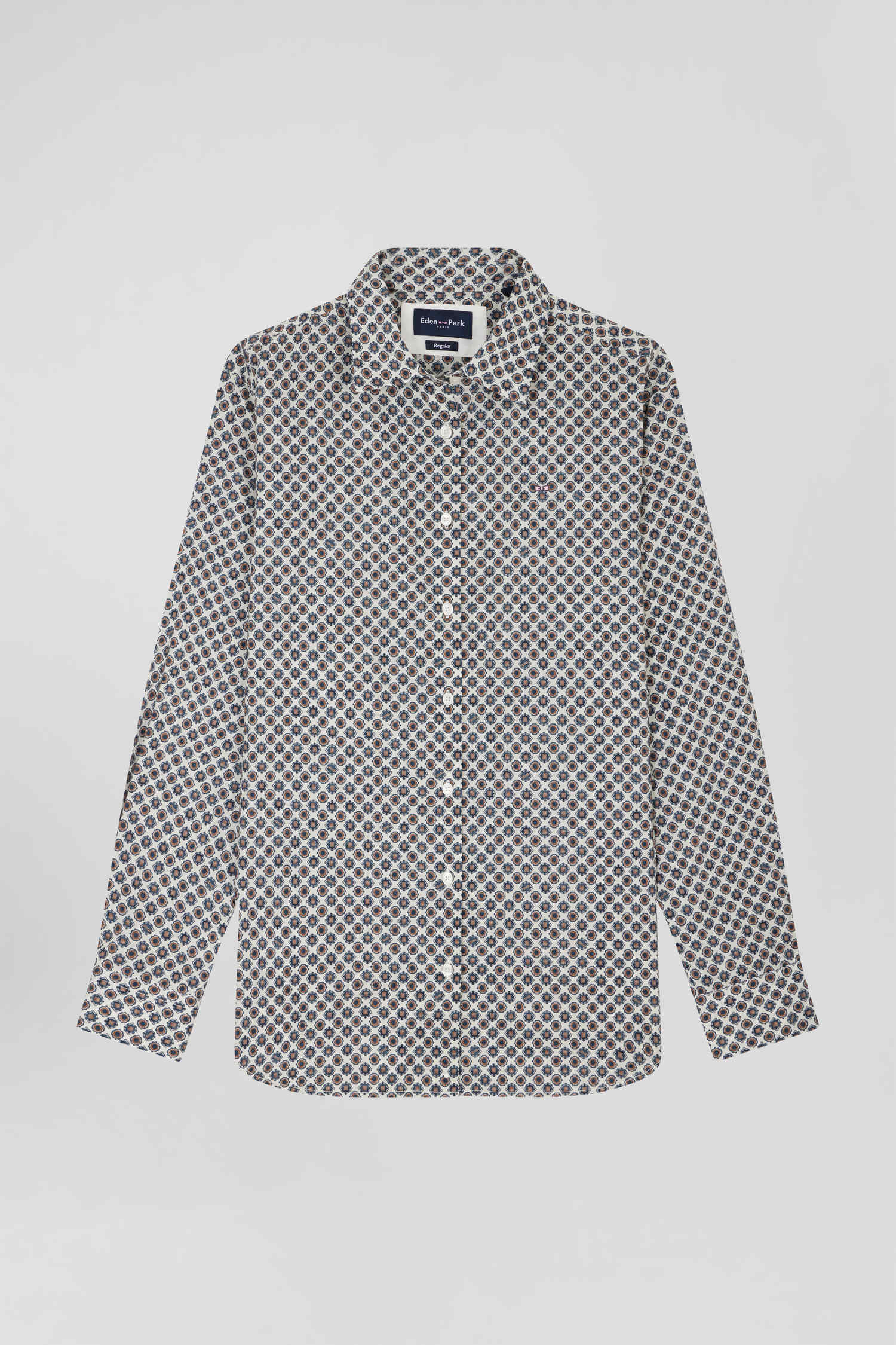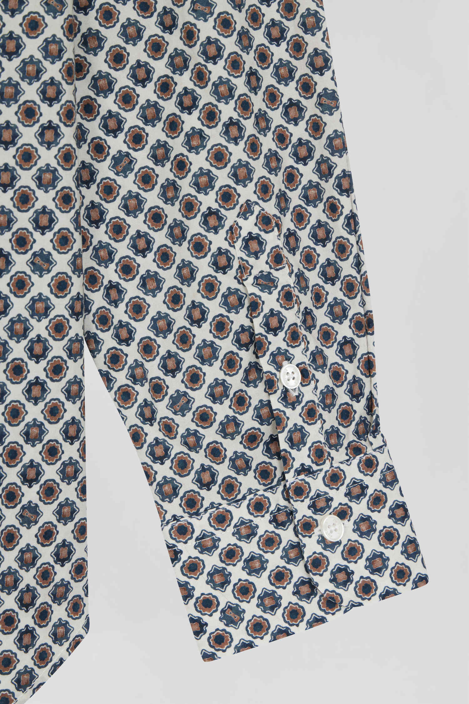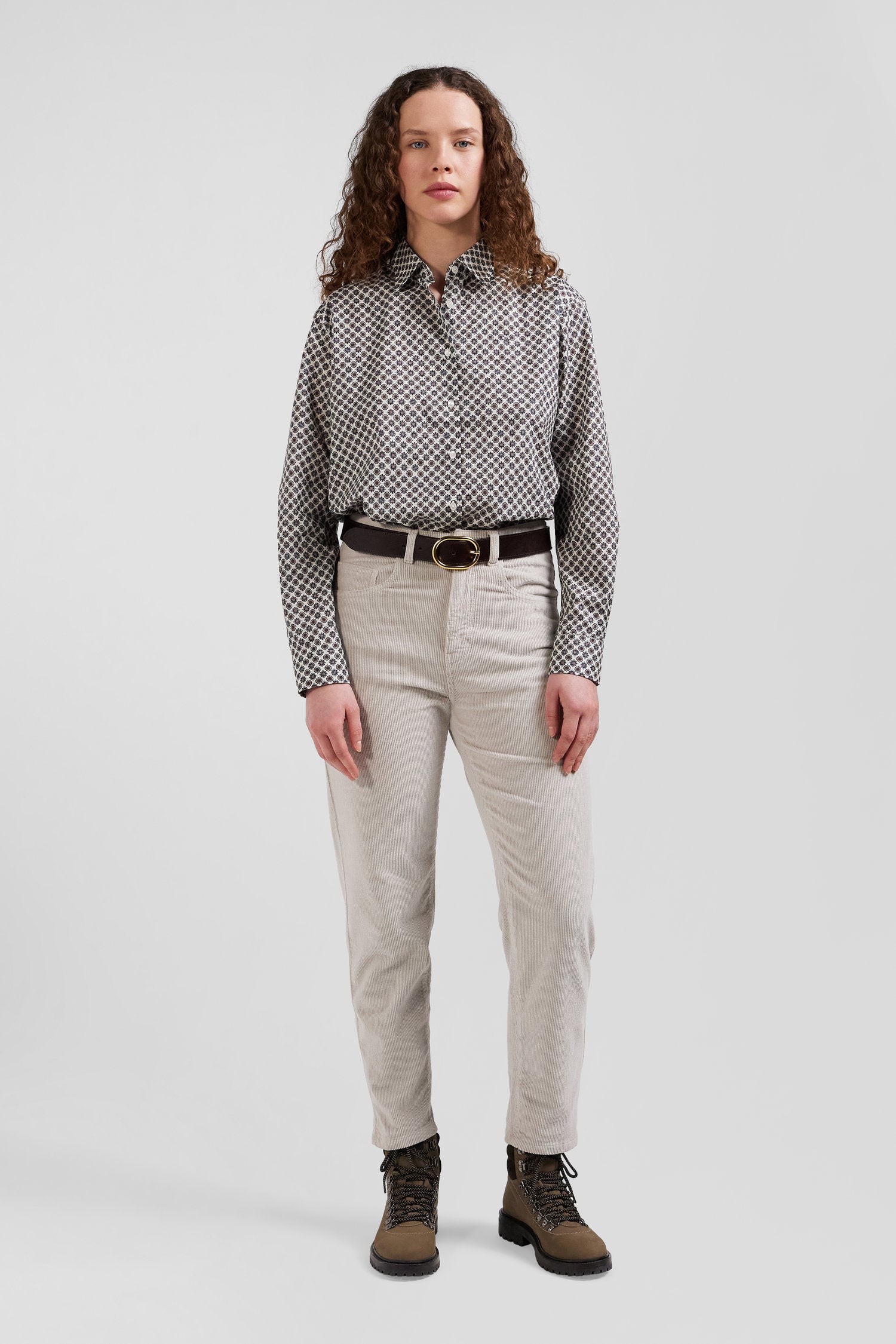 This women's shirt in cotton poplin is adorned with a graphic microprint exclusive to our Maison. In its elegant ivory and gray hues, this unique piece adds a subtle touch of originality to your outfit. Perfect for the office or a night out, this women's shirt combines distinctive style with comfort.