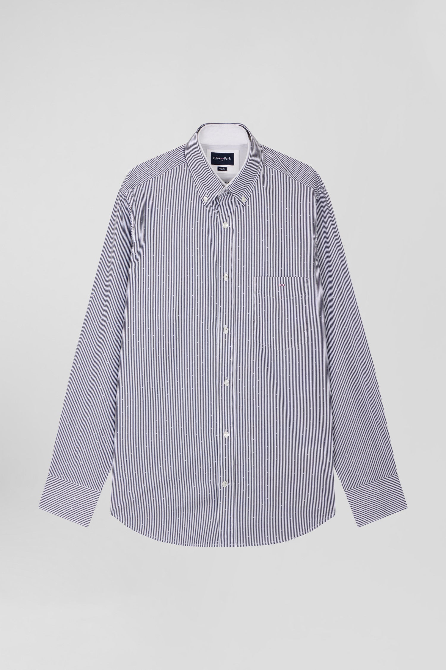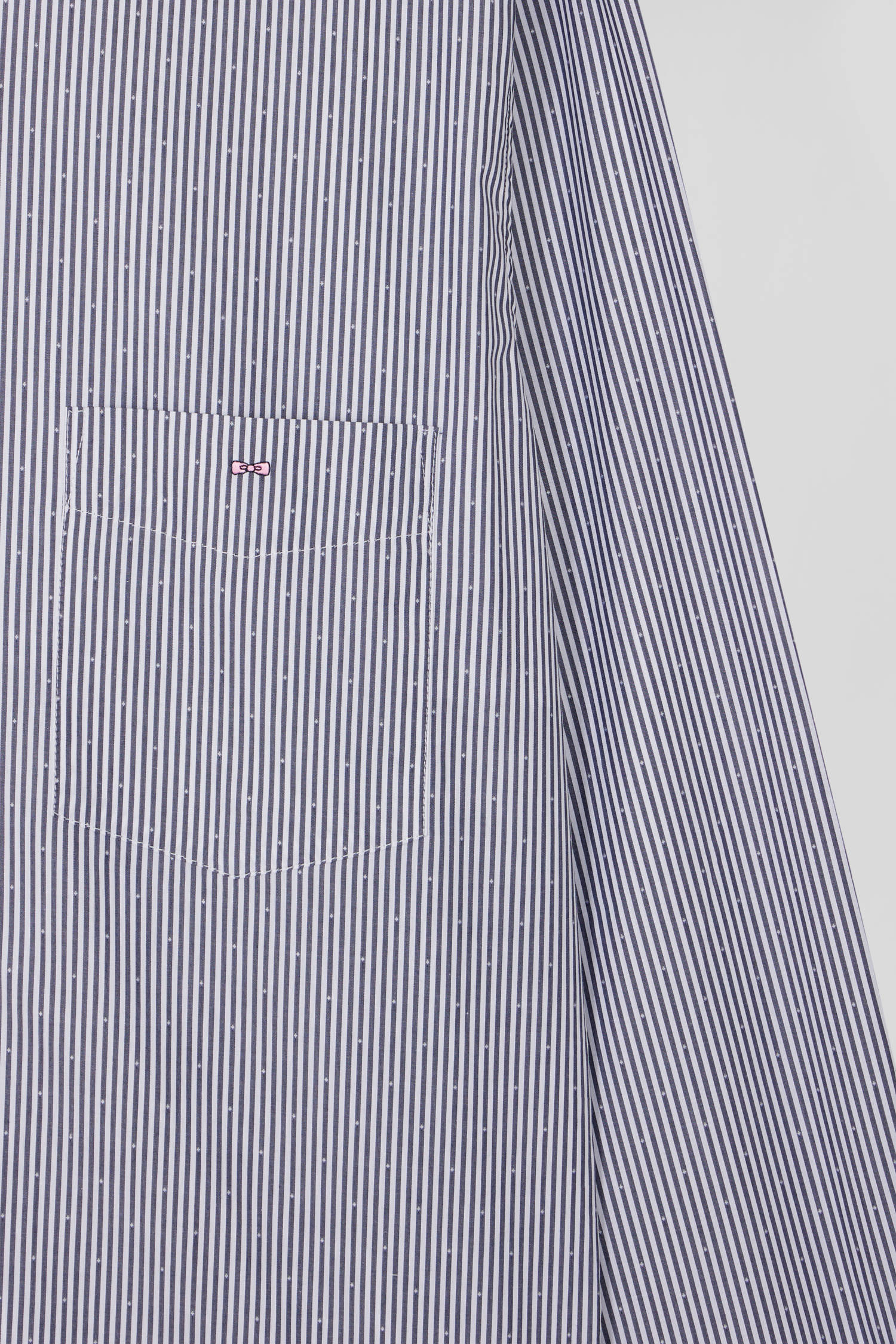 This elegant jacquard cotton shirt is available in two classic colors: navy and white or sky and white. Each version features fine stick stripes that add an understated touch of elegance to this timeless masculine piece. This shirt, cut in a straight Regular fit, features a double collar with buttoned points and a back pleat for added comfort and mobility. Our delicately embroidered bow tie on the breast pocket marks this piece with distinction.