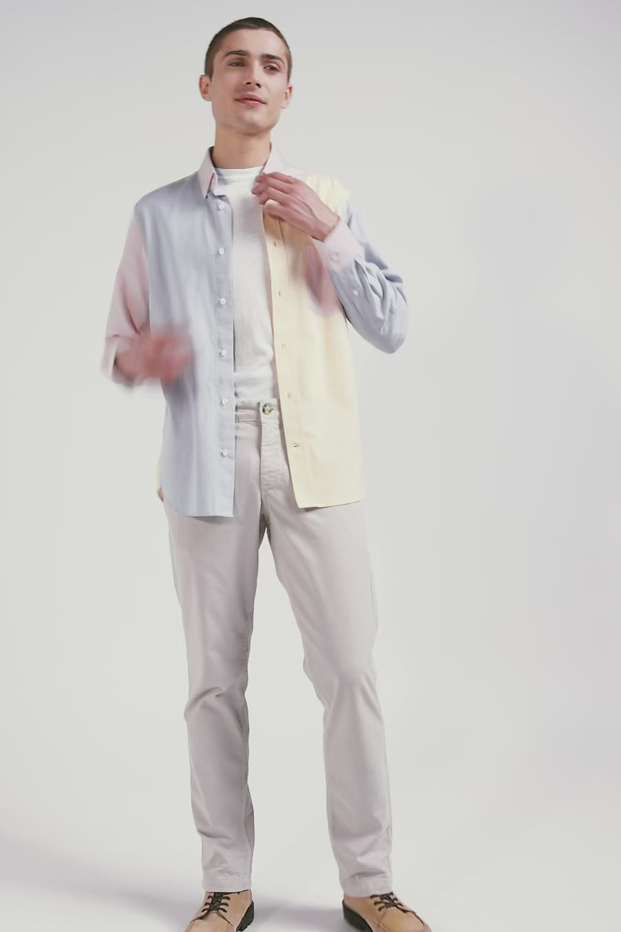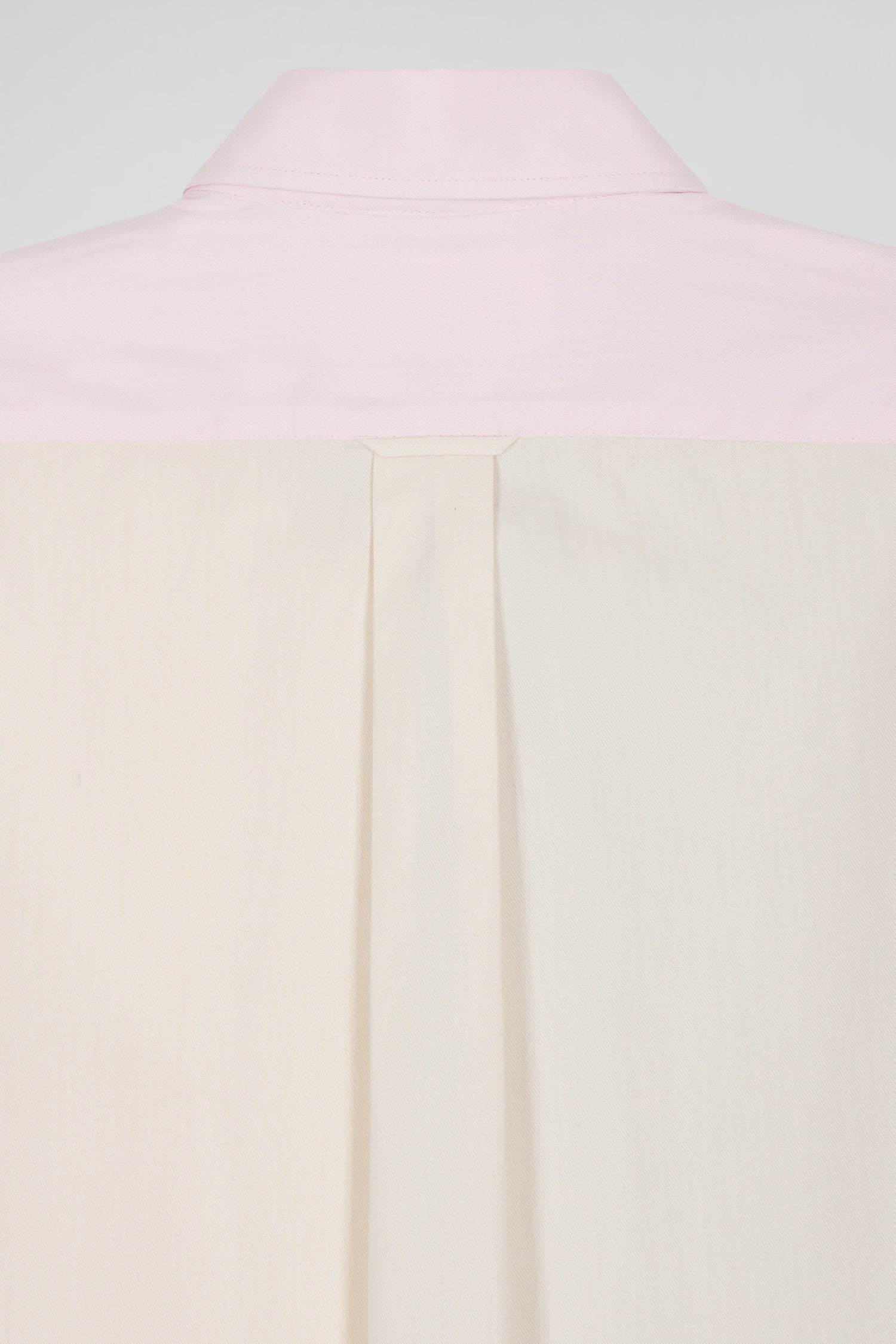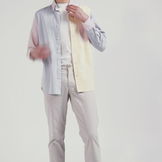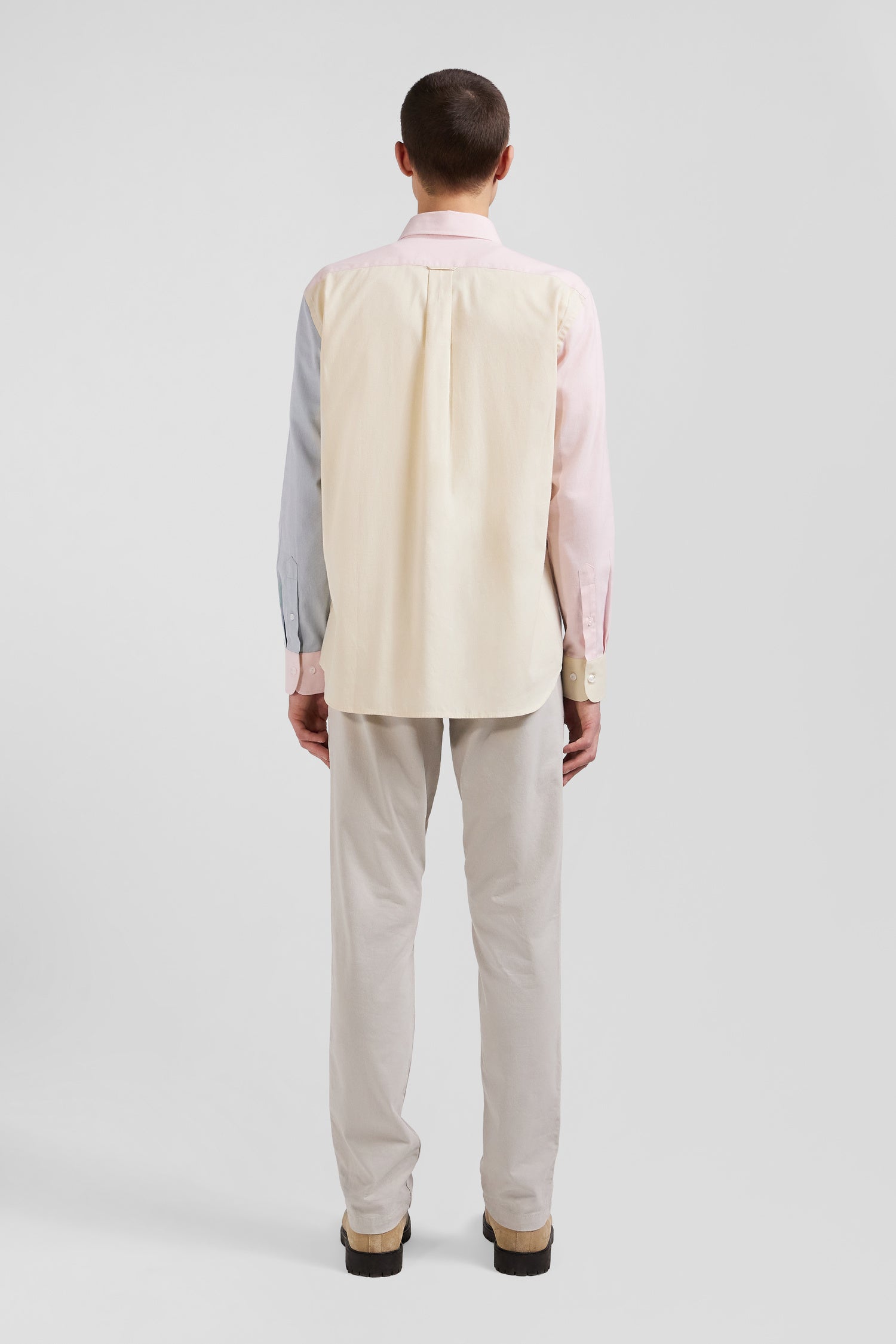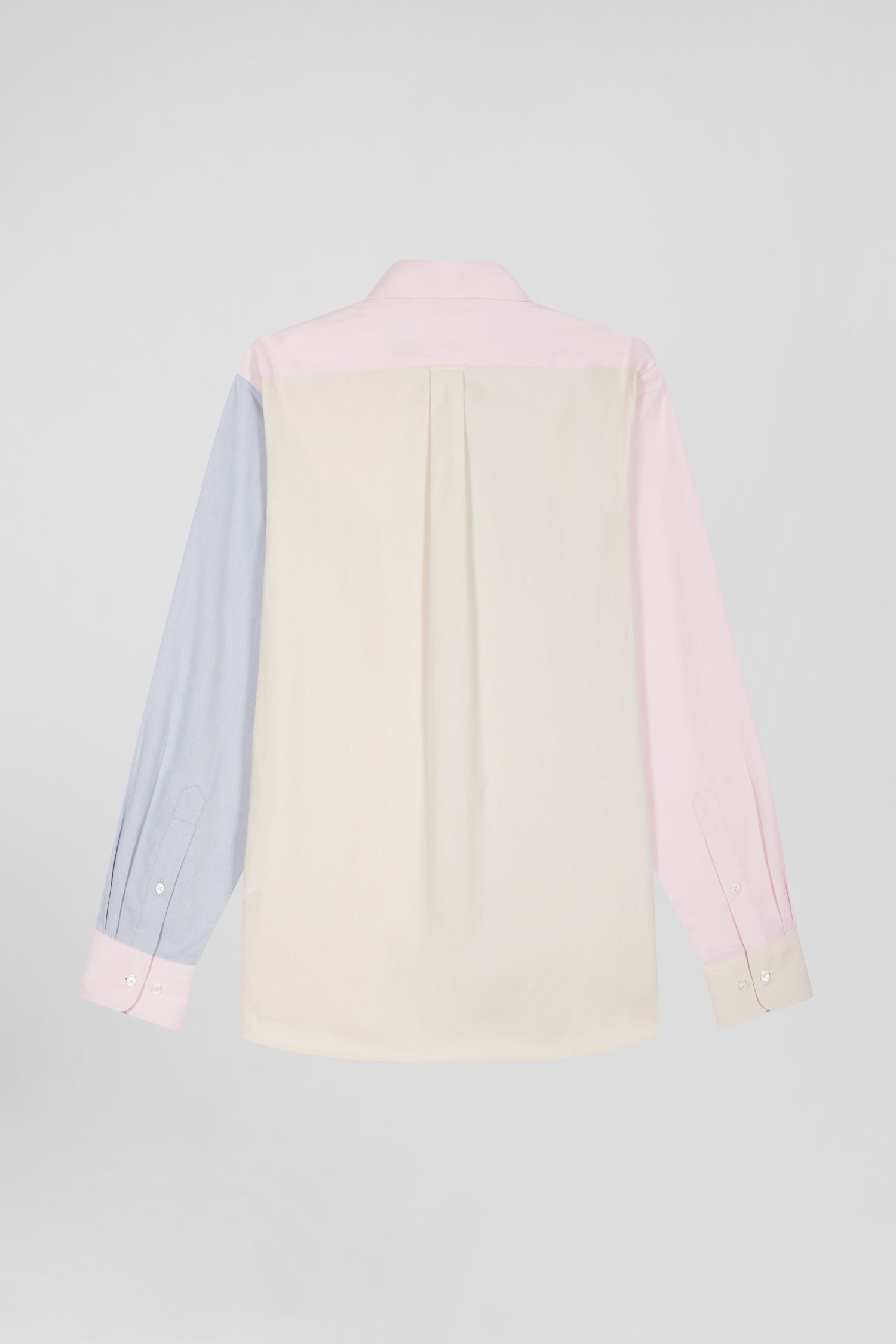 Crafted in cotton twill for added texture and softness, this men's shirt is distinguished by its play of colors, skilfully blending pink with sky and camel. With its pastel hues and colorblock effect, this shirt with patch pocket perfectly structures this season's masculine silhouettes. Equally at home with stonewash jeans or ecru or camel chino pants, this trendy piece promises to assert your personality in style.
