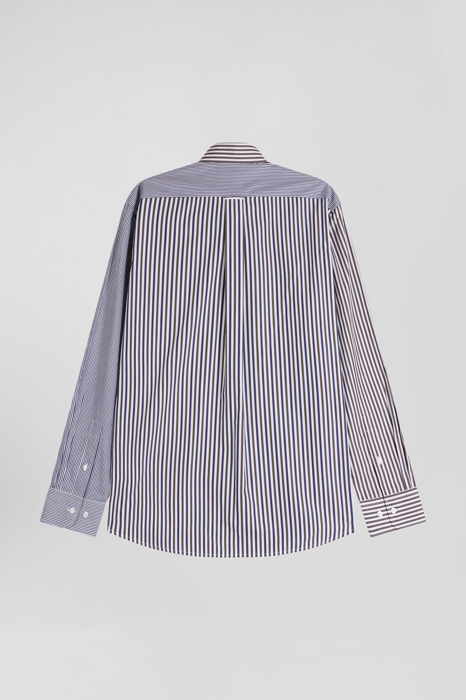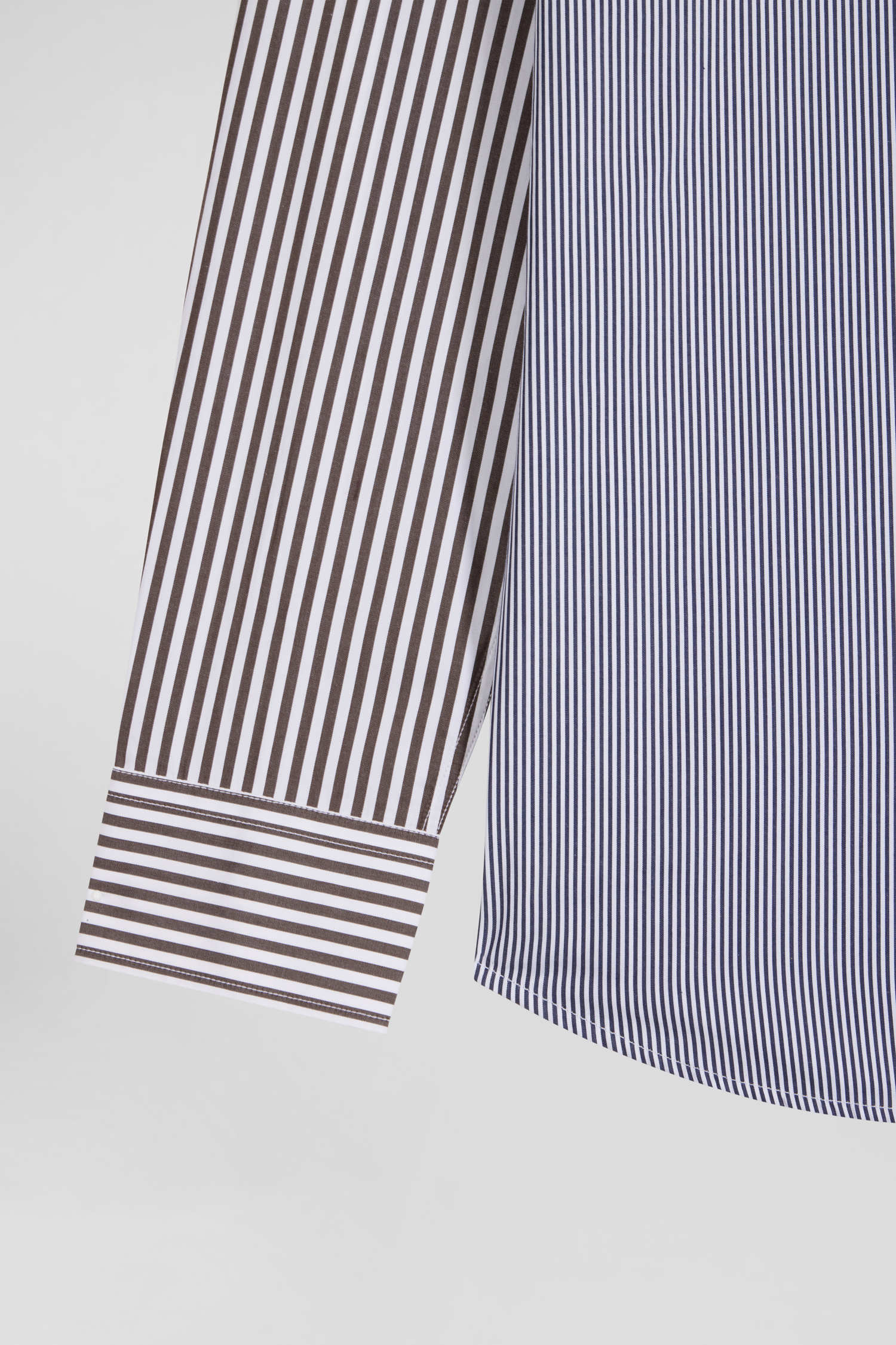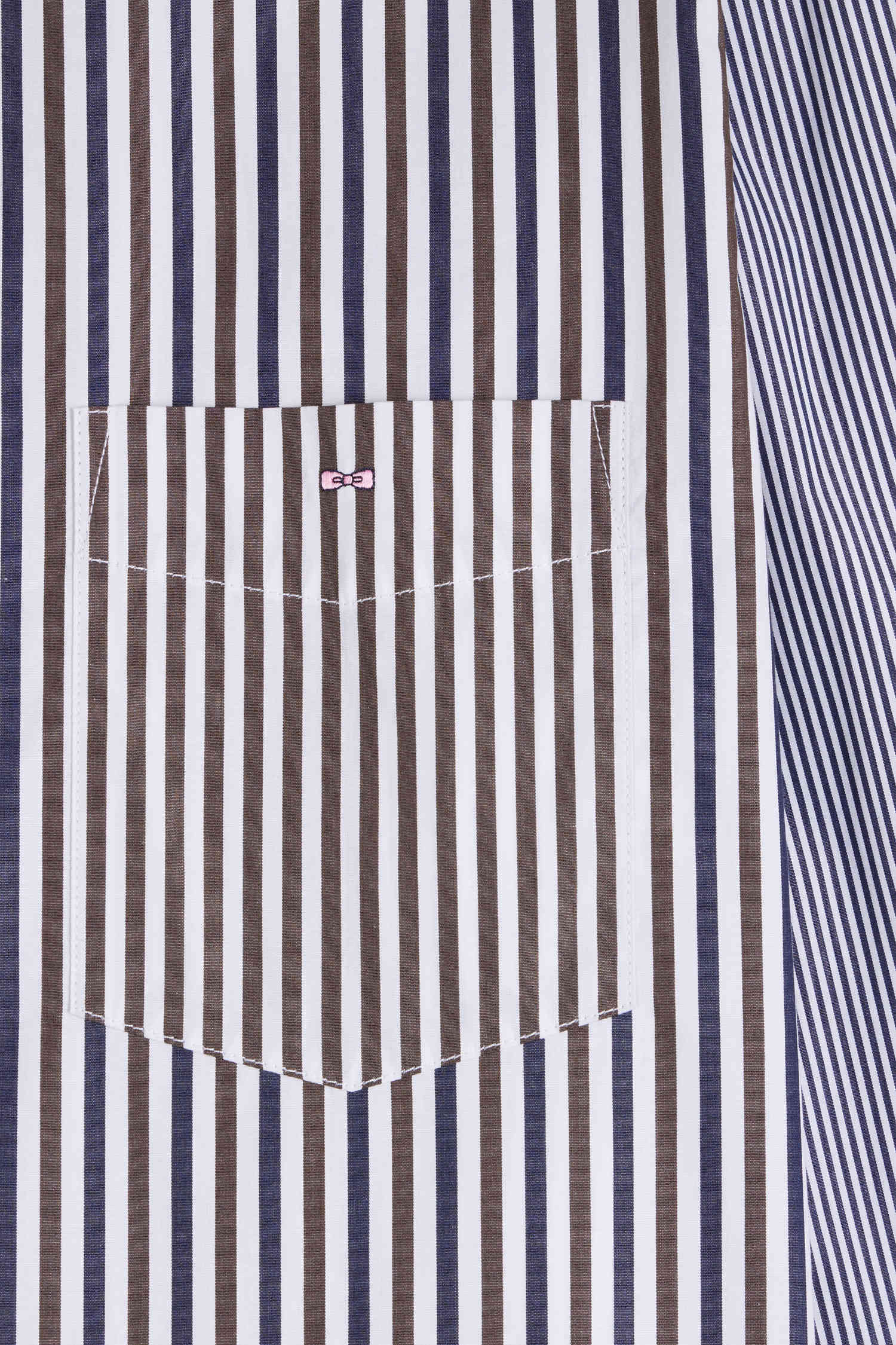 Our cotton poplin shirt is boldly designed with a mix and match of three types of stripes for a dynamic, modern look. This model features a button-down point collar and a back pleat that accentuates its straight cut, offering an elegant silhouette. Discreet bowtie embroidery adorns the chest pocket, adding a touch of refinement to this men's shirt. Perfect for the office or special occasions, this shirt combines creativity and comfort.