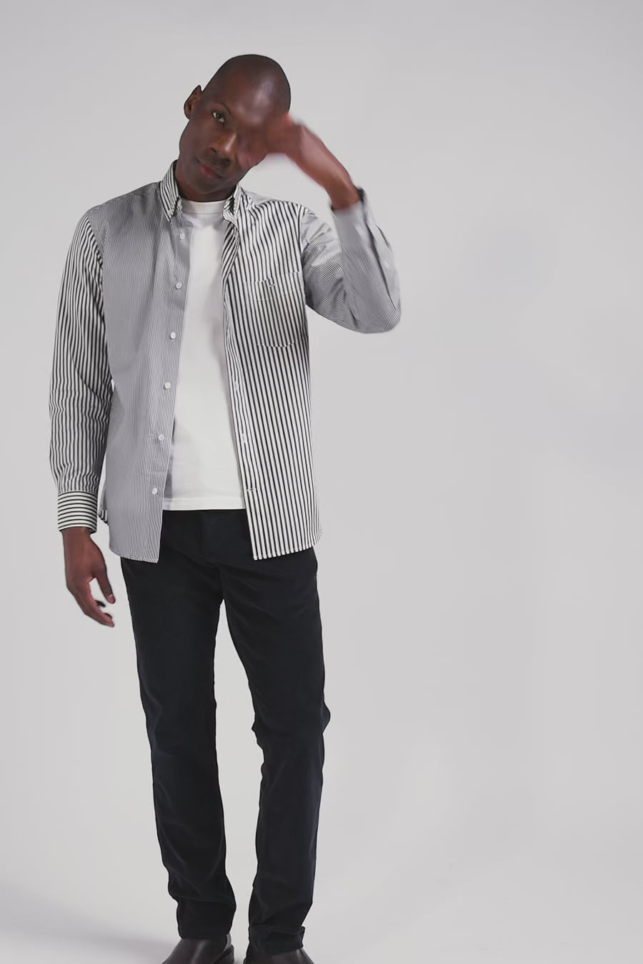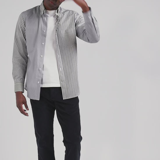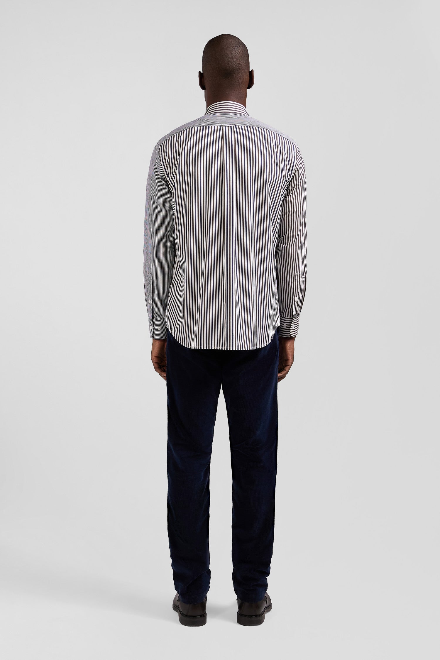 Our cotton poplin shirt is boldly designed with a mix and match of three types of stripes for a dynamic, modern look. This model features a button-down point collar and a back pleat that accentuates its straight cut, offering an elegant silhouette. Discreet bowtie embroidery adorns the chest pocket, adding a touch of refinement to this men's shirt. Perfect for the office or special occasions, this shirt combines creativity and comfort.
