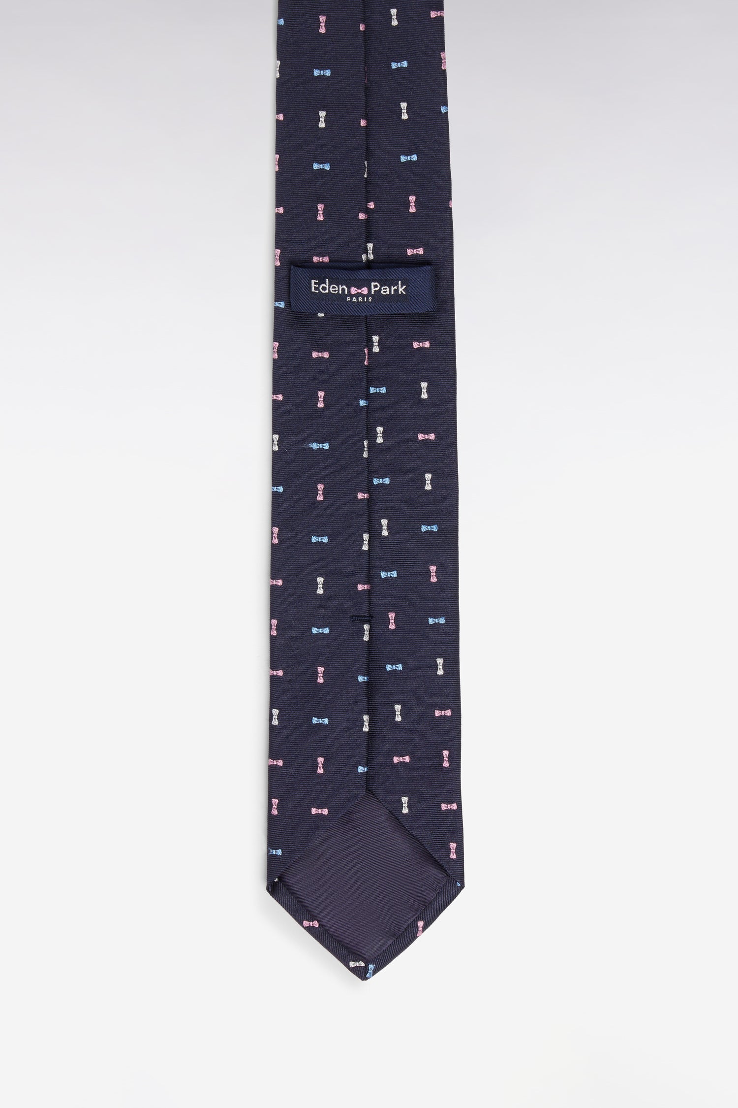 Cravate en soie marine à micromotifs nœuds papillon tricolores