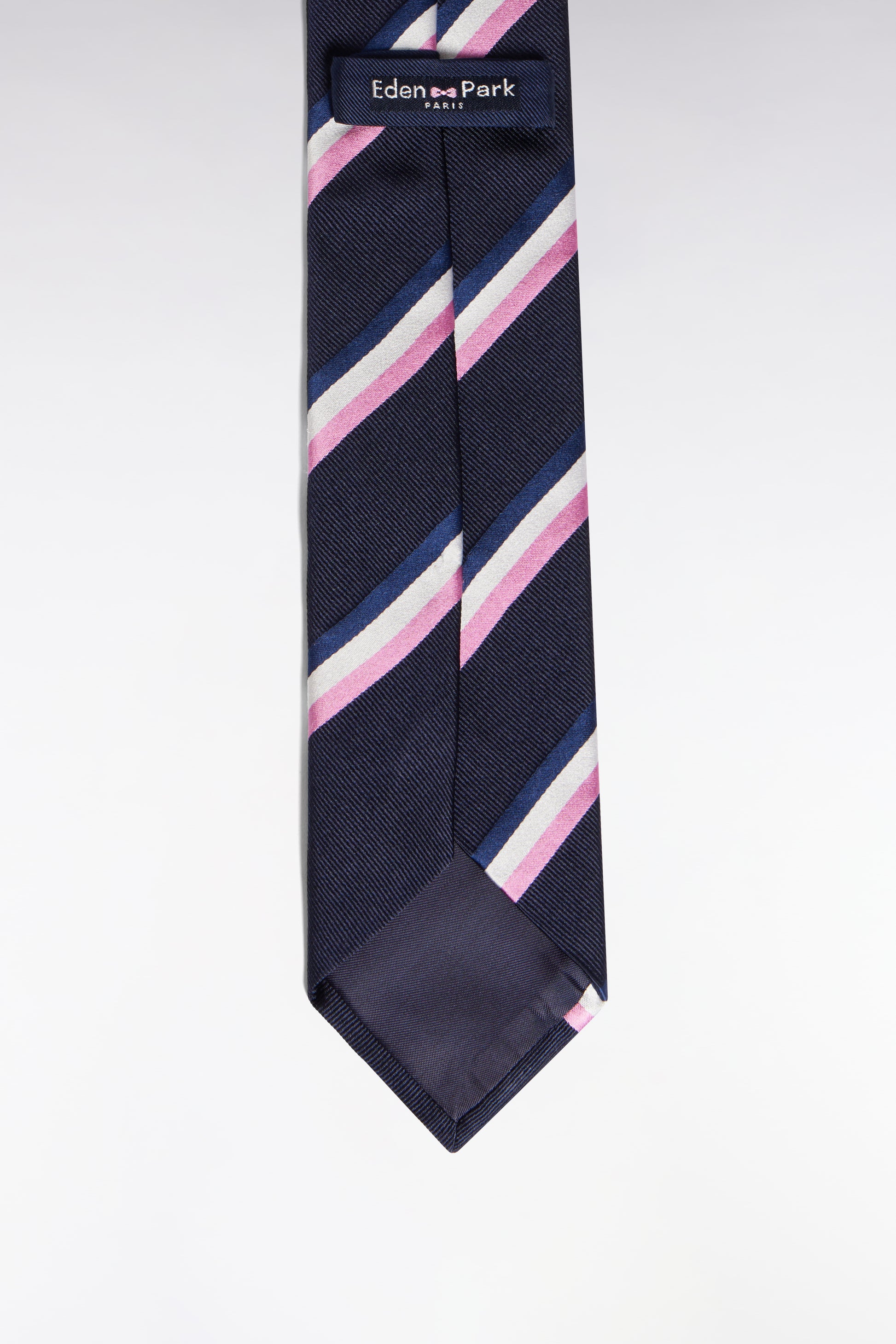 Elegant and resolutely French, this navy tie is distinguished by its tricolored bias stripes. A dynamic, structured pattern that revisits the rugby chic spirit emblematic of our fashion house.
