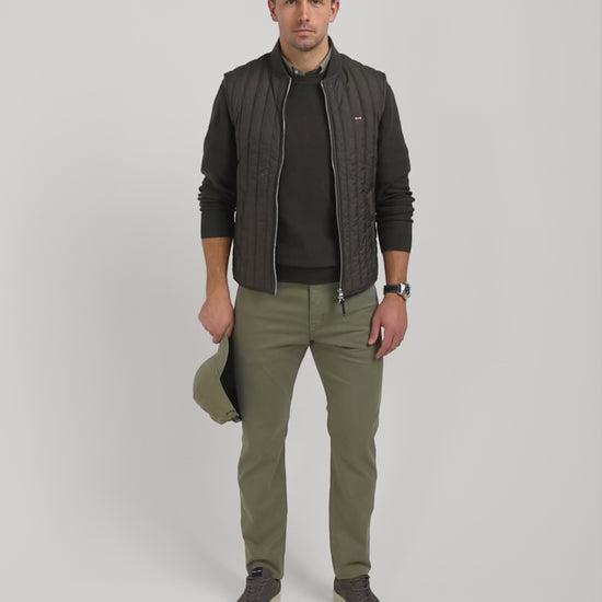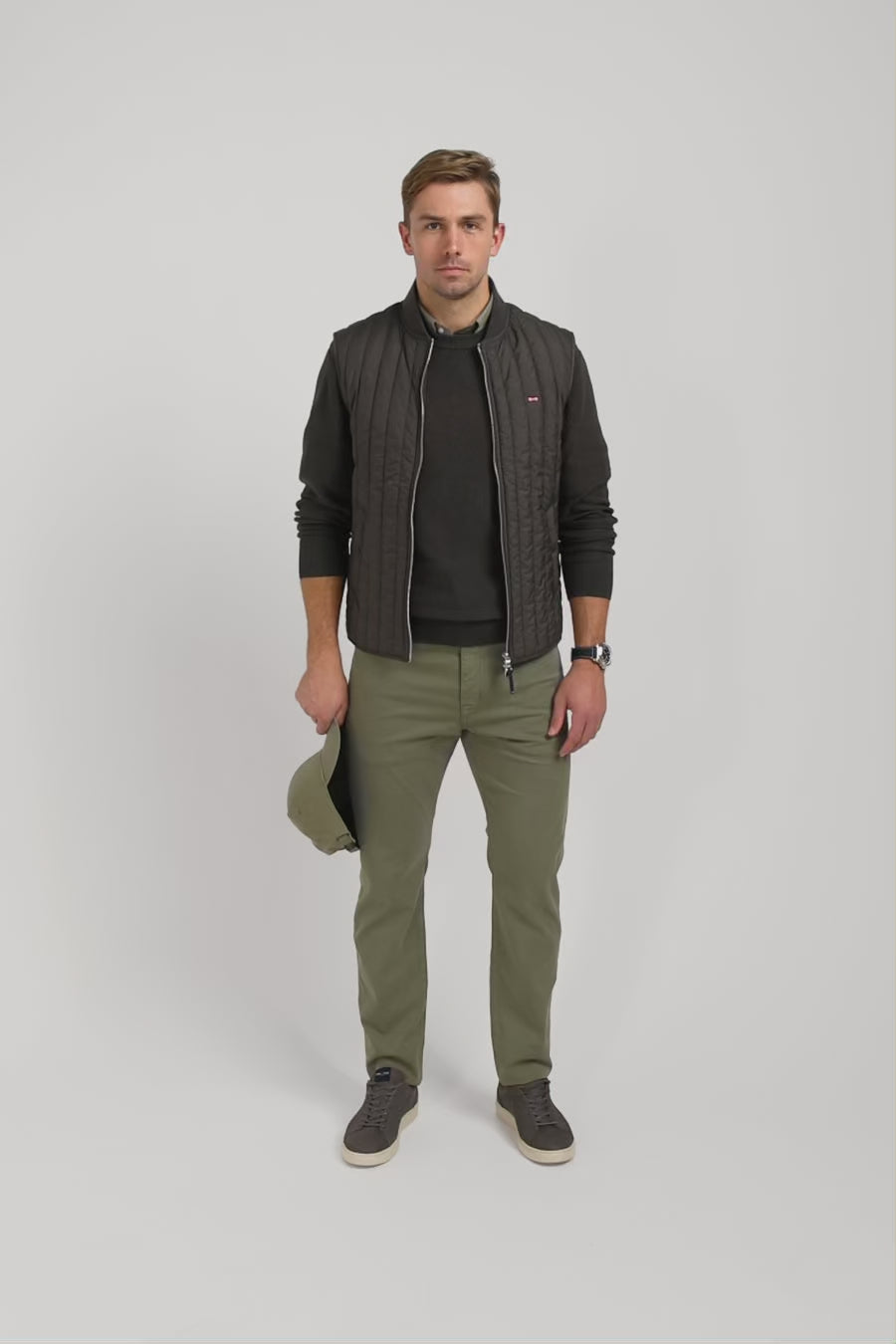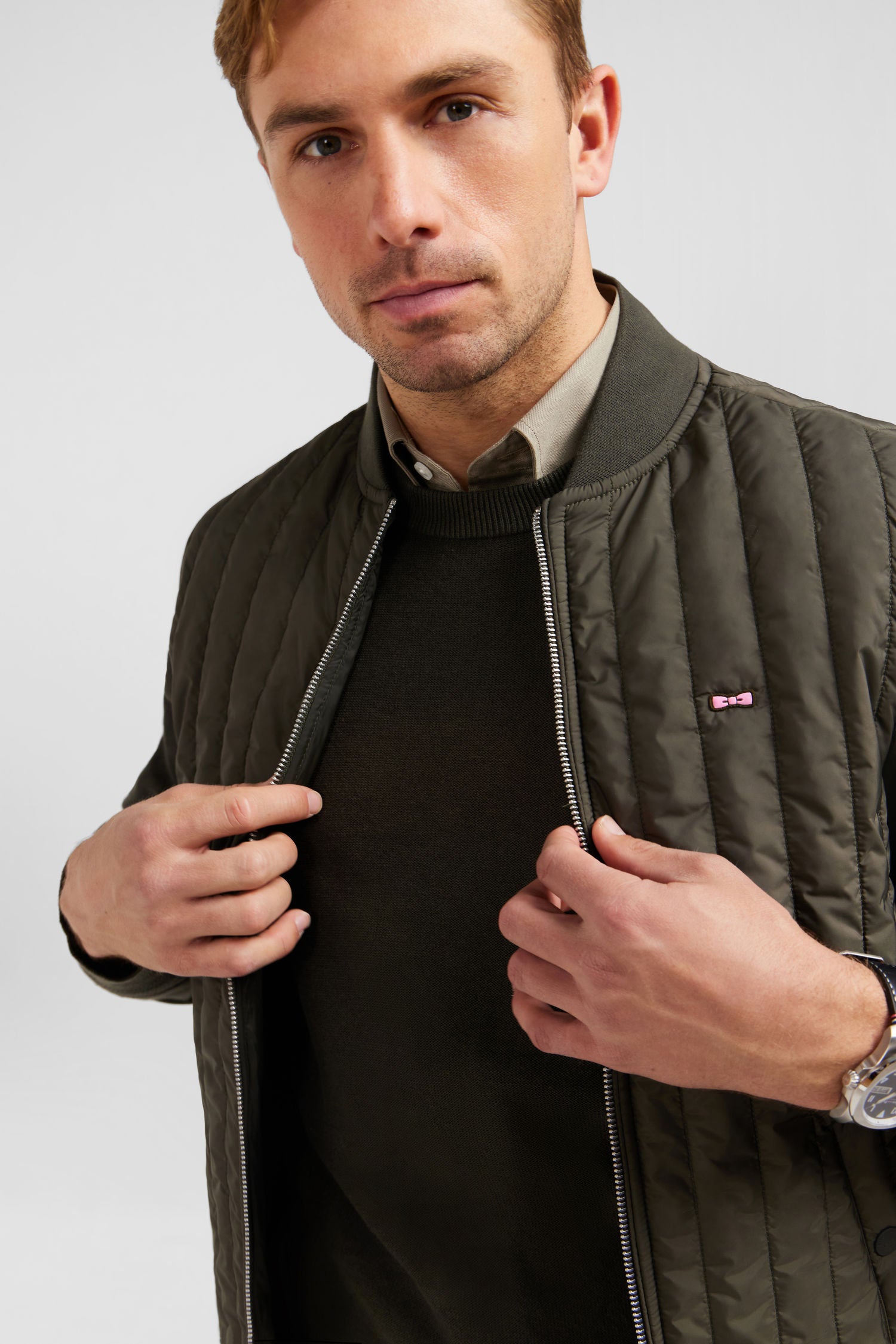 This water-repellent sleeveless down jacket features 2 front snap pockets and a zipper closure.