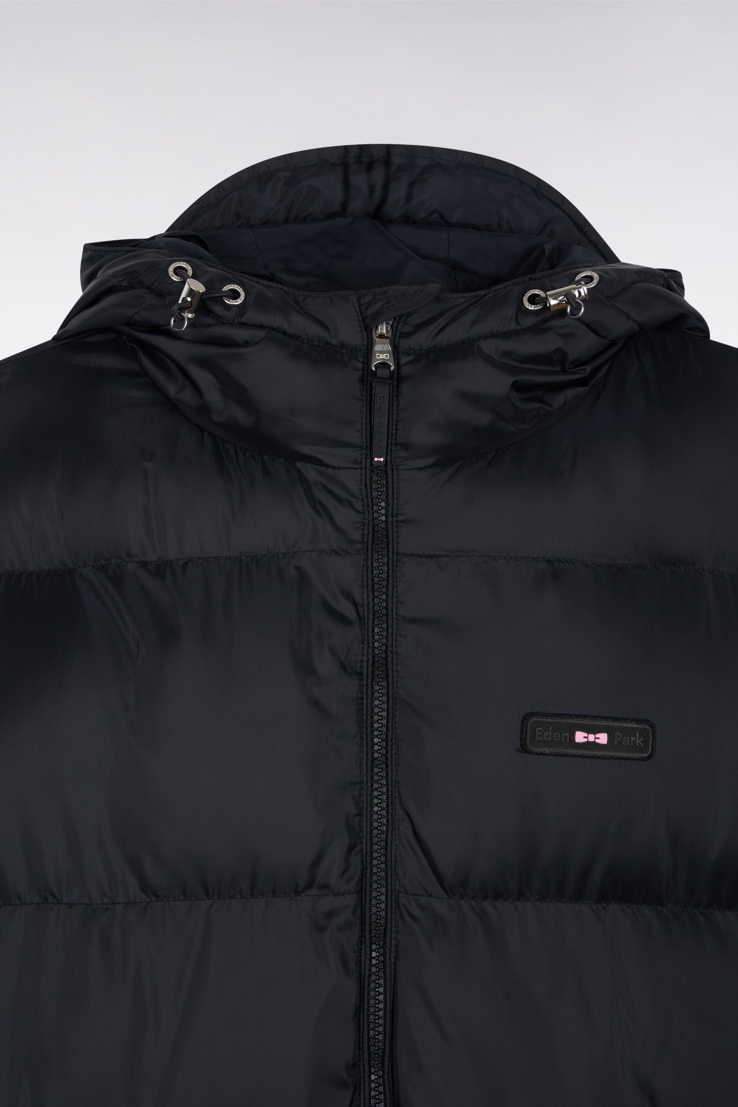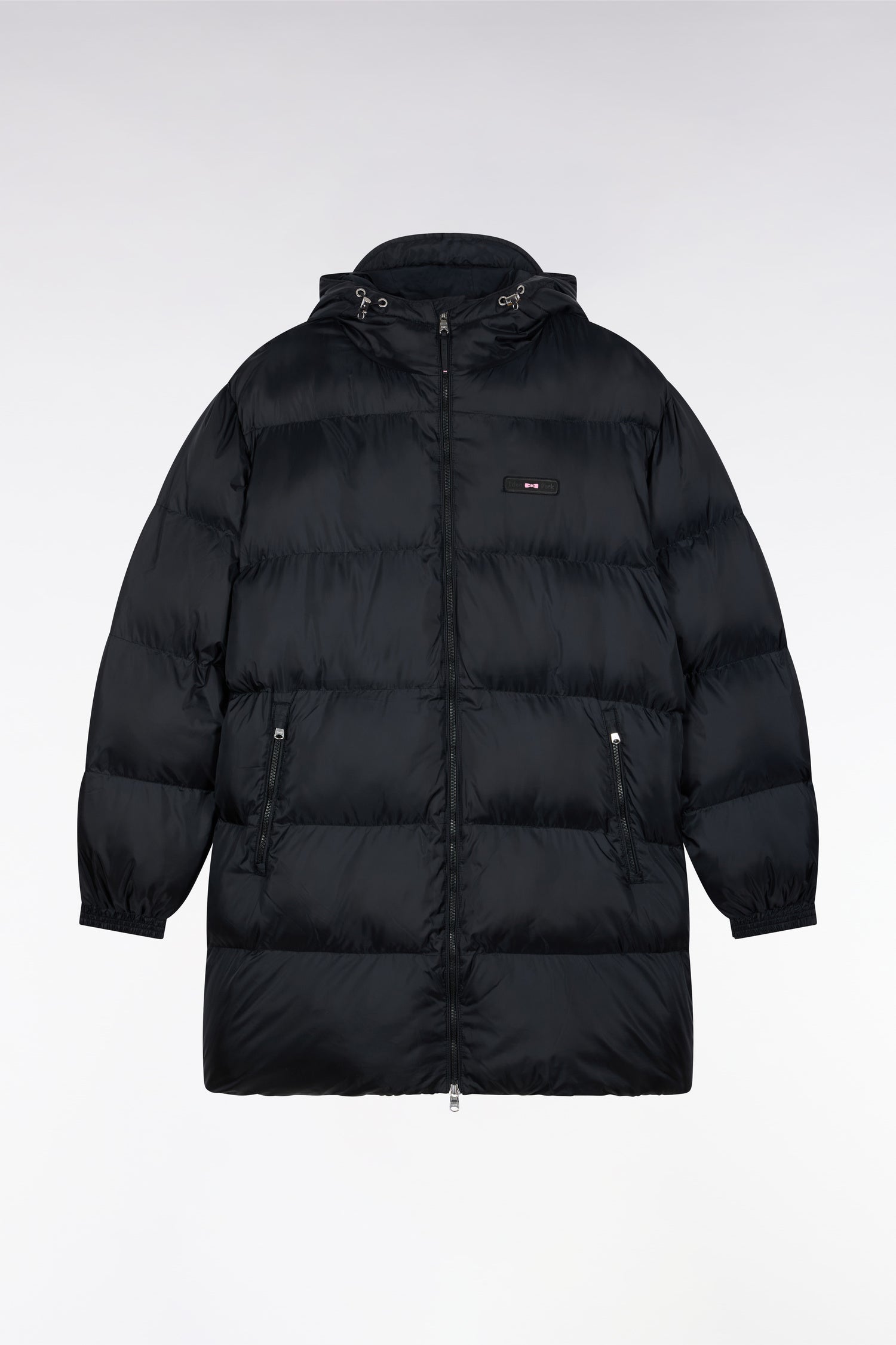 Designed by our design studio to face winter with style, this long down jacket with integrated hood seduces with its generous volume and wide quilting with a subtle shiny finish. Available in black or navy, this men's down jacket combines protection and elegance with silver metal zips, elasticated cuffs with snap tabs and emblematic finishes: tricolor ribbon under the neckline and gum logo bar on the chest.