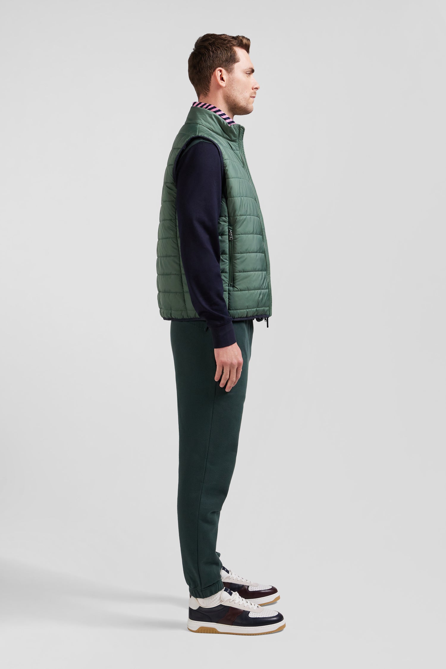Our sleeveless down jacket is ideal for layering. Sturdy nylon, signature zipper, secure pockets, and meticulous finishing touches like bow-tie embroidery and contrast piping on the armhole edge add aesthetic finesse. Perfect for seasonal transitions, this men's sleeveless down jacket goes with any outfit.