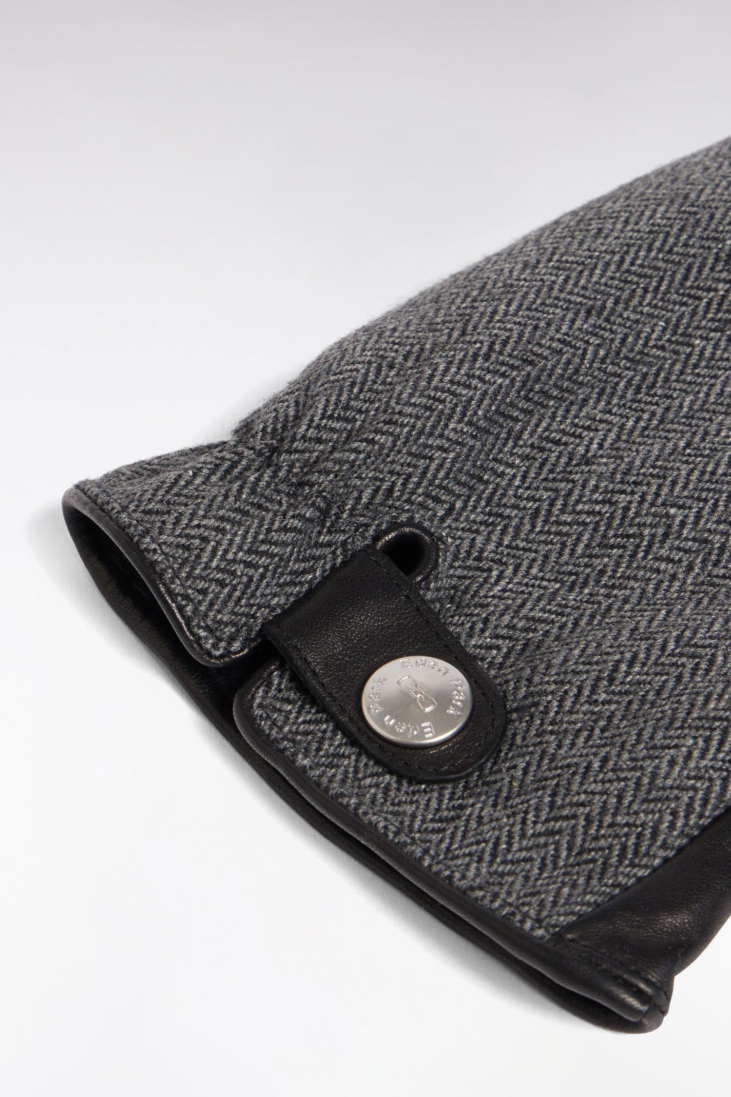 These men's gloves blend retro elegance with contemporary refinement. Their herringbone fabric back is matched by a smooth leather palm and a signature buttoned placket, for a distinguished look down to the smallest detail. A timeless accessory in gray or blue
