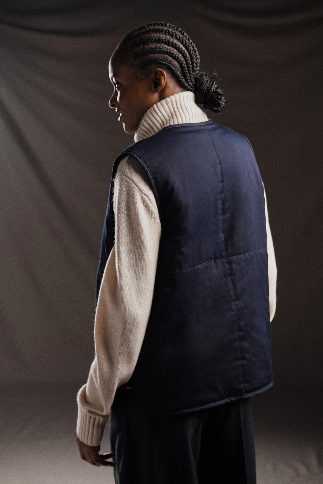 This women’s reversible vest features a solid navy side, while the reverse side is crafted from soft bouclé fabric in navy and black in a quadrant layout—a nod to our iconic cut and sew pattern. This one-of-a-kind piece, created from our atelier’s dormant stock, gives new life to high-quality materials: fabric, wadding, trim, and badges all sourced from our inventory. With a comfortable fit and freedom of movement, this straight-cut, slightly oversized medium-sized vest is a perfect layering companion. Unique piece from the PAP'Atelier upcycled capsule created in Paris, available exclusively on www.eden-park.com for a limited time.