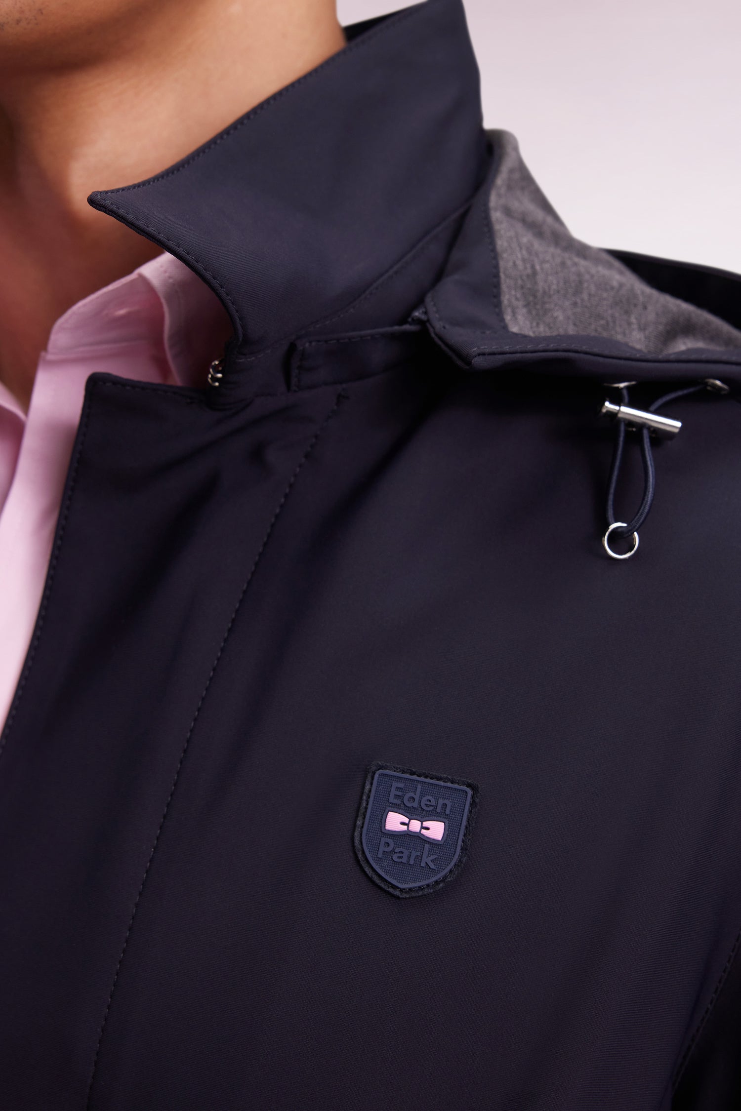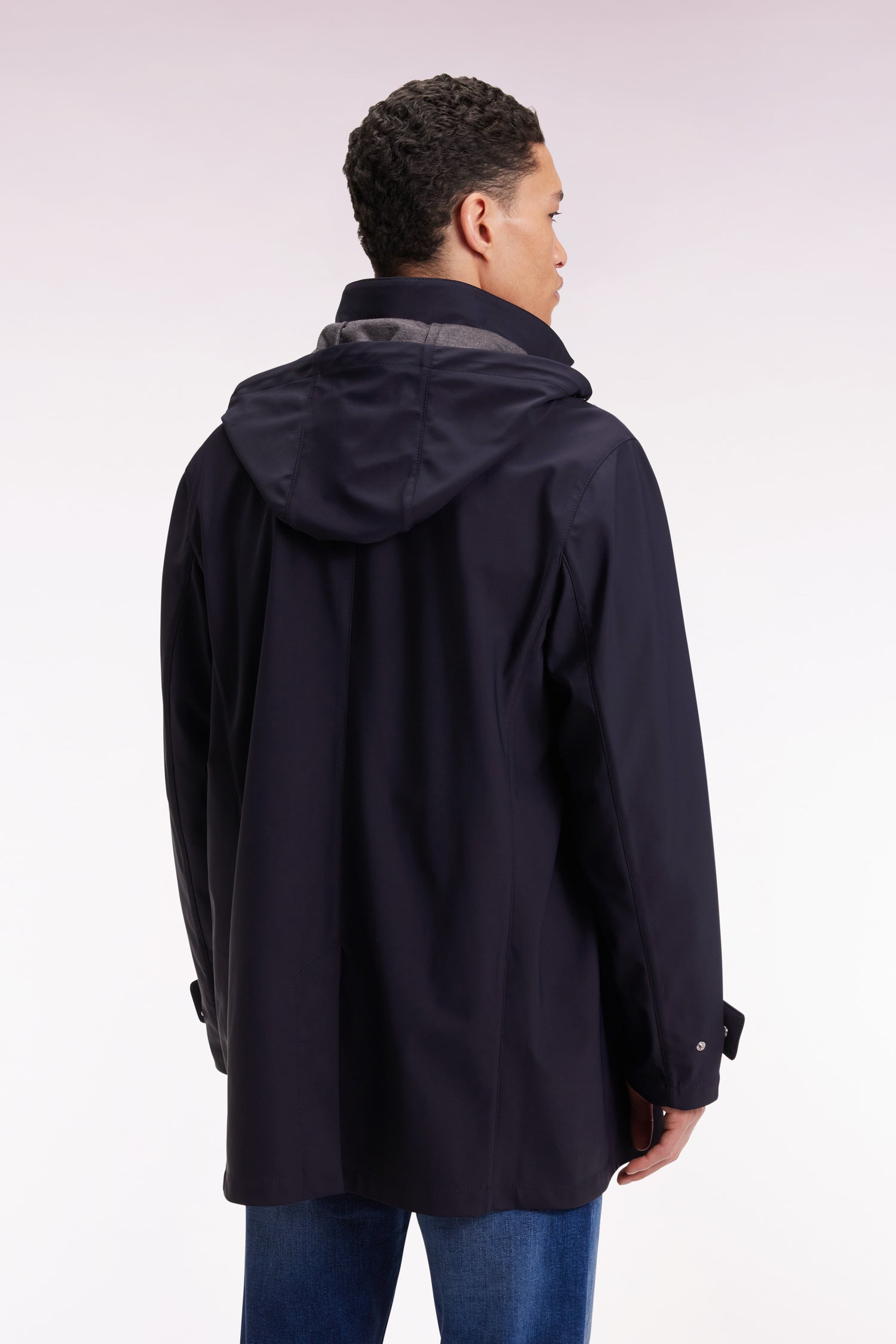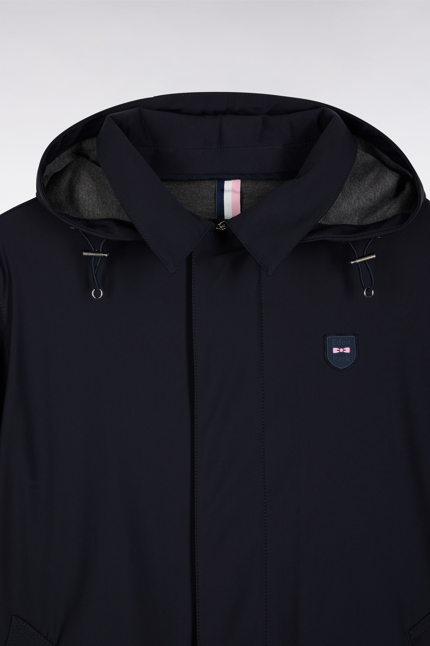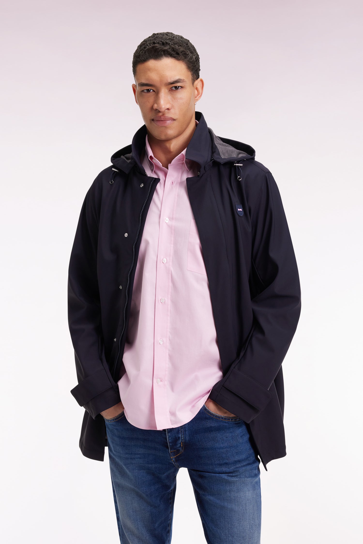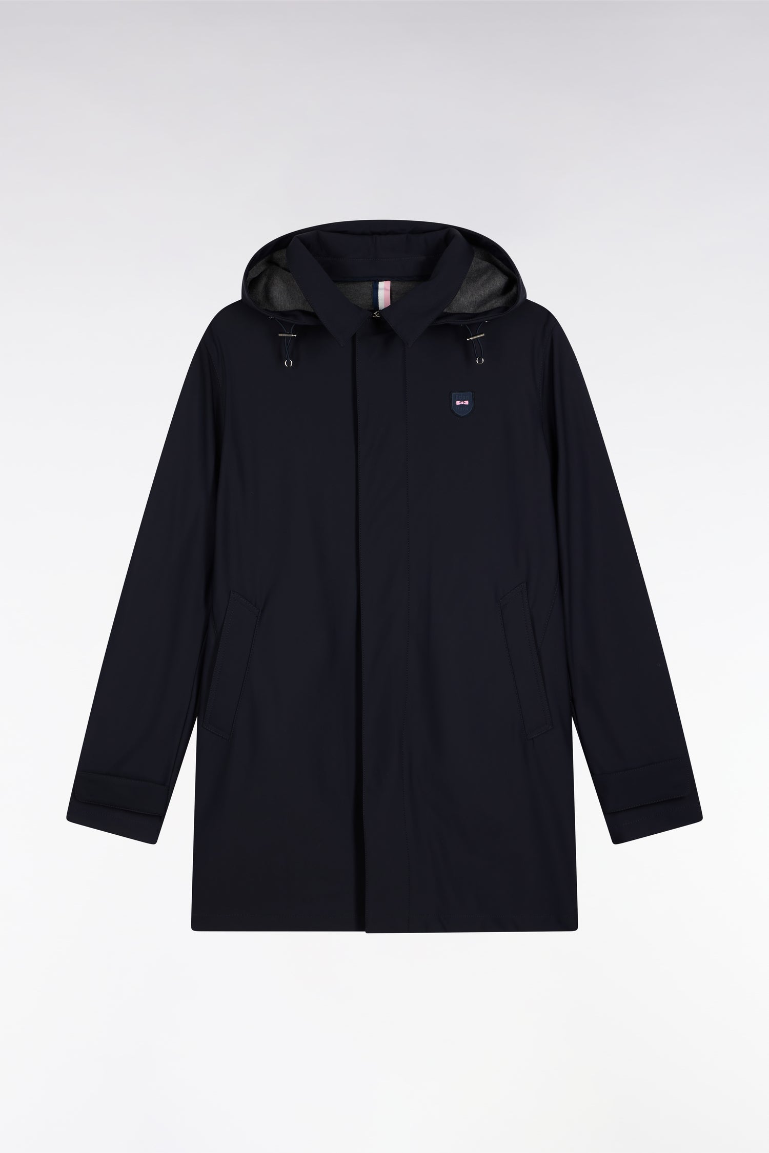 A subtle blend of functionality and refinement, this men's raincoat in double-faced navy jersey embodies a contemporary vision of urban elegance. Its detachable hood, practical double-slider zipper and tone-on-tone finishing contribute to a sober, fluid and well-groomed silhouette. The textured chest patch and tricolor ribbon under the neckline recall the sport-chic identity of our French fashion house.