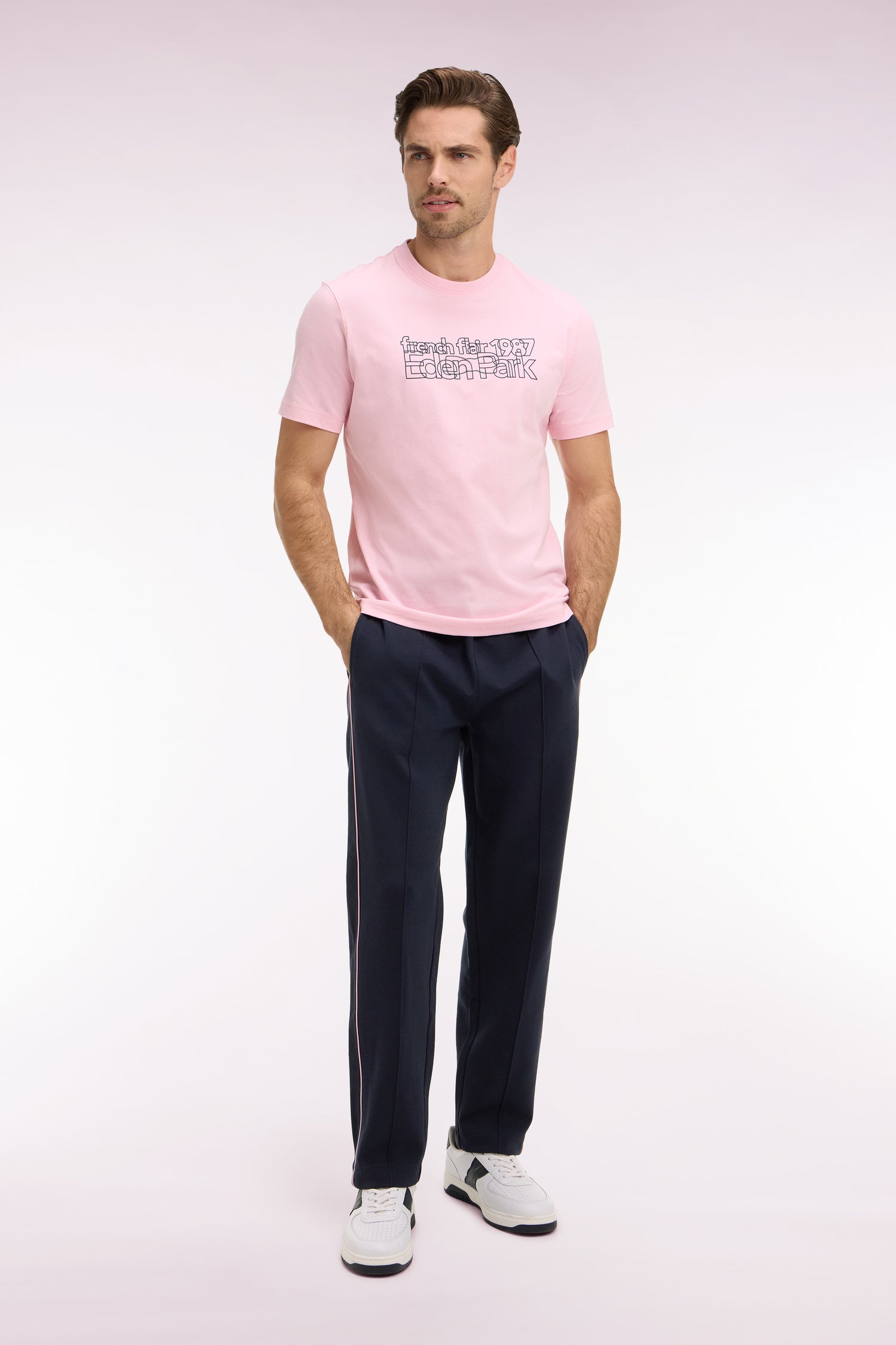 Ce pantalon de jogging masculin réalisé en interlock marine ou noir est conçu pour être porté avec le sweatshirt zippé assorti, promesse d'une allure athlétique. Plus épais que le jersey, il offre chaleur et douceur. Les détails soignés, comme le badge en gomme aligné avec la poche et les passepoils contrastés le long des jambes, soulignent l’attention aux détails propre à notre Maison. Sa ceinture élastique et son cordon de serrage assurent un ajustement parfait pour un style confortable et travaillé à la fois. En été, associez-lui simplement un tee-shirt ou un polo à manches courtes dans un piqué coton assorti.