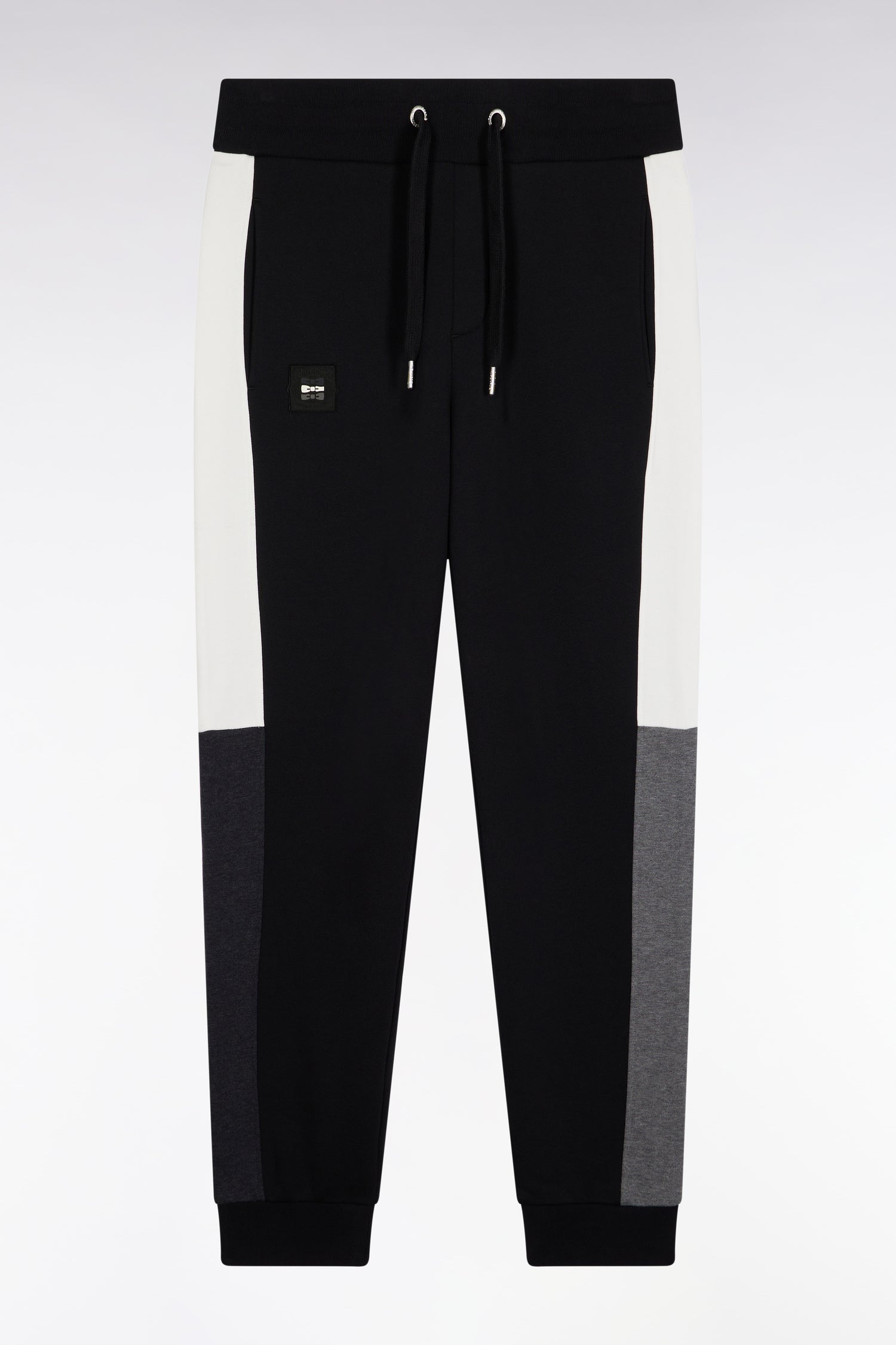 These men's cotton fleece joggers feature contrasting stripes down the legs for a graphic touch, reminiscent of Eden Park's signature colorblock combinations. Ideal for pairing with a matching sweatshirt, jersey or T-shirt for a sporty-chic silhouette. Available in black or navy, with contrasting stripes in shades of gray and ecru or pink and sky.