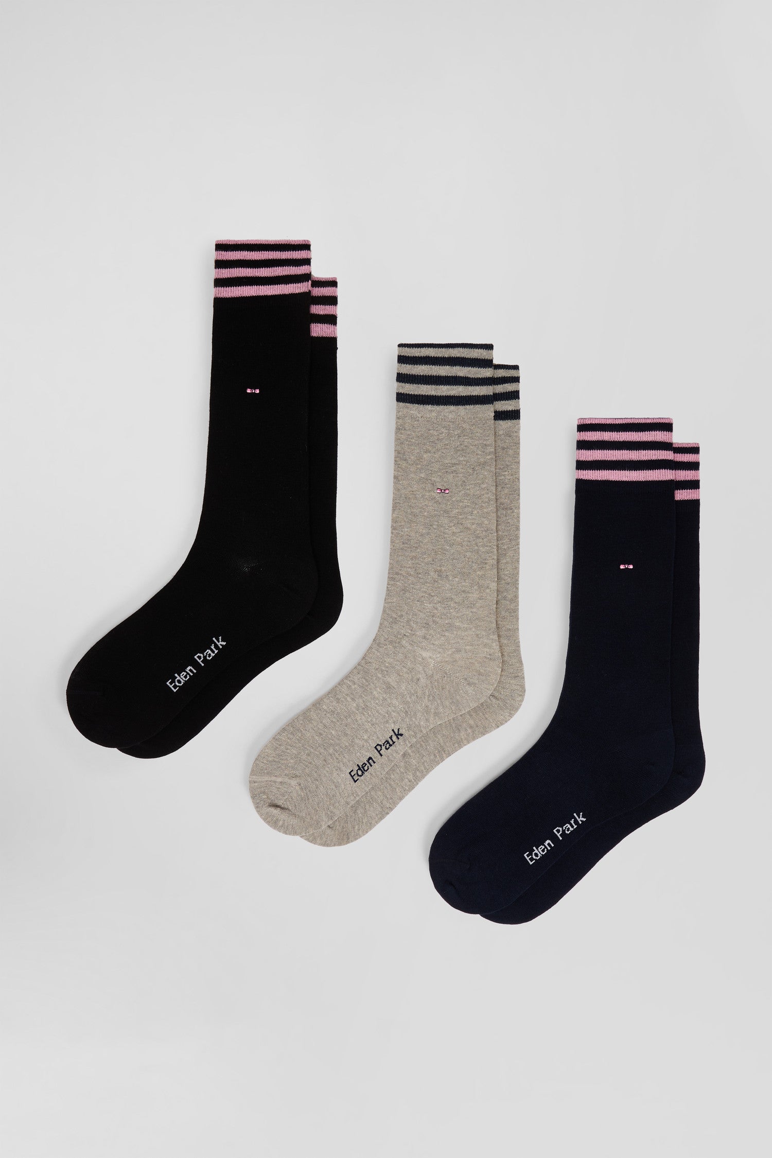 Our horizontal striped knee-high socks are a must-have. This set of three pairs of socks in different colors, available in navy, gray or brown, will fit in perfectly with your spring-summer wardrobe, as well as your timeless favorites.
