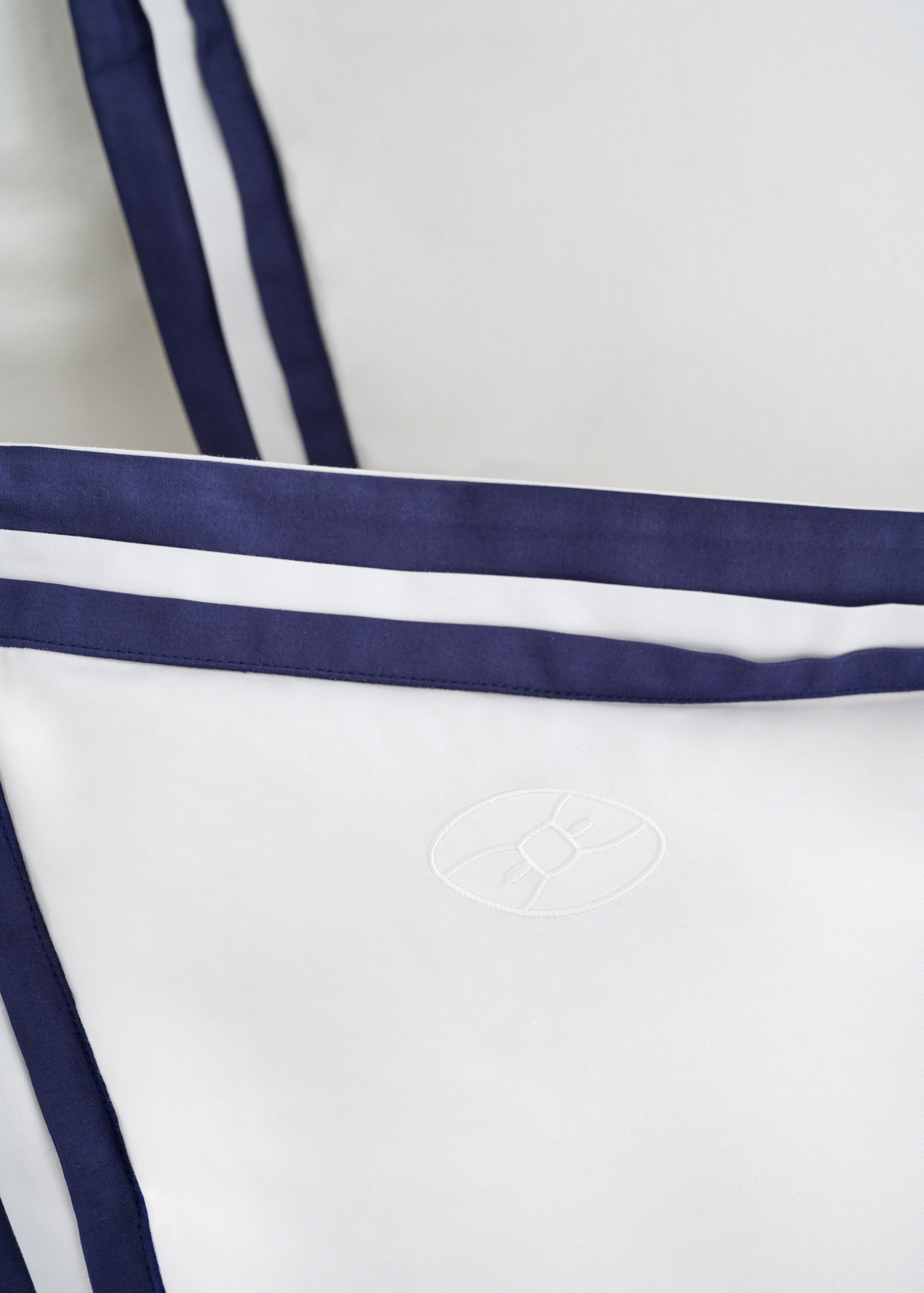 Delicate and comfortable, these rectangular pillowcases in white cotton percale are enhanced by a neat navy border. A chic essential for an elegant bed, paired with the matching comforter cover. These two luxurious pillowcases are made in Portugal in partnership with Amalia Home Collection, a company that has set the benchmark for home linen since it was founded in 1922. These soft cotton pillowcases are also available in square format.