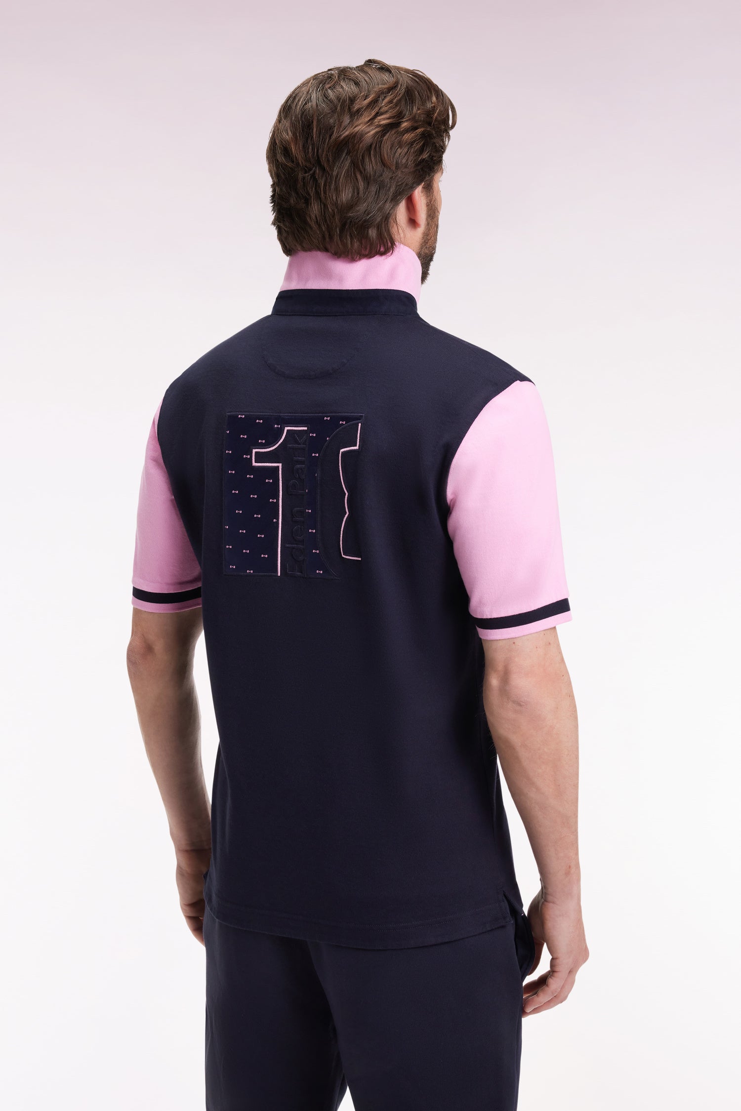 With contrasting pink sleeves and collar on a navy base, this cotton jersey shirt embodies the subtle audacity of the Eden Park wardrobe. Comfortable and easy to wear, it features the House's signature finishes, from the button-down collar to the bow-tie embroidery, for a sporty-chic silhouette with casual elegance. A statement of style, its back is enlivened by a large embroidery inspired by our rugby heritage.