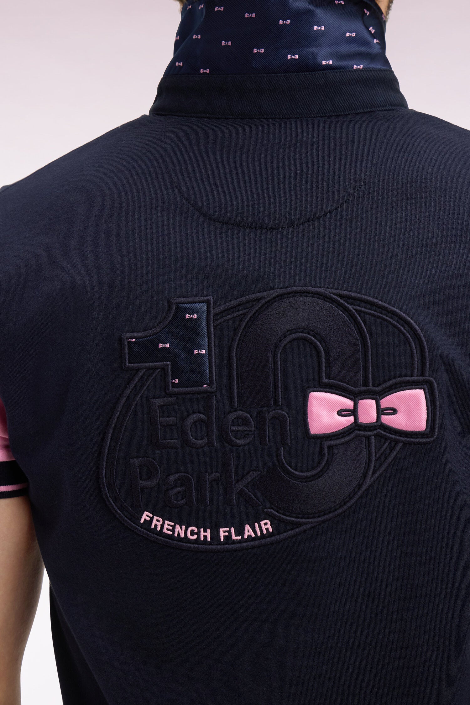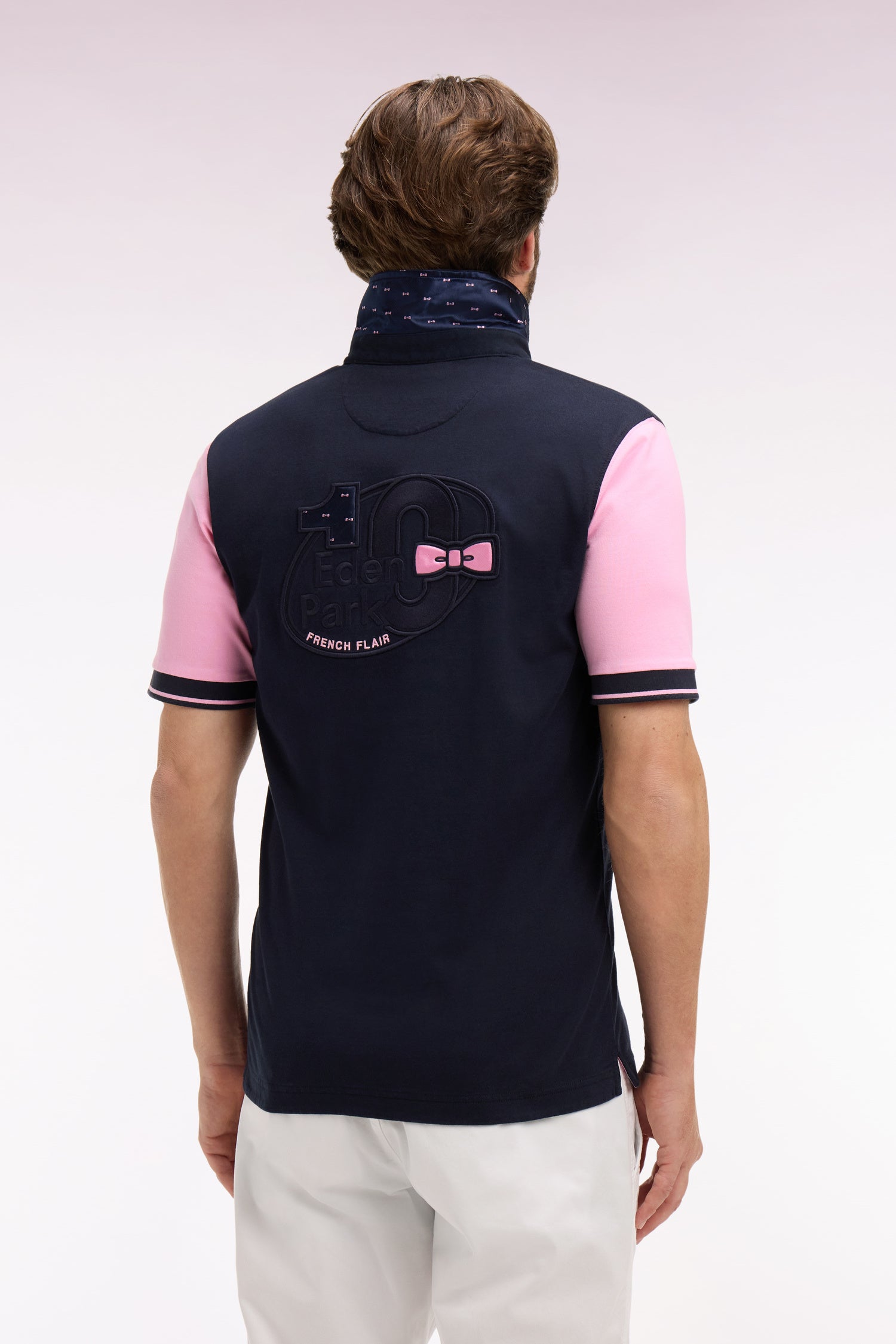 Ce maillot à manches courtes en jersey de coton bicolore offre une alternative au polo masculin. Ce modèle à la coupe regular affirme son style par ses finitions soignées comme sa broderie nœud papillon rehaussée d'un tissu cravate rayé également présent sous son col maillot. Ce modèle fait la synthèse de l'élégance French Flair et des codes de l'ovalie chers à notre Maison française.