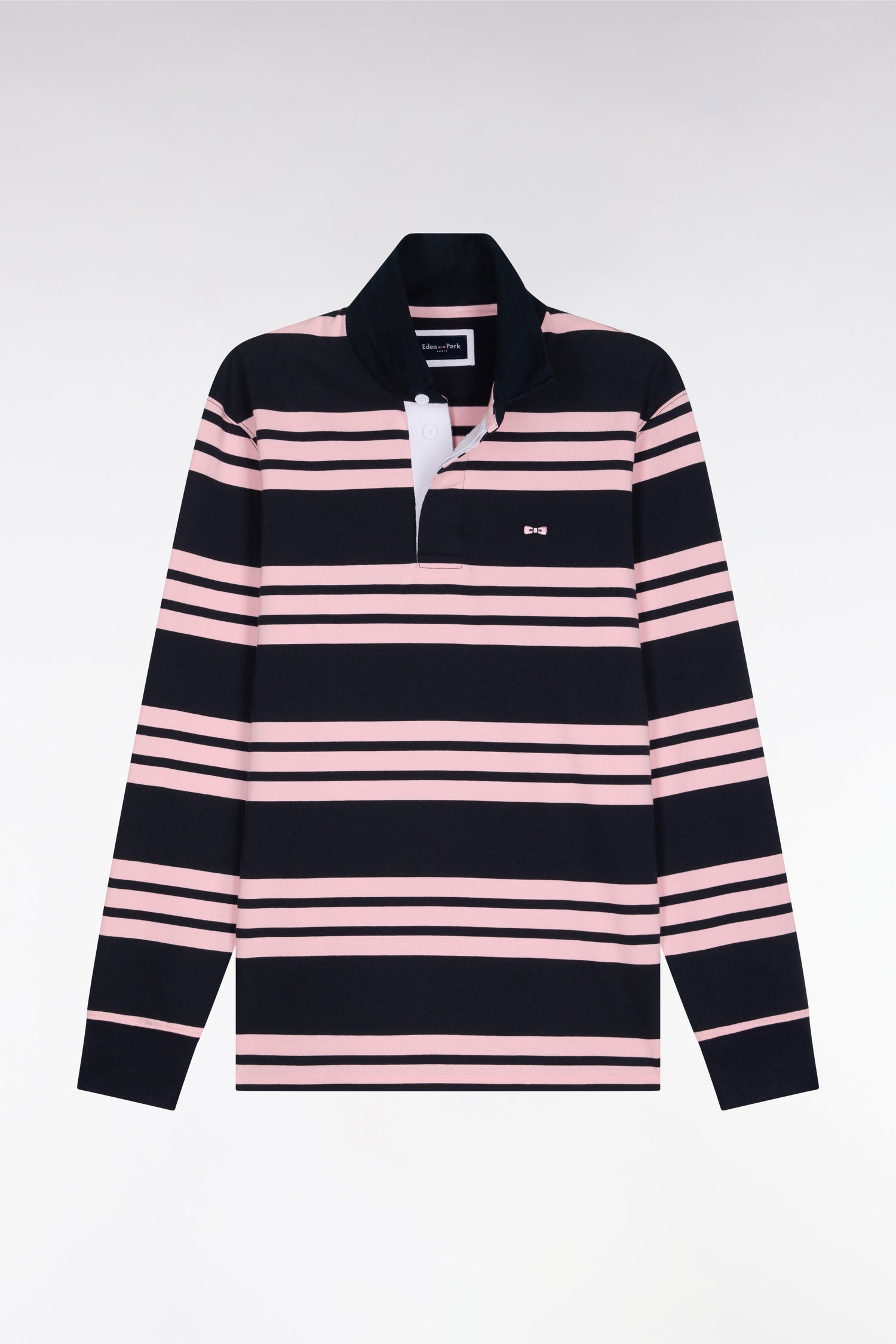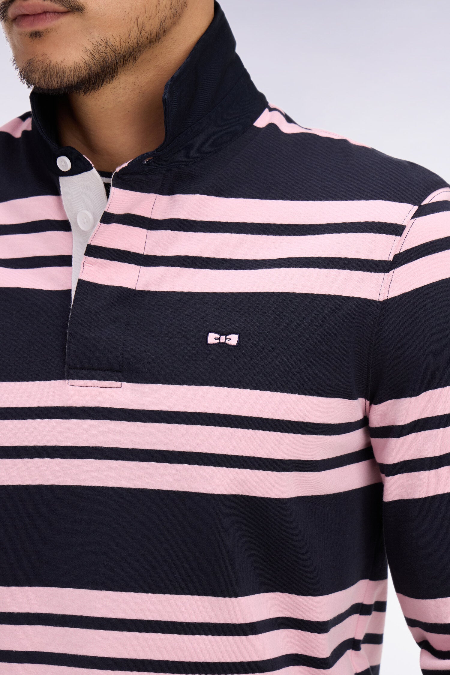 Des rayures et une allure sport-chic, ce maillot de rugby à manches longues a tout juste. Réalisé dans un coton doux il accompagne chaque moment avec élégance. L'association du marine et du rose, rehaussée par la broderie nœud papillon, signe cette pièce du premier regard. Un maillot masculin idéal pour apporter une touche graphique subtile à une tenue de tous les jours.