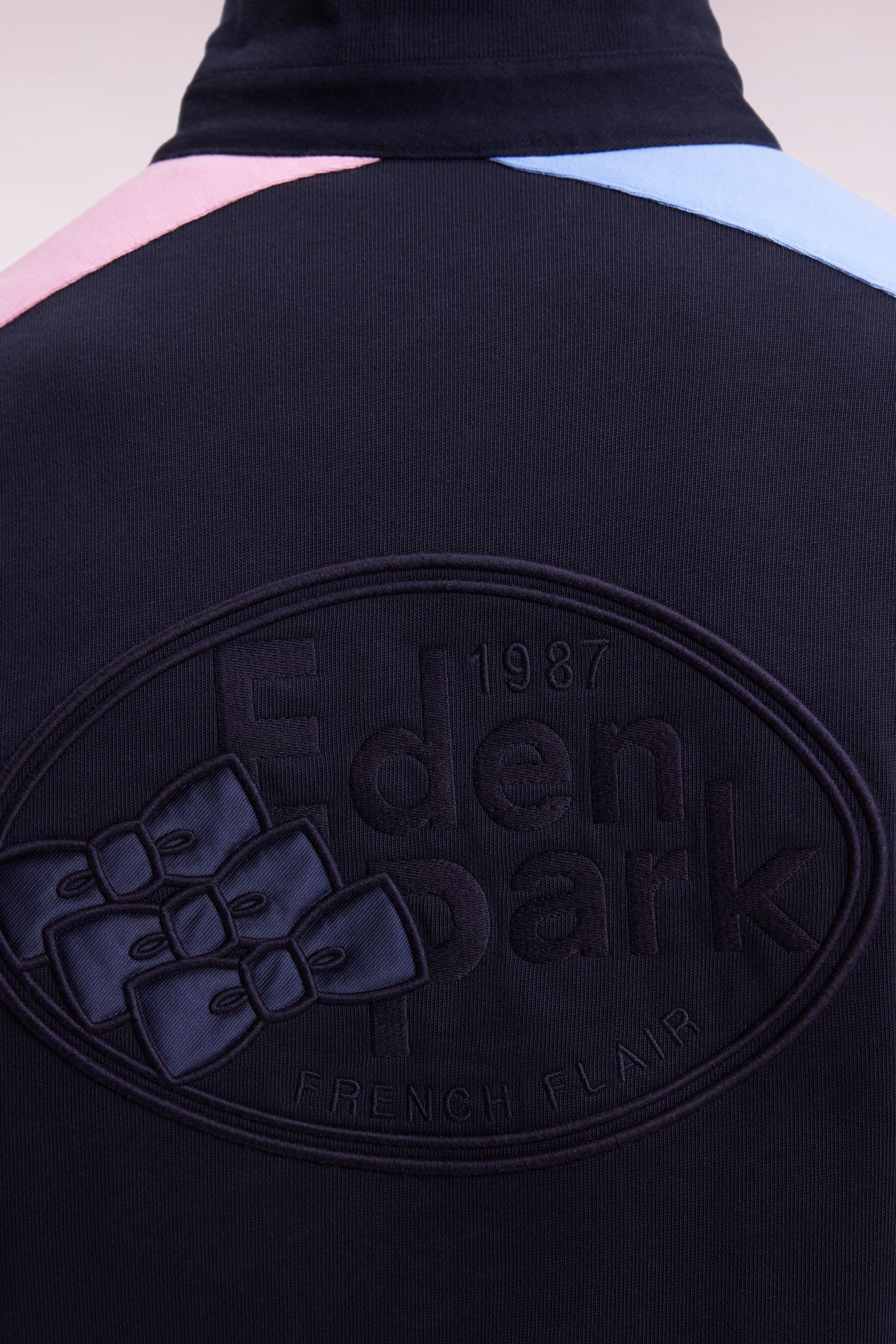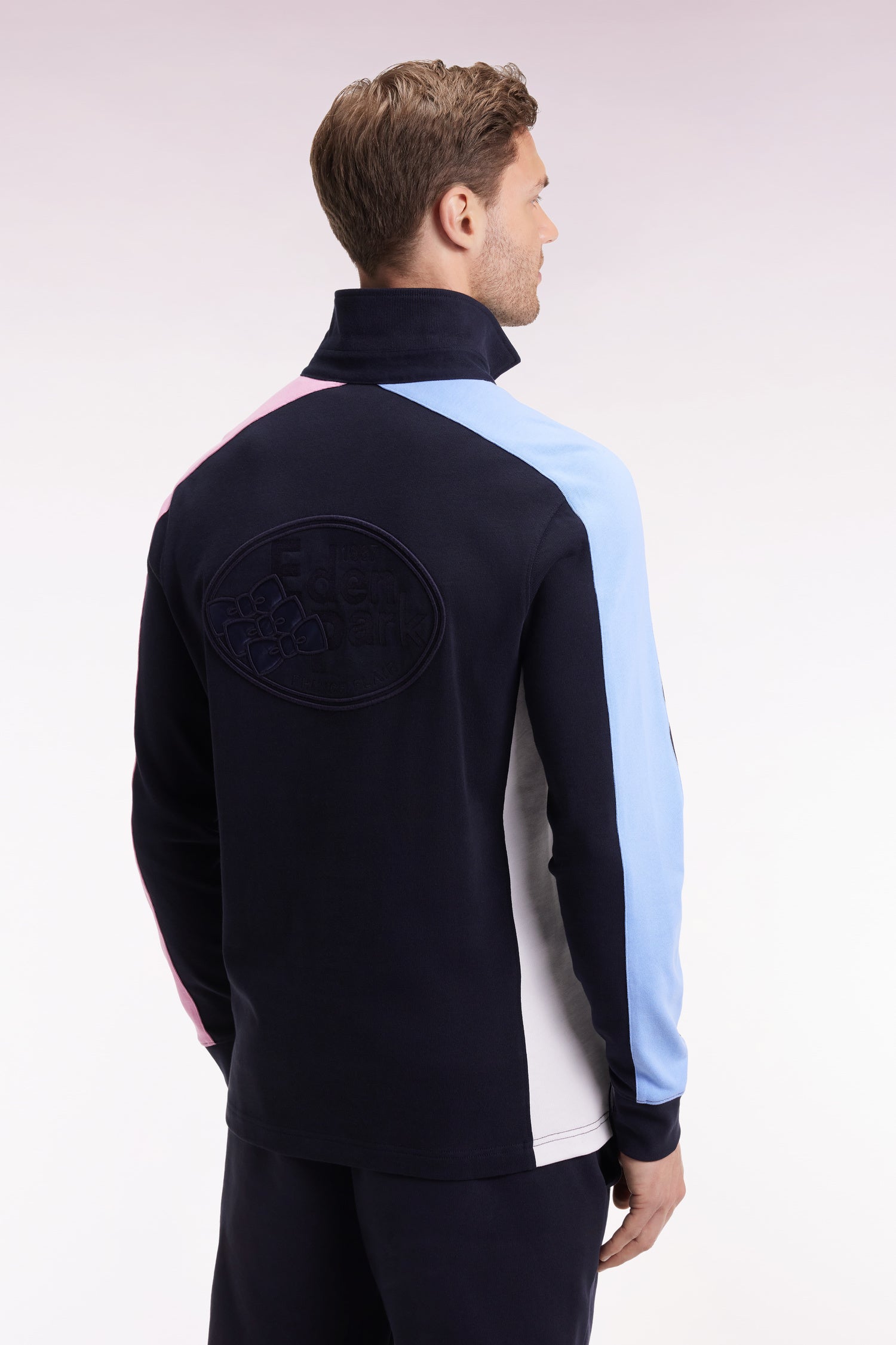 This thick jersey long-sleeve jersey features contrasting cutouts on the sleeves and embroidery on the back, enhanced by tone-on-tone tie fabric inlays for a mastered sporty look. The twill collar features a flat-knit underside, while ribbed cuffs ensure a comfortable fit. An essential sporty-chic piece combining style and rugby details such as the contrasting button placket and ovalie-inspired buttons.