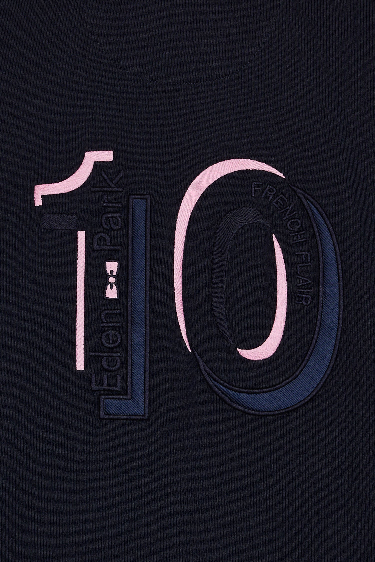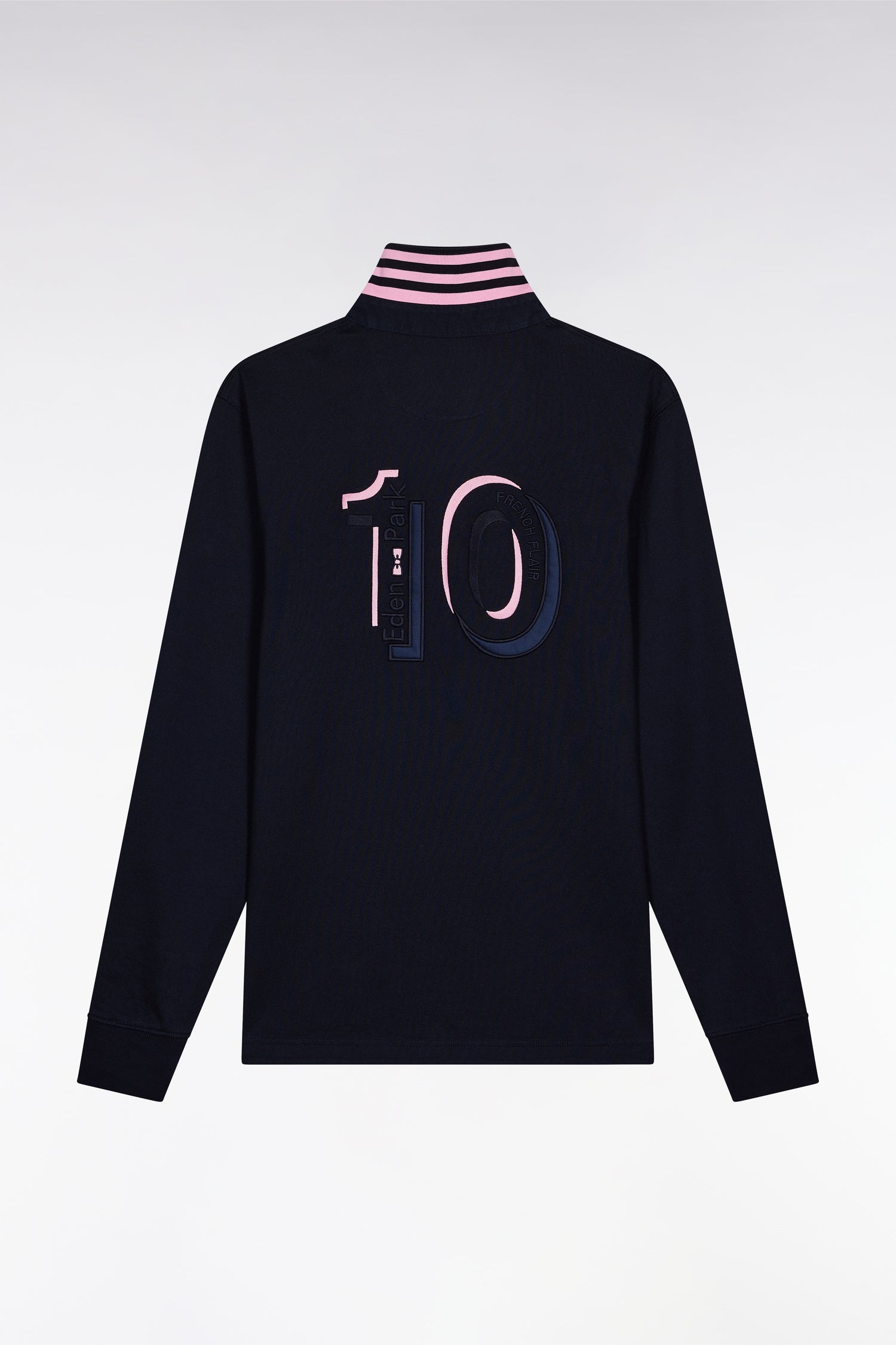 Inspired by our company's iconic rugby jerseys and the French marinière, this long-sleeved model revisits the codes of the sport-chic wardrobe with contrasting stripes at the front and embossed back embroidery with inlaid tie fabric. Its twill collar lined with striped ribbing and meticulous finishing reinforce the graphic, structured character of this swimsuit. A contemporary essential for a dynamic, elegant masculine silhouette