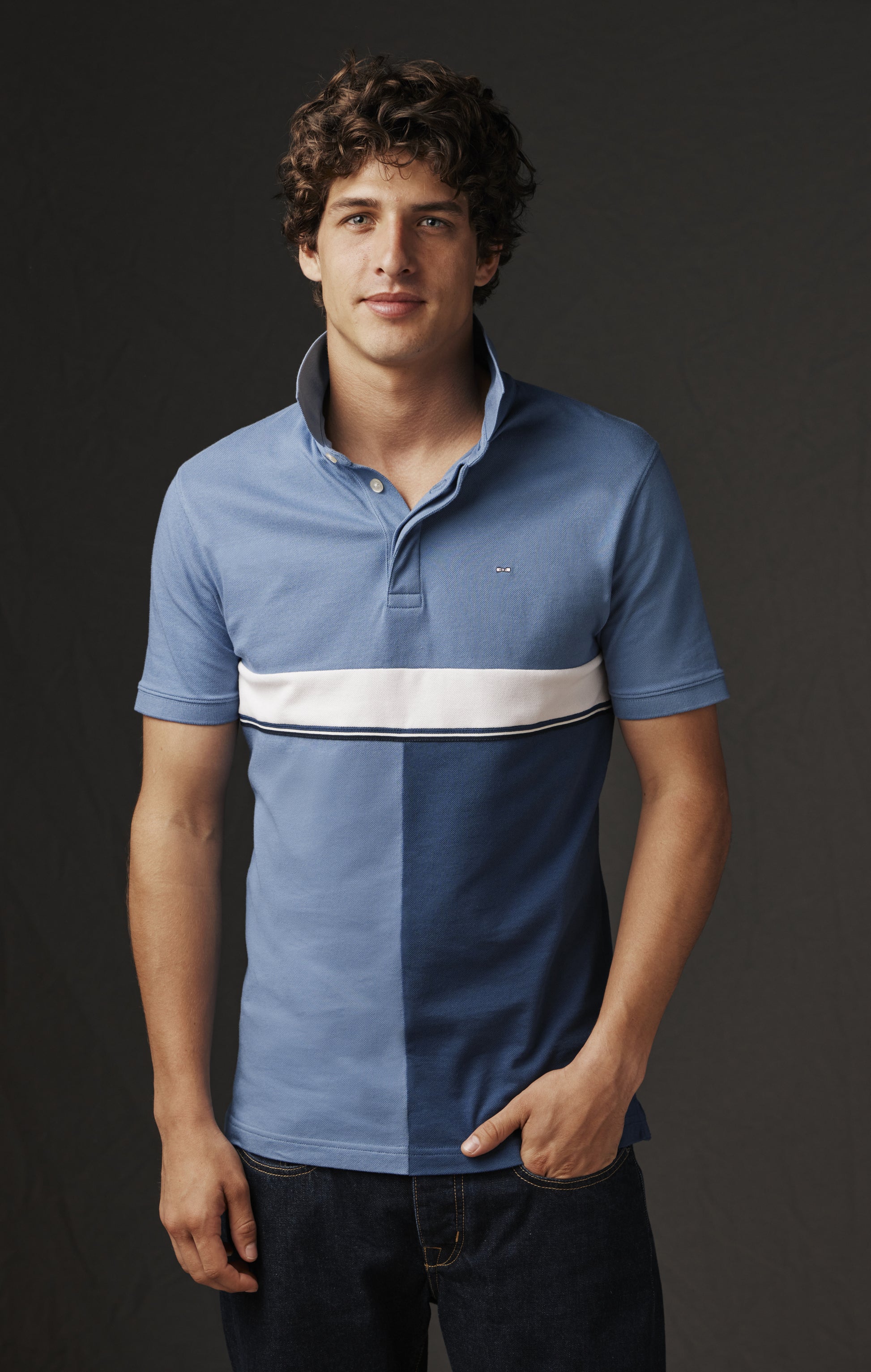 For this short-sleeved jersey from our new Pap'Atelier capsule, our Parisian atelier has imagined a graphic play that mirrors a second model. Both are based on two stretch cotton jerseys, one light blue, the other dark blue, carefully selected from our archives. Each model combines these shades, reversing their placement to create an original contrast. Cut and reassembled in patchwork, the panels are enhanced by a striped braid and a white stripe, both from our dormant stocks. This unique light-blue upper-body model, available only in size M and as a one-off on our site for a limited time, illustrates Eden Park's commitment to sublimating every resource and offering sustainable fashion with a singular style.