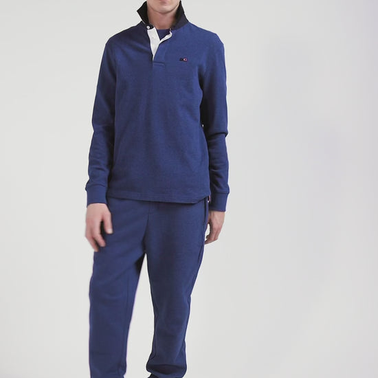 This discreetly elegant long-sleeved men's jersey, with its tricolored ribbon collar enhanced by a pink cotton twill underside, is enhanced by a large embroidery on the back featuring a tricolored bow tie, the Eden Park hallmark also used on a rubber badge on a felt base to adorn its bib. A harmonious blend of colors and high-quality materials gives this masculine piece a refined yet sporty allure.