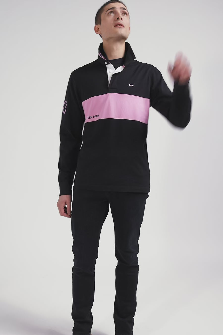 The iconic men's jersey in cotton jersey sports all the hallmarks of our House. The soft navy cotton is enhanced by a broad pink stripe, a reminder of its emblematic Eden Park finishing touches, such as the pink bowtie embroidery, the number 10 sleeve and the circled collar.