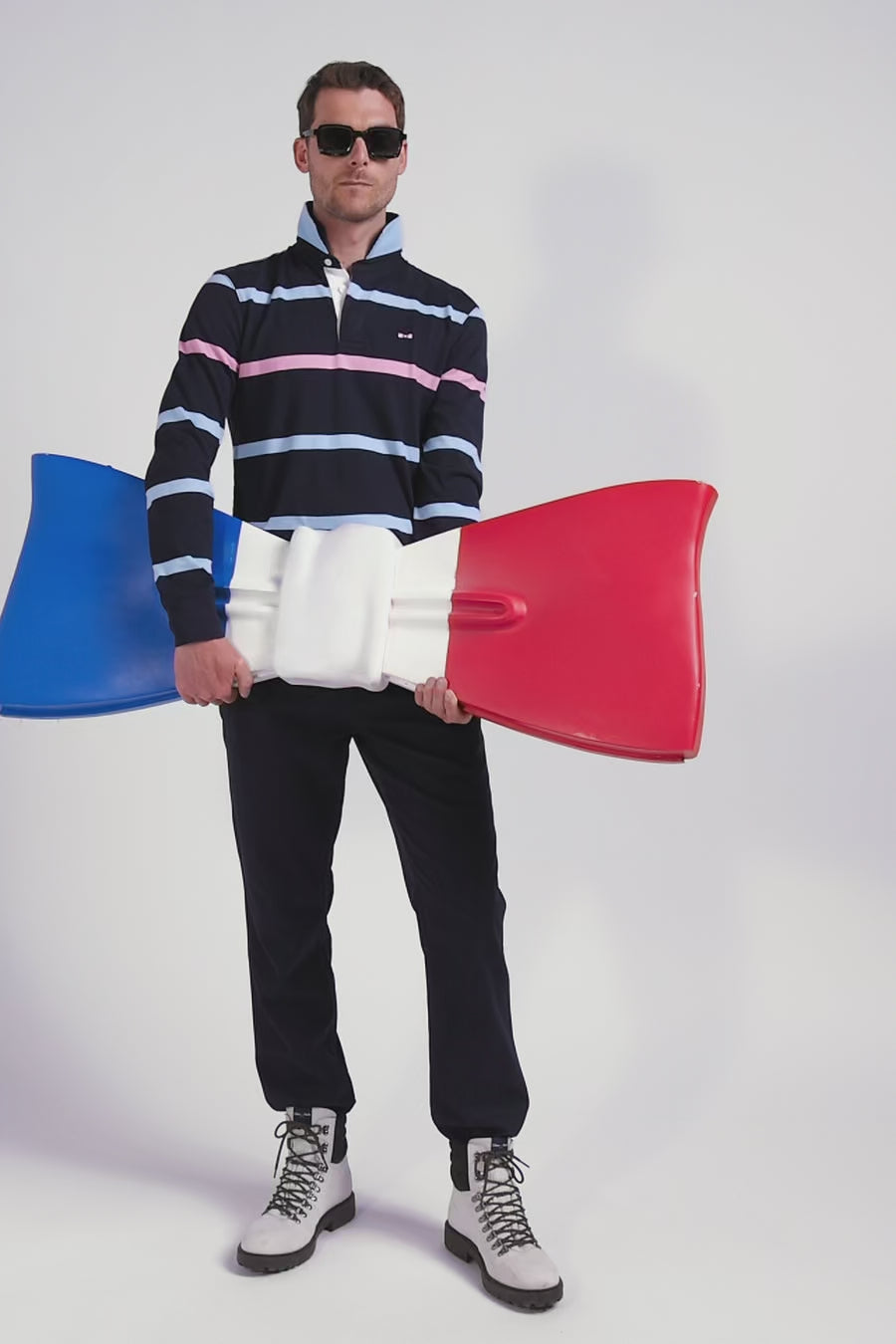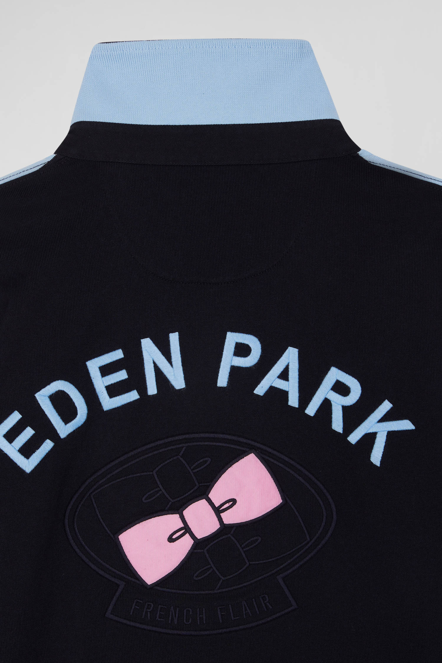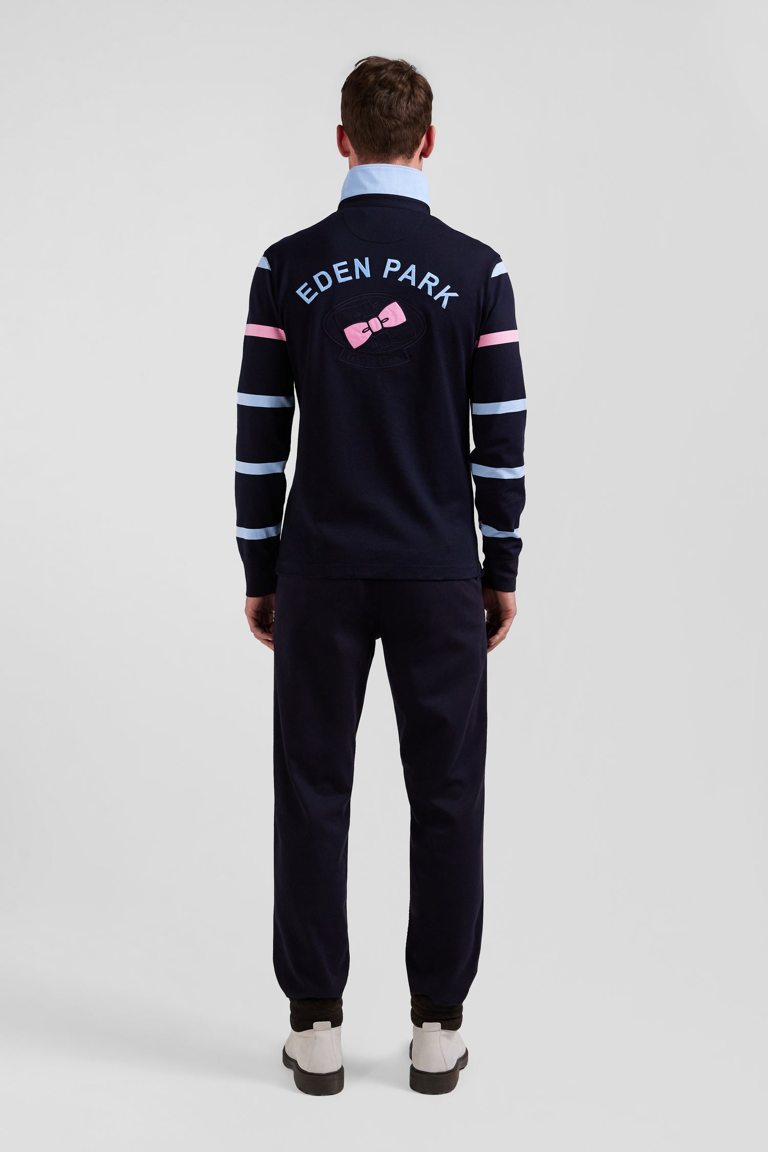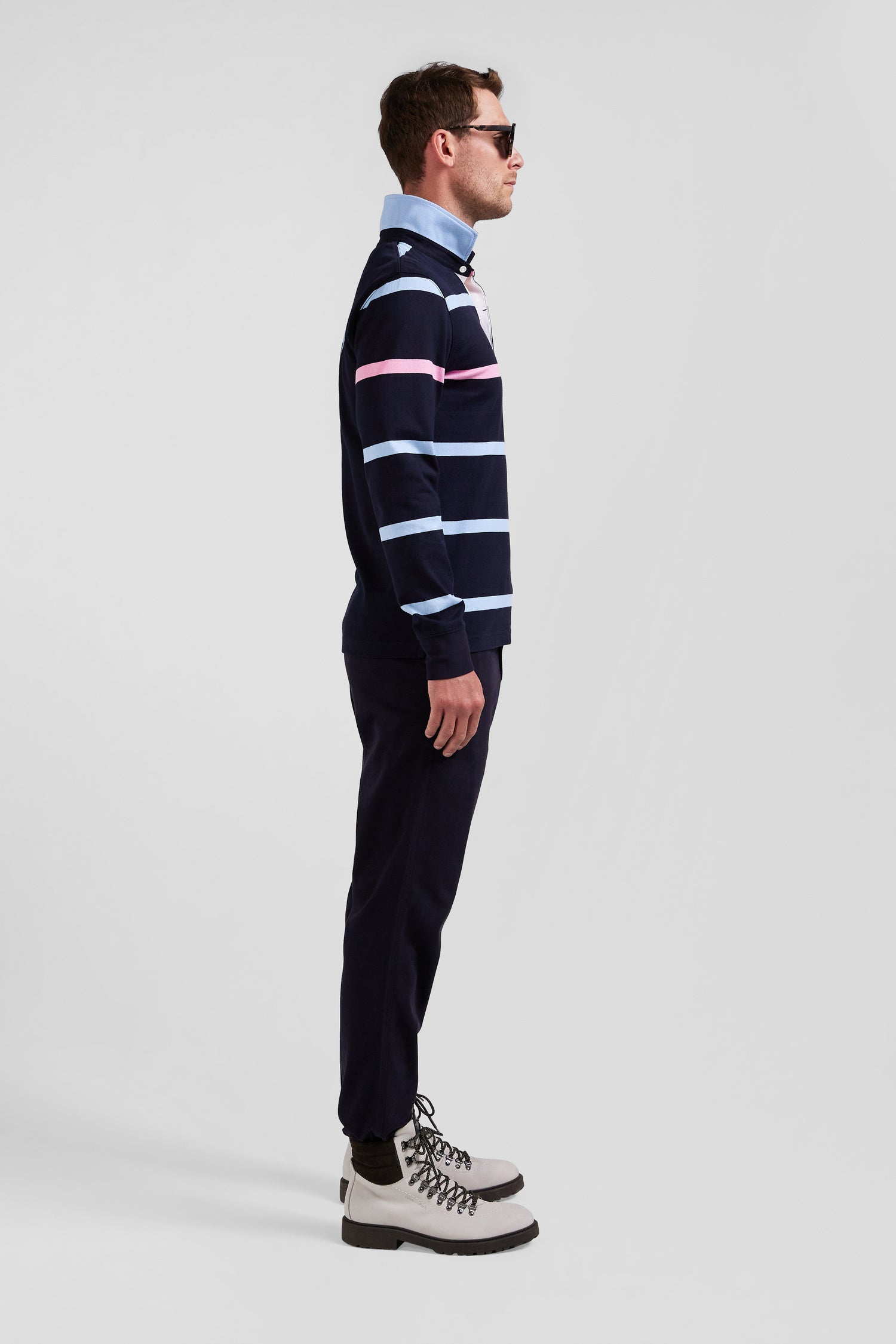Regular navy and sky blue striped long-sleeved cotton rugby shirt with back embroidery