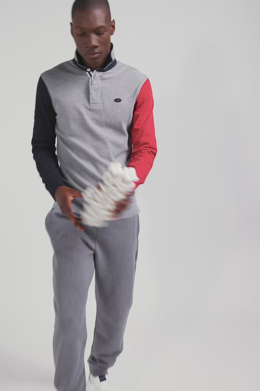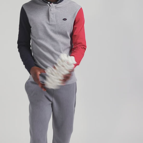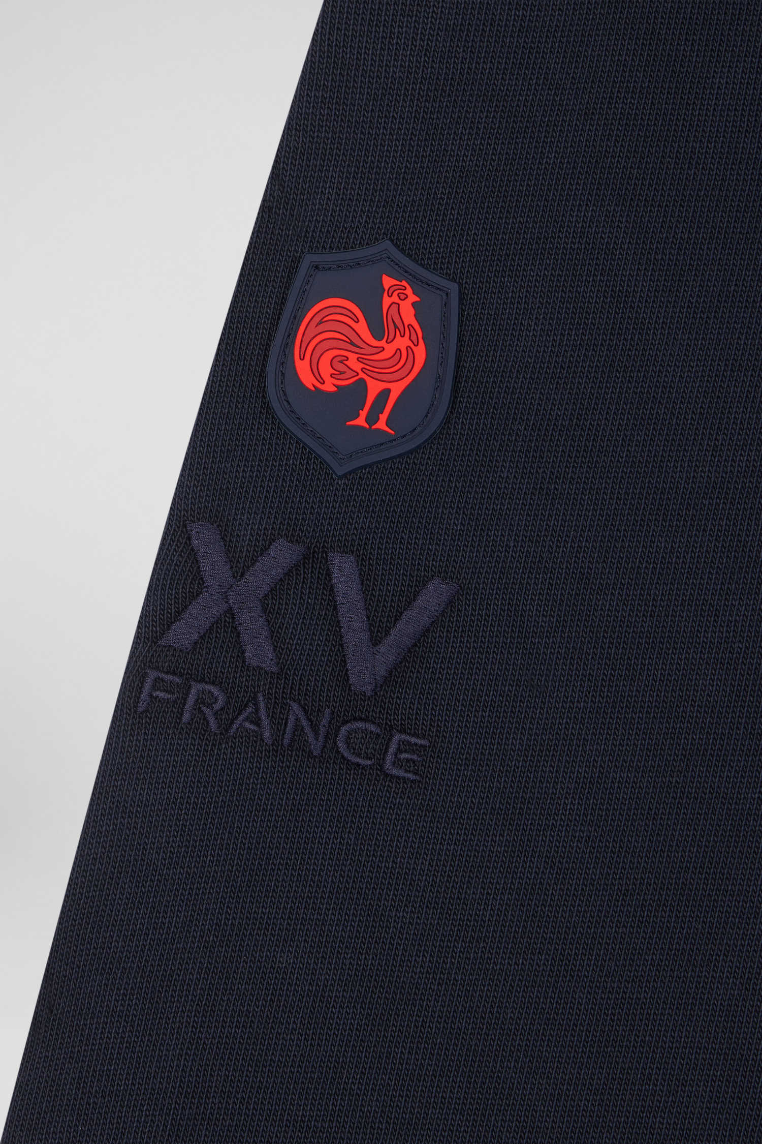 This mottled gray cotton jersey is a unique creation with navy and red sleeves, reflecting a bold, dynamic style. On the back, an application of XV de France tie fabric pays homage to the spirit of national rugby, elegantly blending sport and elegance. This trendy jersey is a must-have for fans and fashion enthusiasts alike, celebrating the union between the XV de France and our House's signature design and meticulous finishing.