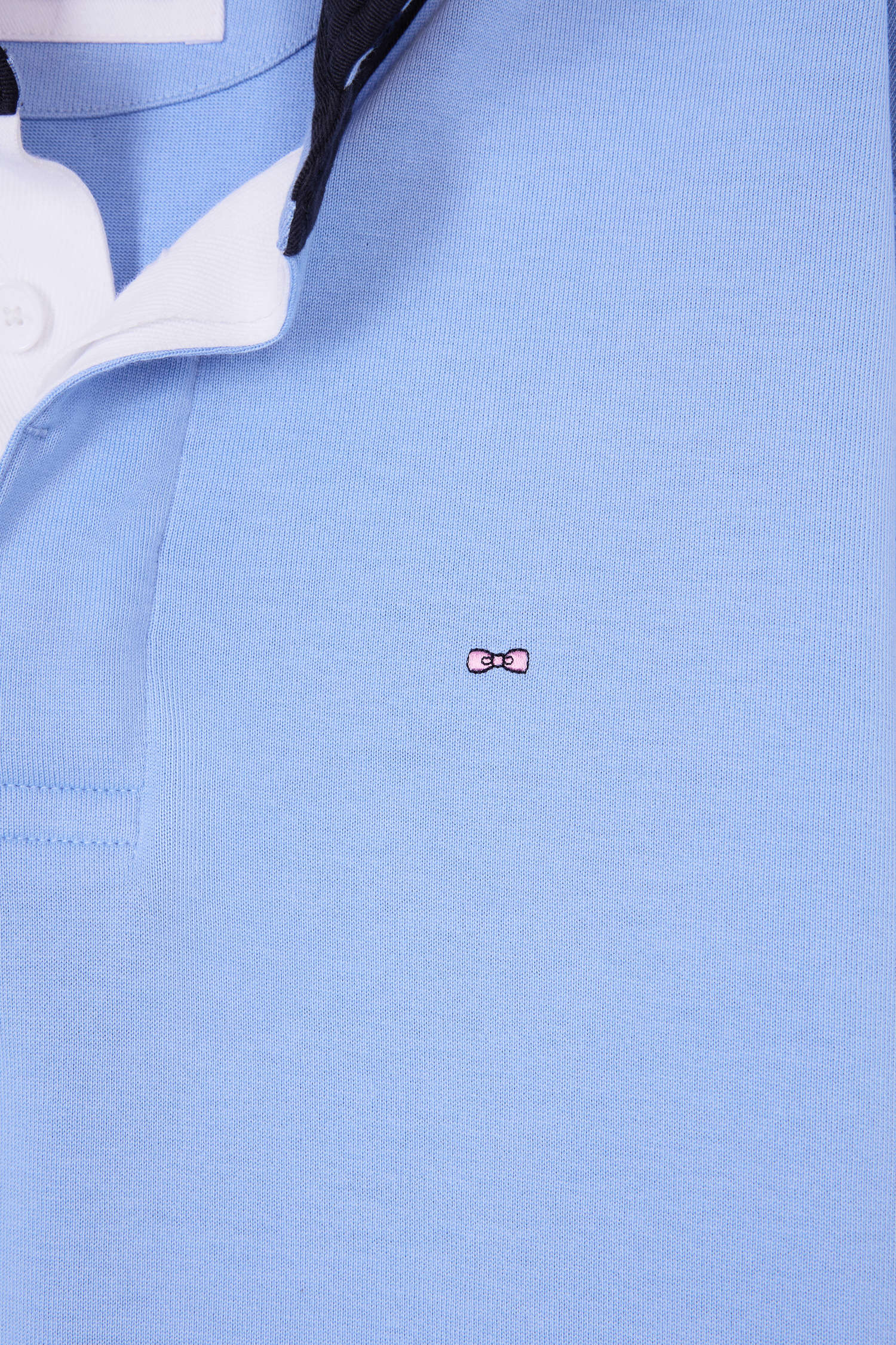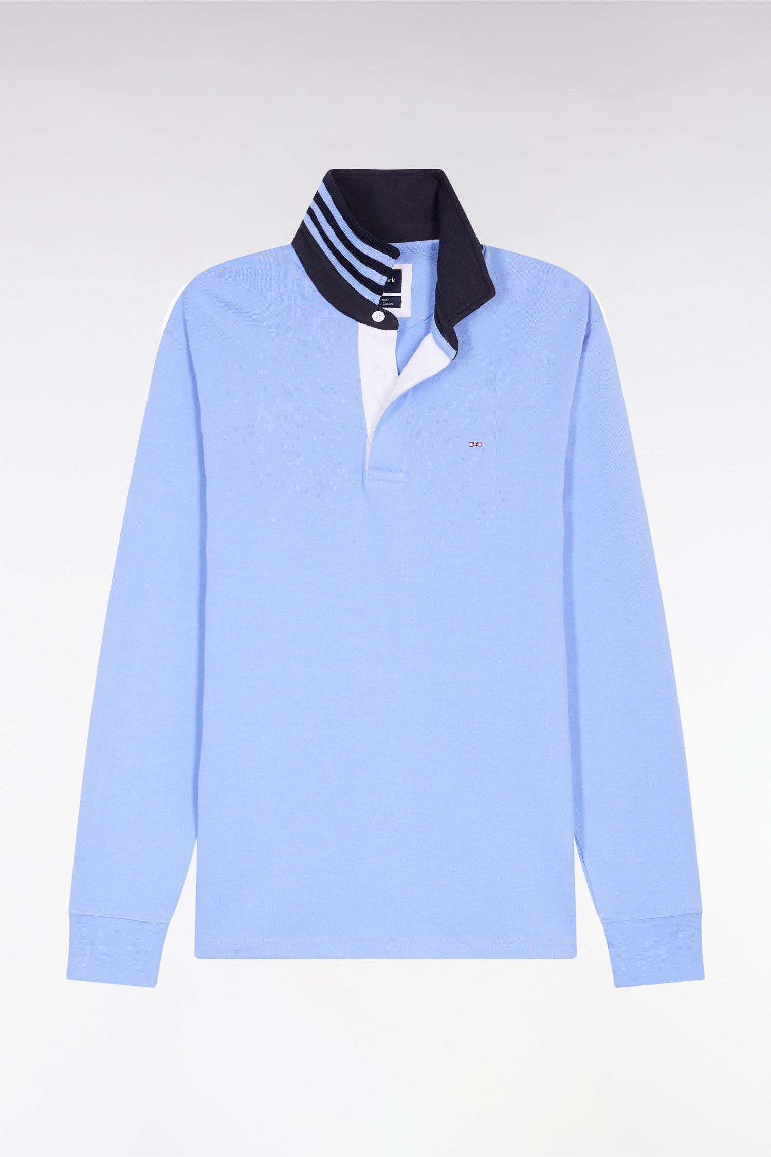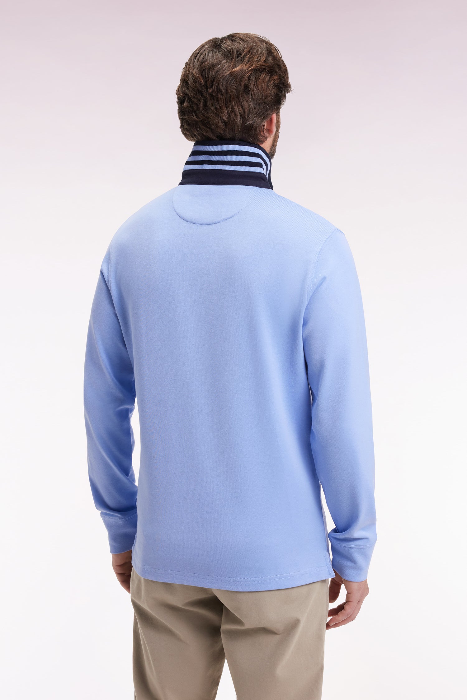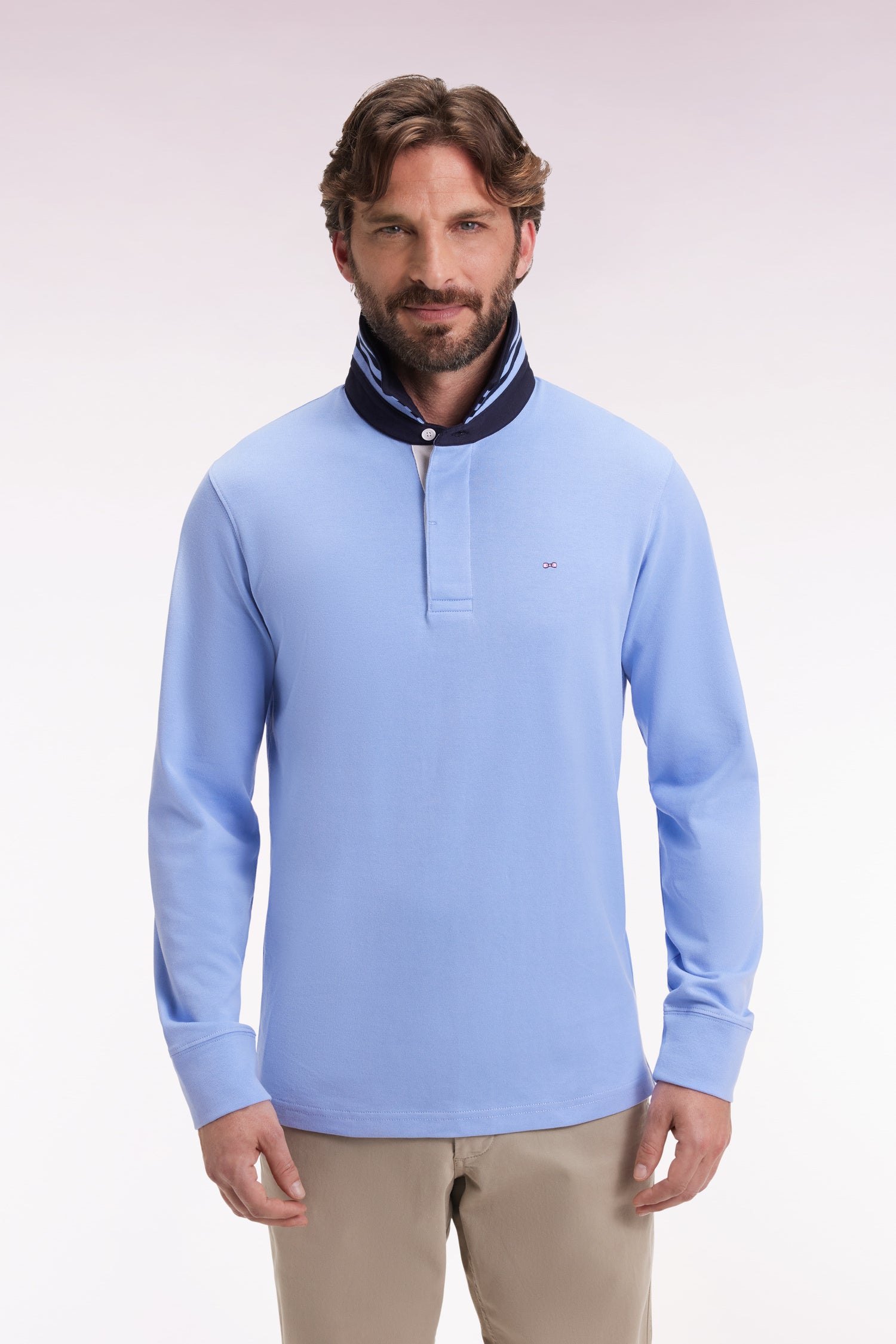 4-thread-count Pima cotton jersey and a straight cut finished with flat-knit ribbing give this long-sleeved jersey a long-lasting fit. The white-lined button placket and navy collar provide an elegant contrast, enhanced by a fine stripe under-collar. A comfortable, timeless sport-chic model designed for the modern man.